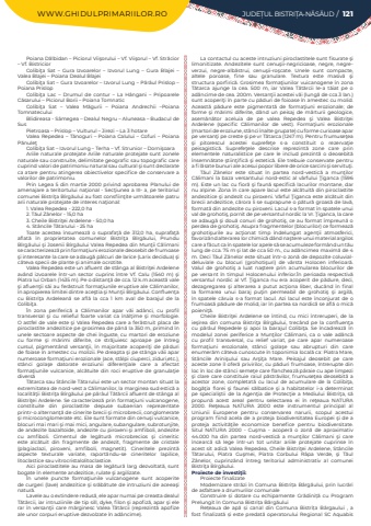 WWW.GHIDULPRIMARIILOR.RO JUDE%u021aUL BISTRI%u021aA-N%u0102S%u0102UD / 121Poiana D%u0103lbidan %u2013 Piciorul Vii%u015forului %u2013 Vf. Vii%u015forul %u2013 Vf. Str%u0103cior %u2013 Vf. BistriciorColibi%u0163a Sat %u2013 Gura Izvoarelor %u2013 Izvorul Lung %u2013 Gura Blajei %u2013 Valea Blajei %u2013 Poiana Dealul BlajeiColibi%u0163a Sat %u2013 Gura Izvoarelor %u2013 Izvorul Lung %u2013 P%u00e2r%u00e2ul Prislop %u2013 Poiana PrislopColibi%u0163a Lac %u2013 Drumul de contur %u2013 La H%u00e2ngani %u2013 Pripoarele C%u0103sarului %u2013 Piciorul Borii %u2013 Poiana TomnaticColibi%u0163a Sat %u2013 Valea M%u0103gurii %u2013 Poiana Andrechii %u2013Poiana TomnateculuiBlidireasa - S%u00e2megea %u2013 Dealul Negru %u2013 Aluneasa %u2013 Budacul de SusPietroasa %u2013 Prislop %u2013 Vulturul %u2013 Jirezi %u2013 La 3 hotareValea Repedea %u2013 T%u0103noguri %u2013 Poiana Calului %u2013 Cofuri %u2013 Poiana P%u0103nule%u0163Colibi%u0163a Sat %u2013 Izvorul Lung %u2013 Terha %u2013 Vf. Strunior %u2013 Dorni%u015foaraAriile naturale protejate Ariile naturale protejate sunt zonele naturale sau construite, delimitate geografic sau topografic care cuprind valori de patrimoniu natural sau cultural %u015fi sunt declarate ca atare pentru atingerea obiectivelor specifice de conservare a valorilor de patrimoniu. Prin Legea 5 din martie 2000 privind aprobarea Planului de amenajare a teritortului na%u0163ional - Sec%u0163iunea a III- a, pe teritoriul comunei Bistri%u0163a B%u00eerg%u0103ului au fost consfiin%u0163ite urm%u0103toarele patru arii naturale protejate de interes na%u0163ional:1. Valea Repedea - 222,0 ha2. T%u0103ul Z%u00e2nelor - 15,0 ha3. Cheile Bistri%u0163ei Ardelene - 50,0 ha4. St%u00e2ncile T%u0103tarului - 25 haToate acestea %u00eensumeaz%u0103 o suprafa%u0163%u0103 de 312,0 ha, suprafa%u0163%u0103 aflat%u0103 %u00een proprietatea comunelor Bistri%u0163a B%u00eerg%u0103ului, Prundu B%u00eerg%u0103ului %u015fi Josenii B%u00eerg%u0103ului Valea Repedea%u00a0din Mun%u0163ii C%u0103limani se caracterizeaz%u0103 prin forma%u0163iuni erozionale deosebit de frumoase %u015fi interesante la care se adaug%u0103 p%u00e2lcuri de larice%u00a0(Larix decidua) %u015fi c%u00e2teva specii de plante %u015fi animale ocrotite.Valea Repedea este un afluent de st%u00e2nga al Bistri%u0163ei Ardelene av%u00e2nd izvoarele %u00eentr-un%u00a0 sector cuprins %u00eentre Vf. Calu (1540 m) %u015fi Piatra lui Orban (1435 m). Pe o distan%u0163%u0103 de cca.%u00a012 k.m aceast%u0103 vale %u015fi afluen%u0163ii s%u0103i au fer%u0103struit forma%u0163iunile eruptive ale C%u0103limanilor, %u00een%u00a0apropierea limitei dintre ace%u015ftia %u015fi Mun%u0163ii B%u00eerg%u0103ului. Confluen%u0163a cu Bistri%u0163a Ardelean%u0103 se%u00a0 afl%u0103 la cca 1 km aval de barajul de la Colibi%u0163a.%u00cen zona periferic%u0103 a C%u0103limanilor apar v%u0103i ad%u00e2nci, cu profil transversal %u015fi cu relieful%u00a0 foarte variat ca %u00een%u0103l%u0163ime %u015fi morfologie. O astfel de vale este %u015fi Valea Repedea care a%u00a0fer%u0103struit placa de piroclastite andezitice pe grosimea de p%u00e2n%u0103 la 350 m, primind %u00een unele%u00a0sectoare aspecte de chei %u00eenguste, cu martori de eroziune cu forme %u015fi m%u0103rimi diferite, ce%u00a0 str%u0103juiesc aproape pe %u00eentreg cursul, pigment%u00e2nd versan%u0163ii, %u00een majoritate acoperi%u0163i de p%u0103duri de foiase %u00een amestec cu molizii.%u00a0Pe dreapta %u015fi pe st%u00e2nga v%u0103ii apar numeroase forma%u0163iuni erozionale (ace, st%u00e2lpi%u00a0ciuperci, ziduri,etc.), st%u00e2nci gola%u015fe datorate eroziunii diferen%u0163iale care a afectat forma%u0163iunile%u00a0 vulcanice, alc%u0103tuite din roci eruptive de granula%u0163ie divers%u0103T%u0103tarca%u00a0sau%u00a0St%u00e2ncile T%u0103tarului%u00a0este un sector montan situat la extremitatea de%u00a0nord-vest a C%u0103limanilor, la marginea sud estic%u0103 a localit%u0103%u0163ii Bistri%u0163a B%u00eerg%u0103ului pe p%u00e2r%u00e2ul%u00a0T%u0103t%u0103rcii afluent de st%u00e2nga al Bistri%u0163ei Ardelene. Se caracterizez%u0103 prin forma%u0163iuni%u00a0vulcanogene, constituite din piroclastite depuse subaerian reprezentate printr-o alternan%u0163%u0103 de%u00a0cinerite brecii %u015fi microbrecii, conglomerate %u015fi microconglomerate etc. Ele sunt formate din cenu%u015fi vulcanice, blocuri mai mari %u015fi mai mici, angulare, subangulare, subrotunjite, de%u00a0andezite bazaltoide, andezite cu piroxeni %u015fi amfiboli, andezite cu amfiboli. Cimentul de%u00a0 leg%u0103tur%u0103 microbrecios %u015fi cineritic este alc%u0103tuit din fragmente de andezit, fragmente de%u00a0 cristale (plagiaclazi, piroxeni, amfiboli, magnetit). Cineritele prezint%u0103 aspecte texturale%u00a0 variate, raport%u00e2ndu-se cineritelor lapilice, litoclastice sau vitrocristalolitoclastice.Aici piroclastitele au masa de leg%u0103tur%u0103 larg dezvoltat%u0103, sunt bogate %u00een elemente%u00a0andezitice, rulate %u015fi argilizate.%u00cen unele puncte forma%u0163iunile vulcanogene sunt acoperite de curgeri (lave)%u00a0andezitice %u015fi sr%u0103b%u0103tute de intruziuni de aceea%u015fi natur%u0103.Lavele au o extindere redus%u0103, ele apar numai pe creasta dealul T%u0103t%u0103rcii, iar%u00a0intruziinile de tip sill, dyke, filon %u015fi apofiz%u0103, apar %u015fi ele rar %u00een versan%u0163ii care m%u0103rginesc%u00a0Valea T%u0103t%u0103rcii (reprezint%u0103 apofize ale unor corpuri eruptive dezvolzate %u00een ad%u00e2ncime).La contactul cu aceste intruziuni piroclastitele sunt fisurate %u015fi limonitizate.%u00a0 Andezitele sunt cenu%u015fii-negricioase, negre, negreverzui, negre-alb%u0103strui, cenu%u015fii-ro%u015fcate.%u00a0 Unele sunt compacte, altele poroase, fine sau granulare. Textura este masiv%u0103 %u015fi structura%u00a0porfiric%u0103.%u00a0Grosimea forma%u0163iunilor vuicanogene %u00een zona T%u0103tarca ajunge la cea. 500 m, iar%u00a0 Valea T%u0103t%u0103rcii le-a t%u0103iat pe o ad%u00e2ncime de cea. 2