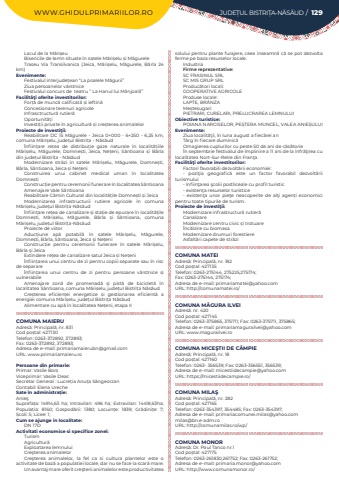 WWW.GHIDULPRIMARIILOR.RO JUDE%u021aUL BISTRI%u021aA-N%u0102S%u0102UD / 129Lacul de la M%u0103ri%u0219euBisericile de lemn situate %u00een satele M%u0103ri%u0219elu %u0219i M%u0103gureleTraseu Via Transilvanica (Jeica, M%u0103ri%u0219elu, M%u0103gurele, B%u00e2rla 24 km)Evenimente:Festivalul interjude%u021bean %u201cLa poalele M%u0103gurii%u201dZiua persoanelor v%u00e2rstniceFestivalul concurs de%u00a0 teatru %u201d La Hanul lui M%u00e2njoal%u0103%u201dFacilit%u00e3%u0163i oferite investitorilor:For%u021b%u0103 de munc%u0103 calificat%u0103 %u0219i ieftin%u0103Concesionare terenuri agricoleInfrasctructur%u0103 rutier%u0103Oportunit%u0103%u021biInvesti%u021bii private %u00een agricultur%u0103 %u0219i cre%u0219terea animalelorProiecte de investi%u0163ii:Reabilitare DC 15 M%u0103gurele - Jeica 0+000 - 6+250 - 6,25 km, comuna M%u0103ri%u0219elu, jude%u021bul Bistri%u021ba - N%u0103s%u0103ud%u00cenfiin%u021bare re%u021bea de distribu%u021bie gaze naturale %u00een localit%u0103%u021biile M%u0103ri%u0219elu, M%u0103gurele, Domne%u0219ti, Jeica, Ne%u021beni, S%u00e2ntioana %u0219i B%u00e2rla din jude%u021bul Bistri%u021ba - N%u0103s%u0103ud Modernizare str%u0103zi %u00een satele M%u0103ri%u0219elu, M%u0103gurele, Domne%u0219ti, B%u00e2rla, S%u00e2ntioana, Jeica %u0219i Ne%u021beniConstruirea unui cabinet medical uman %u00een localitatea Domne%u0219tiConstruc%u021bie pentru ceremonii funerare %u00een localitatea S%u00e2ntioanaAmenajare Vale S%u00e2ntioanaReabilitare C%u0103min Cultural din localit%u0103%u021bile Domne%u0219ti %u0219i JeicaModernizarea infrastructurii rutiere agricole %u00een comuna M%u0103ri%u0219elu, jude%u021bul Bistri%u021ba-N%u0103s%u0103ud%u00cenfiin%u021bare re%u021bea de canalizare %u0219i sta%u021bie de epurare %u00een localit%u0103%u021bile Domne%u0219ti, M%u0103ri%u0219elu, M%u0103gurele, B%u00e2rla %u0219i S%u00e2ntioana, comuna M%u0103ri%u0219elu, jude%u021bul Bistri%u021ba-N%u0103s%u0103udProiecte de viitorAduc%u021biune ap%u0103 potabil%u0103 %u00een satele M%u0103ri%u0219elu, M%u0103gurele, Domne%u0219ti, B%u00e2rla, S%u00e2ntioana, Jeica %u0219i Ne%u021beniConstruc%u021bie pentru ceremonii funerare %u00een satele M%u0103ri%u0219elu, B%u00e2rla %u0219i JeicaExtindere re%u021bea de canalizare satul Jeica %u0219i Ne%u021beni%u00cenfiin%u021barea unui centru de zi pentru copiii separate sau %u00een risc de separare%u00cenfiin%u021barea unui centru de zi pentru persoane v%u00e2rstnice %u0219i vulnerabileAmenajare zon%u0103 de promenad%u0103 %u0219i pist%u0103%u00a0 de biciclet%u0103 %u00een localitatea S%u00e2ntioana, comuna M%u0103ri%u0219elu, jude%u021bul Bistri%u021ba N%u0103s%u0103udCre%u0219terea eficien%u021bei energetice %u0219i gestionarea eficient%u0103 a energiei comuna M%u0103ri%u0219elu, jude%u021bul Bistri%u021ba N%u0103s%u0103udAlimentare cu ap%u0103 %u00een localitatea Ne%u021beni, etapa IICOMUNA MAIERUAdres%u0103: Principal%u0103, nr. 831Cod po%u0219tal: 427130Telefon: 0263-372892, 372893; Fax: 0263-372892, 372893; Adresa de e-mail: primariamaierubn@gmail.comURL: www.primariamaieru.roPersoane din primarie:Primar: Vasile Bor%u0219Viceprimar: Vasile DeacSecretar General : Lucre%u021bia Anu%u021ba S%u00e2ngeorzanContabil: Elena UrecheSate %u00een administra%u021bie:Anie%u015fSuprafa%u021ba:%u00a0 14914,63 ha; Intravilan:%u00a0 496 ha; Extravilan:%u00a0 14418,63ha; Popula%u021bia:%u00a0 8160; Gospod%u0103rii:%u00a0 1380; Locuin%u021be:%u00a0 1839; Gr%u0103dini%u021be:%u00a0 7; %u0218coli:%u00a05; Licee:%u00a01; Cum se ajunge in localitate:DN 17DActivitati economice si specifice zonei:TurismAgricultur%u0103Exploatarea lemnului Cre%u015fterea animalelorCre%u015fterea animalelor, la fel ca si cultura plantelor este o activitate de baz%u0103 a populatiei locale, dar nu se face la scar%u0103 mare.Un avantaj mare oferit cre%u015fterii animalelor este productivitatea solului pentru plante furajere, ceea %u00eenseamn%u0103 c%u0103 se pot dezvolta ferme pe baza resurselor locale.%u00a0Industria%u00a0Firme reprezentative:SC FRASINUL SRLSC MIS GRUP SRLProduc%u0103tori locali:COOPERATIVE AGRICOLEProduse locale:LAPTE, BR%u00c2NZAMe%u0219te%u0219ugari: PIETRARI, CURELARI, PRELUCRAREA LEMNULUIObiective turistice:POIANA NARCISELOR, PE%u0218TERA MUNCEL, VALEA ANIE%u0218ULUIEvenimente:Ziua localit%u0103%u0163ii, %u00een luna august a fiec%u0103rei anT%u00e2rg %u00een fiecare duminic%u0103Omagierea cuplurilor cu peste 50 de ani de c%u0103s%u0103torie%u00cen septembrie festivalul de %u00eemplinire a 11%u00a0ani de la %u00eenfr%u0103%u0163irea cu localitatea Nort-Sur-Relre din Fran%u0163a.Facilit%u00e3%u0163i oferite investitorilor:Factori favorabili dezvolt%u0103rii economiei:- pozi%u0163ia geografic%u0103 este un factor favorabil dezvolt%u0103rii turismului%u00a0- %u00eenfiin%u0163area %u015fcolii postliceale cu profil turistic - existen%u0163a resurselor turistice - existen%u0163a unor pie%u0163e neacoperite de al%u0163i agen%u021bi economici pentru toate tipurile de turism.Proiecte de investi%u0163ii:Modernizare infrastructur%u0103%u00a0rutier%u0103CanalizareModernizare centru civic %u0219i trotuare%u00cenc%u0103lzire cu biomasaModernizare drumuri forestiereAsfalt%u0103ri capete de str%u0103ziCOMUNA MATEIAdres%u0103: Principal%u0103, nr. 182Cod po%u0219tal: 427135Telefon: 0263-275144, 275225,275174; Fax: 0263-275144, 275174; Adresa de e-mail: primariamatei@yahoo.comURL: http://comunamatei.ro/COMUNA M%u0102GURA ILVEIAdres%u0103: nr. 420Cod po%u0219tal: 427145Telefon: 0263-375865, 375711; Fax: 0263-375711, 375865; Adresa de e-mail: primariamagurailvei@yahoo.comURL: www.magurailvei.roCOMUNA MICE%u015eTII DE C%u00c2MPIEAdres%u0103: Principal%u0103, nr. 18Cod po%u0219tal: 427160Telefon: 0263- 356539; Fax: 0263-356551, 356539; Adresa de e-mail: micestiidecampie@yahoo.comURL: https://micestiidecampie.ro/COMUNA MILA%u015eAdres%u0103: Principal%u0103, nr. 282Cod po%u0219tal: 427165Telefon: 0263-354397, 354485; Fax: 0263-354397; Adresa de e-mail: primariacomunei.milas@yahoo.commilas@b