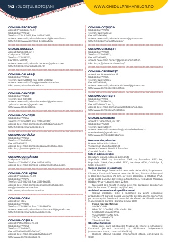 142 / JUDE%u021aUL BOTO%u0218ANI WWW.GHIDULPRIMARIILOR.ROCOMUNA BROSC%u0102U%u0162IAdres%u0103: Principal%u0103, nr. FNCod po%u0219tal: 717040Telefon: 0231- 621621; Fax: 0231-621621; Adresa de e-mail: primariabroscauti@hotmail.comURL: https://www.primaria-broscauti.ro/ORA%u0218UL BUCECEAAdres%u0103: Na%u0163ional%u0103, nr. 1Cod po%u0219tal: 717045Telefon: 0231-550112; Fax: 0231- 550123; Adresa de e-mail: primaria.bucecea@yahoo.comURL: https://primariabucecea.ro/COMUNA C%u0102L%u0102RA%u015eICod po%u0219tal: 717050Telefon: 0231-548902; Fax: 0231-548802; Adresa de e-mail: office@primariacalarasi.roURL: www.primariacalarasibt.roCOMUNA C%u00c2NDE%u015eTICod po%u0219tal: 717262Telefon: 0331-594183; Adresa de e-mail: primariacandesti@yahoo.com primariacandesti@gmail.comURL: www.candestibt.roCOMUNA CONCE%u015eTICod po%u0219tal: 717055Telefon: 0231-551382; Fax: 0231-551382; Adresa de e-mail: primariaconcesti@yahoo.comURL: https://primariaconcesti.roCOMUNA COP%u0102L%u0102UCod po%u0219tal: 717060Telefon: 0231-619302; Fax: 0231-619307; Adresa de e-mail: primariacopalau@yahoo.comURL: http://www.copalau.ro/COMUNA CORD%u0102RENICod po%u0219tal: 717070Telefon: 0231-624120; Fax: 0231-624120; Adresa de e-mail: primaria_cordareni@yahoo.comCOMUNA CORL%u0102%u0162ENIAdres%u0103: Principal%u0103, nr. 59Cod po%u0219tal: 717075Telefon: 0331-560155; Fax: 0331-560155; Adresa de e-mail: primariacorlateni@yahoo.comuat@primaria-corlateni.roURL: www.primaria-corlateni.roCOMUNA CORNIAdres%u0103: nr. 1304Cod po%u0219tal: 717085Telefon: 0231-588110; Fax: 0231-588370; Adresa de e-mail: primariacornibotosani1@gmail.comURL: https://primariacomuneicorni.ro/COMUNA CO%u015eULAAdres%u0103: Petru Rare%u015f, nr. 30Cod po%u0219tal: 717063Telefon: 0231-619411; Fax: 0231-619411,0331-780047; Adresa de e-mail: cosulap@yahoo.comURL: www.primariacosula.roCOMUNA CO%u0162U%u015eCACod po%u0219tal: 717090Telefon: 0231-561946; Fax: 0231-561936; Adresa de e-mail: primariacotusca@yahoo.comURL: http://primariacotusca.ro/COMUNA CRISTE%u015eTICod po%u0219tal: 717100Telefon: 0231-619912; Fax: 0231-619912; Adresa de e-mail: ontact@primariacristesti.roURL: https://primariacristesti.ro/COMUNA CRISTINE%u015eTIAdres%u0103: str. Primariei nr.25Cod po%u0219tal: 717105Telefon: 0231-619104; Fax: 0231-619149; Adresa de e-mail: primariacristinesti@yahoo.comURL: www.primariacristinesti.roCOMUNA CURTE%u015eTICod po%u0219tal: 717110Telefon: 0231-584001,; Fax: 0231-584001 int. 0; Adresa de e-mail: primaria.curtesti@yahoo.comURL: www.primariacurtestibt.roORA%u0218UL DARABANIAdres%u0103: 1 Decembrie, nr. 100Cod po%u0219tal: 715100Telefon: 0231-631347; Adresa de e-mail: secretariat@primariadarabani.roorasdarabani@gmail.comURL: www.primariadarabani.roPersoane din primarie:Primar:%u00a0Mihai Alin%u00a0G%u00eerbaciViceprimar: Dumitru%u00a0D%u0103nil%u0103Secretar General:%u00a0Paulic%u0103%u00a0ZaharieaContabil: Dorica%u00a0%u00a0BozSate %u00een administra%u021bie:Darabani, Bajura, E%u015fanca, Lism%u0103ni%u0163aSuprafa%u021ba:%u00a0 9985 ha; Intravilan:%u00a0 1263 ha; Extravilan:%u00a0 8722 ha; Popula%u021bia:%u00a0 11948; Gospod%u0103rii:%u00a0 5530; Locuin%u021be:%u00a0 4330; Gr%u0103dini%u021be:%u00a0 3; %u0218coli:%u00a04; Licee:%u00a01; Cum se ajunge in localitate:DN 29A leag%u0103 Darabaniul de o serie de localit%u0103%u021bi importante. Distan%u021ba Darabani-Dorohoi este de 36 km, Darabani-Boto%u0219ani %u0219i Darabani-Suceava 70 km, iar %u00eentre Darabani %u0219i R%u0103d%u0103u%u021bi-Prut, unde exist%u0103 punctul de trecere a frontierei cu Republica Moldova R%u0103d%u0103u%u021bi-Prut %u2013 Lipcani, sunt 22 km. Nu exist%u0103 cale ferat%u0103 %u00een zon%u0103, cele mai apropiate aeroporturi fiind la Suceava (70 km) %u0219i Ia%u0219i (200 km).Activitati economice si specifice zonei:Ora%u0219ul Darabani este o localitate cu profil economic preponderent agricol. Exist%u0103 un num%u0103r de 806 agen%u021bi economici pe raza ora%u0219ului Darabani, cu o cifr%u0103 de afaceri de 221 milioane lei (44,5 milioane euro) la sf%u00e2r%u0219itul anului 2021.Firme reprezentative:SAGROD SRLPRACTIC COMER%u021a STRUGARU SRLMOBILIER DELAGRAVEVLADIGOR TRANS SRLTEXTY GARMENTSTRANSGHE SRLObiective turistice:Casa Bal%u0219 , care g%u0103zduie%u0219te Muzeul de Istorie %u0219i Etnografie Darabani (Muzeul Nordului) %u0219i Biblioteca Or%u0103%u0219eneasc%u0103 (monument istoric, construit%u0103 %u00een 1824)Biserica Sf%u00e2ntul Nicolae (monument istoric, construit%u0103 %u00een 1840)
