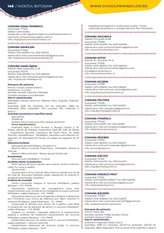 148 / JUDE%u021aUL BOTO%u0218ANI WWW.GHIDULPRIMARIILOR.ROCOMUNA MIHAI EMINESCUCod po%u0219tal: 717253Telefon: 0231-512183; Adresa de e-mail: registratura@comunamihaieminescu.rostarecivila_mihaieminescu@bt.e-adm.roURL: https://comunamihaieminescu.ro/COMUNA MIH%u0102ILENICod po%u0219tal: 717260Telefon: 0231-625103; Fax: 0231-625103; Adresa de e-mail: primariamihailenibt@yahoo.comURL: https://www.primariamihailenibt.ro/COMUNA MIH%u0102L%u0102%u015eENIAdres%u0103: Calea Na%u0163ional%u0103, nr.23Cod po%u0219tal: 717270Telefon: 0231-566108; Fax: 0231-566108; Adresa de e-mail: mihalaseniprimaria@yahoo.comURL: http://www.mihalaseni.ro/Persoane din primarie:Primar: Claudiu Daniel%u00a0Chelariu%u00a0Viceprimar:%u00a0Liviu%u00a0EduSecretar General: Gabriela%u00a0Gheorghe%u00a0Contabil: Nicoleta-Crina%u00a0Botezatu%u00a0Sate %u00een administra%u021bie:Mih%u0103l%u0103%u015feni, S%u0103rata, Caraiman, N%u0103stase, P%u0103un, Negre%u015fti, SloboziaSili%u015fcaniSuprafa%u021ba:%u00a0 6329 ha; Intravilan:%u00a0 371 ha; Extravilan:%u00a0 5958 ha; Popula%u021bia:%u00a0 2592; Gospod%u0103rii:%u00a0 1127; Locuin%u021be:%u00a0 967; Gr%u0103dini%u021be:%u00a0 4; %u0218coli:%u00a05; Activitati economice si specifice zonei:Agricultur%u0103ZootehniePrest%u0103ri servicii (mori porumb, fier%u0103rie, lemn%u0103rie)Firme reprezentative:Andru%u0219c%u0103 Radu II, Ionel Nicu%u0219or II, Buraga Ciprian II, SC Zoveg, V%u0103cu%u021ba de N%u0103stase Cooperativa Agricol%u0103, Oi%u021ba de S%u0103rata %u2013 Cooperativa Agricol%u0103, Cresc%u0103torii de Ovine P%u0103un, SC Valea P%u0103unilor, Agrisebemara %u2013 Mih%u0103l%u0103%u0219eni, Asocia%u021bia Lacto Sili%u0219cani, SC Agromer, SC Stoeneasa, SC Ponelu, SC Adige, SC Agripolis, SC 07 CCC%u00a0Obiective turistice:Necropola de la Mih%u0103l%u0103%u015feni, secolele IV-VBiserica Sf%u00e2nta Cuvioasa Parascheva - Mih%u0103l%u0103%u015feni, secolul al XVIII-leaBiserica Sf%u00e2ntul Nicolae - S%u0103rata, secolul al XVIII-leaEvenimente:Ziua comunei Mih%u0103l%u0103%u0219eni- 1-2 IunieFacilit%u00e3%u0163i oferite investitorilor:Teren agricol de bun%u0103 calitate; ap%u0103 curent%u0103; acces la internet, cablu TV, acces la telefonOportunit%u0103%u021biPozi%u0163ionarea la 10 km fa%u0163%u0103 de Vama St%u00e2nca Coste%u015fti %u015fi la 45 de km fa%u0163%u0103 de Municipiul Boto%u015fani poate reprezenta un avantaj %u00een atragerea poten%u0163ialilor investitoriProiecte de investi%u0163ii:Centru comunitar integrat %u00een comuna Mih%u0103l%u0103%u0219eni, jude%u021bul Boto%u0219ani %u2013 C12 - PNRRDezvoltarea sistemului de management local prin implementarea unor infrastructuri inteligente la nivelul comunei Mih%u0103l%u0103%u0219eni, jude%u021bul Boto%u0219ani %u2013 C10 - PNRRDezvoltarea sistemului de management integrat al de%u0219eurilor prin %u00eenfiin%u021barea unui centru de colectare prin aport voluntar %u00een comuna Mih%u0103l%u0103%u0219eni, jude%u021bul Boto%u0219ani %u2013 C3 - PNRRConstruirea %u0219i dotarea unui centru de zi pentru copii afla%u021bi %u00een situa%u021bie de risc de separare de p%u0103rin%u021bi %u00een comuna Mih%u0103l%u0103%u0219eni, jude%u021bul Boto%u0219ani %u2013 C13 -PNRRDotarea cu mobilier, materiale didactice %u0219i echipamente digitale a unit%u0103%u021bilor de %u00eenv%u0103%u021b%u0103m%u00e2nt preuniversitar din comuna Mih%u0103l%u0103%u0219eni, jude%u021bul Boto%u0219ani %u2013 C15 -PNRRModernizare drumuri de interes local %u00een comuna Mih%u0103l%u0103%u0219eni, jude%u021bul Boto%u0219ani %u2013 ANGHEL SALYGNIModernizarea sistemului de iluminat public %u00een comuna Mih%u0103l%u0103%u0219eni, jude%u021bul Boto%u0219ani - AFMReabilitare energetic%u0103 %u0219i modernizare %u0219coal%u0103 %u2013 POOR Capacit%u0103%u021bi de producer a energiei electrice Parc fotovoltaicCOMUNA MILEANCAAdres%u0103: Principal%u0103 Nr.88Cod po%u0219tal: 717280Telefon: 0231-624635; Fax: 0231-624696; Adresa de e-mail: primariamileanca@yahoo.comURL: www.primariamileanca.roCOMUNA MITOCAdres%u0103: Str. Prim%u0103riei, Nr. 6Cod po%u0219tal: 717285Telefon: 0231-562020; Fax: 0231-562020; Adresa de e-mail: primariamitoc@yahoo.comemail@primariamitoc.roURL: www.primariamitoc.roCOMUNA NIC%u015eENICod po%u0219tal: 717290Telefon: 0231-539530; Fax: 0231-539530; Adresa de e-mail: primaria_nicseni@yahoo.comURL: http://www.primarianicseni.ro/COMUNA P%u0102LTINI%u015eCod po%u0219tal: 717295Telefon: 0231-622103; Fax: 0231-622322; Adresa de e-mail: uatpaltinis@gmail.comURL: http://primariapaltinisbt.ro/COMUNA POM%u00c2RLACod po%u0219tal: 717300Telefon: 0231-622811; Fax: 0231-622811; Adresa de e-mail: primariapomirla@yahoo.comURL: https://www.pomarla.ro/COMUNA PR%u0102JENICod po%u0219tal: 717305Telefon: 0231-553010; Fax: 0231-553010; Adresa de e-mail: primariaprajeni@yahoo.comURL: primariaprajeni.roCOMUNA R%u0102CHI%u0162ICod po%u0219tal: 717310Telefon: 0231-544210; Fax: 0231-544210; Adresa de e-mail: primaria.rachiti@gmail.comURL: http://primariarachiti.ro/COMUNA R%u0102D%u0102U%u0162I-PRUTCod po%u0219tal: 717315Telefon: 0231-622533, 622607; Fax: 0231-622533; Adresa de e-mail: primariarprut@yahoo.comURL: https://radautiprut.ro/COMUNA R%u0102USENICod po%u0219tal: 717320Telefon: 0231-548220; Fax: 0231-548137; Adresa de e-mail: primariarauseni2017@gmail.comURL: https://rausenibt.ro/contact/Persoane din primarie:Primar: Maria J%u00eej%u00eeeSecretar General: T%u0103r%u00e2%u0163%u0103 Nicoleta FeliciaContabil: Voiniciuc MihaiSate %u00een administra%u021bie:Stolniceni, Pogorasti, Rediu, DoinaSuprafa%u021ba:%u00a0 5099 ha; Intravilan:%u00a0 427,33 ha; Extravilan:%u00a0 4671,67 ha; Popula%u021bia:%u00a02850; Gospod%u0103rii:%u00a01176; Locuin%u021be:%u00a01510; Gr%u0103dini%u021be:%u00a03; %u0218coli:%u00a05;
