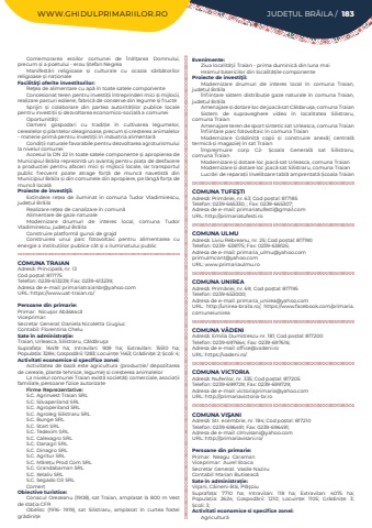 WWW.GHIDULPRIMARIILOR.RO JUDE%u021aUL BR%u0102ILA / 183Comemorarea eroilor comunei de %u00cen%u0103l%u021barea Domnului, precum %u0219i a poetului - erou %u0218tefan Negrea Manifest%u0103ri religioase %u0219i culturale cu ocazia s%u0103rb%u0103torilor religioase %u0219i na%u021bionaleFacilit%u00e3%u0163i oferite investitorilor:Re%u0163ea de alimentare cu ap%u0103 %u00een toate satele componenteConcesionat teren pentru investi%u021bii %u00eentreprinderi mici %u0219i mijlocii, realizare parcuri eoliene, fabric%u0103 de conserve din legume %u0219i fructeSprijin %u0219i colaborare din partea autorit%u0103%u021bilor publice locale pentru investi%u021bii %u0219i dezvoltarea economico-social%u0103 a comuneiOportunit%u0103%u021bi:Oameni gospodari cu tradi%u021bie %u00een cultivarea legumelor, cerealelor %u0219i plantelor oleaginoase, precum %u0219i cre%u0219terea animalelor - materie prim%u0103 pentru investi%u021bii %u00een industria alimentar%u0103Condi%u021bii naturale favorabile pentru dezvoltarea agroturismului la nivelul comuneiAccesul la DN 22 %u00een toate satele componente %u0219i apropierea de Municipiul Br%u0103ila reprezint%u0103 un avantaj pentru pia%u021ba de desfacere a produc%u021biei pentru afaceri mici %u0219i mijlocii locale, iar transportul public frecvent poate atrage for%u021b%u0103 de munc%u0103 navetist%u0103 din Municipiul Br%u0103ila %u0219i din comunele din apropiere, pe l%u00e2ng%u0103 for%u021ba de munc%u0103 local%u0103Proiecte de investi%u0163ii:Extindere re%u021bea de iluminat %u00een comuna Tudor Vladimirescu, jude%u021bul%u00a0Br%u0103ilaRealizare re%u021bea de canalizare %u00een comun%u0103Alimentare de gaze naturaleModernizare drumuri de interes local, comuna Tudor Vladimirescu, jude%u021bul Br%u0103ilaConstruire platform%u0103 gunoi de grajdConstruirea unui parc fotovoltaic pentru alimentarea cu energie a institu%u021biilor publice c%u00e2t %u0219i a iluminatului%u00a0publicCOMUNA TRAIANAdres%u0103: Principal%u0103, nr. 13Cod po%u0219tal: 817175Telefon: 0239-613239; Fax: 0239-613239; Adresa de e-mail: primariatraianbr@yahoo.comURL: https://www.uat-traian.ro/Persoane din primarie:Primar:%u00a0 Nicu%u015for%u00a0Ab%u0103seac%u0103%u00a0Viceprimar:%u00a0Secretar General: Daniela Nicoletta%u00a0Giugiuc%u00a0Contabil: Florentina%u00a0CheluSate %u00een administra%u021bie:Traian, Urleasca, Silistraru, C%u0103ld%u0103ru%u015faSuprafa%u021ba:%u00a0 16419 ha; Intravilan:%u00a0 909 ha; Extravilan:%u00a0 15510 ha; Popula%u021bia:%u00a03284; Gospod%u0103rii:%u00a01283; Locuin%u021be:%u00a01463; Gr%u0103dini%u021be:%u00a02; %u0218coli:%u00a04; Activitati economice si specifice zonei:Activitatea de baz%u0103 este agricultura (produc%u021bie/ depozitarea de cereale, plante tehnice, legume) %u0219i cre%u0219terea animalelorLa nivelul comunei Traian exist%u0103 societ%u0103%u021bi comerciale, asocia%u021bii familiale, persoane fizice autorizateFirme Reprezentative:S.C. Agrinvest Traian SRLS.C. Silvaperiland SRLS.C. Agroperiland SRLS.C.%u00a0Agroleg%u00a0Silistraru SRLS.C. Bunge SRLS.C. Start SRLS.C. Tedexim SRLS.C. Calexagro SRLS.C. Danagri SRLS.C. Dinagro SRLS.C. Agritur SRLS.C. M%u0103re%u021bu Prod Com SRLS.C. Grandabaman SRLS.C. Xelaliv SRLS.C. Segado Oil SRLComer%u021bObiective turistice:Conacul Orezeanu (1908), sat Traian, amplasat la 800 m Vest de sta%u021bia CFR Obelisc (1916- 1919), sat Silistraru, amplasat %u00een curtea fostei gr%u0103dini%u021beEvenimente:Ziua localit%u0103%u0163ii Traian - prima duminic%u0103 din luna maiHramul bisericilor din localit%u0103%u021bile componenteProiecte de investi%u0163ii:Modernizare drumuri de interes local %u00een comuna Traian, jude%u021bul Br%u0103ila%u00cenfiin%u021bare sistem distribu%u021bie gaze naturale %u00een comuna Traian, jude%u021bul Br%u0103ilaAmenajare %u0219i dotare loc de joac%u0103%u00a0sat C%u0103ldaru%u0219a, comuna%u00a0TraianSistem de supraveghere video %u00een localitatea Silistraru, comuna%u00a0TraianAmenajare teren de sport sintetic sat Urleasca, comuna%u00a0Traian%u00cenfiin%u021bare parc fotovoltaic %u00een comuna%u00a0Traian Modernizare Gr%u0103dini%u021b%u0103%u00a0 copii %u0219i construire anex%u0103( central%u0103 termic%u0103%u00a0%u0219i magazie) %u00een sat Traian%u00cemprejmuire corp C2- %u0218coala General%u0103%u00a0 sat Silistraru, comuna%u00a0TraianModernizare %u0219i dotare loc joac%u0103%u00a0sat Urleasca, comuna%u00a0TraianModernizare %u0219i dotare loc joac%u0103%u00a0sat Silistraru, comuna%u00a0TraianLucr%u0103ri de repara%u021bii %u00eenvelitoare tabl%u0103%u00a0amprentat%u0103%u00a0%u0218coala Traian COMUNA TUFE%u015eTIAdres%u0103: Prim%u0103riei, nr. 63; Cod po%u0219tal: 817185Telefon: 0239-665330, ; Fax: 0239-665307; Adresa de e-mail: primariatufesti@gmail.comURL: http://primariatufesti.roCOMUNA ULMUAdres%u0103: Liviu Rebreanu, nr. 25; Cod po%u0219tal: 817190Telefon: 0239- 638175; Fax: 0239-638125; Adresa de e-mail: primaria_ulmu@yahoo.comprimulmcont@yahoo.comURL: www.primariaulmu.roCOMUNA UNIREAAdres%u0103: Prim%u0103riei, nr. 69; Cod po%u0219tal: 817195Telefon: 0239-653000; Adresa de e-mail: primaria_unirea@yahoo.comURL: http://unirea-braila.ro/, https://www.facebook.com/primaria.comuneiunireaCOMUNA V%u0102DENIAdres%u0103: Emilia Dumitrescu nr. 181; Cod po%u0219tal: 817200Telefon: 0239-697664; Fax: 0239-697616; Adresa de e-mail: office@vadeni.roURL: https://vadeni.ro/COMUNA VICTORIAAdres%u0103: Nuferilor, nr. 335; Cod po%u0219tal: 817205Telefon: 0239-699729; Fax: 0239-699729; Adresa de e-mail: victoriaprimaria@yahoo.comURL: http://primariavictoria-br.roCOMUNA VI%u015eANIAdres%u0103: Str. ecembrie, nr. 184; Cod po%u0219tal: 817210Telefon: 0239-696491; Fax: 0239-696491; Adresa de e-mail: clmvisani@yahoo.comURL: http://primariavisani.ro/Persoane din primarie:Primar:%u00a0 Neagu%u00a0%u00a0Caraman%u00a0Viceprimar:%u00a0 Aurel%u00a0StoicaSecretar General:%u00a0 Vasile%u00a0NaziruContabil: Marian%u00a0Butiseac%u0103Sate %u00een administra%u021bie:Vi%u015fani, C%u00e2ineni-B%u0103i, Pl%u01
