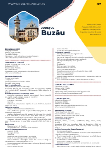 WWW.GHIDULPRIMARIILOR.RO 187Suprafa%u021b%u0103: 6.103 km%u00b2Popula%u021bie: 508.459 locuitoriRe%u0219edin%u021b%u0103 de jude%u021b: Buz%u0103uPopula%u021bia re%u0219edin%u021bei de jude%u021b: 149.025 locuitoriJUDE%u021aULBuz%u0103uCOMUNA AMARUCod po%u0219tal: 127005Telefon: 0338-407268; Fax: 0238-796842; Adresa de e-mail: primaria_amaru@yahoo.comURL: https://www.primariaamaru.ro/COMUNA BALTA ALB%u0102Adres%u0103: Sat Vasile Alecsandri, nr 58Cod po%u0219tal: 127015Telefon: 0238-790063; Fax: 0238-790063; Adresa de e-mail: primariabaltaalba@gmail.comURL: www.baltaalba.roPersoane din primarie:Primar: Ionel MarinViceprimar:%u00a0Secretar General: Constantin B%u0103lanContabil: Mica StoicaSate %u00een administra%u021bie:B%u0103ile, Balta Alb%u0103, Amara, St%u0103v%u0103r%u0103%u015ftiSuprafa%u021ba:%u00a0 8471,49 ha; Intravilan:%u00a0 572,85 ha; Extravilan:%u00a0 7898,64 ha; Popula%u021bia:%u00a02487; Gospod%u0103rii:%u00a01121; Locuin%u021be:%u00a01054; Gr%u0103dini%u021be:%u00a04; %u0218coli:%u00a02; Activitati economice si specifice zonei:Agricultura-cultivarea gr%u00e2ului, porumbului, floarea soarelui, orz, rapi%u0163%u0103, ceap%u0103, arpagic, buta%u015fi de trandafiriPescuit %u00een Lacul AmaraCre%u0219terea animalelorComer%u0163Fabrica de prelucrarea a laptelui de vac%u0103 (telemea, ca%u015fcaval, sm%u00e2nt%u00e2n%u0103, urd%u0103)%u00a0Obiective turistice:Sta%u0163iune Balneoclimateric%u0103 Balta Alb%u0103Lacul Balta Alb%u0103 (n%u0103mol cu propriet%u0103%u0163i sapropelice cu efect terapeutic-reumatism)Sta%u021biune balneoclimateric%u0103 a%u015fezat%u0103 %u00een C%u00e2mpia R%u00e2mnicului, la 30 m altitudine, pe malul lacului Balta Alb%u0103 (1 012 ha), cel mai mare liman fluviatil de pe cursul inferior al R%u00e2ului Buz%u0103uO valoare cultural%u0103 local%u0103 o are biserica din satul Balta Alb%u0103, care a fost construit%u0103 %u00een anul 1864, renovat%u0103 %u00een 1921 %u015fi sfin%u0163it%u0103 %u00een 1922.Evenimente:Ziua comunei - de Rusalii T%u00e2rg s%u0103pt%u0103m%u00e2nal - %u00een fiecare zi de duminic%u0103Facilit%u00e3%u0163i oferite investitorilor:Acces la DN 22Energie eletric%u0103TelefoniePosibilit%u0103%u0163i de concesionare a terenurilorFor%u0163%u0103 de munc%u0103 disponibil%u0103 relativ ieftin%u0103Disponibilitatea autorit%u0103%u0163ilor%u00a0 locale de a %u00eencheia rela%u0163ii de parteneriat cu investitorii locali %u015fi str%u0103iniDezvoltarea zootehniei ca urmare a existen%u0163ei de bovine, ovine la nivelul comuneiServicii de salubritateAcces internetSta%u021bie de carburant %u00een localitateProiecte de investi%u0163ii:%u00cenfiin%u0163are sistem supraveghere videoCabinet stomatologicCentru de zi pentru b%u0103tr%u00e2ni cu %u00eengrijire specializat%u0103%u00cenfiin%u0163are gr%u0103dini%u0163%u0103 cu program prelungit%u00cenfiin%u0163are sal%u0103 sport %u015fi baz%u0103 sportiv%u0103ONG%u00cemp%u0103durire%u00cenfiin%u0163are parc fotovoltaicReabilitare drum comunal%u00cenfiin%u0163are re%u0163ea canalizareReabilitare sta%u0163iune balneoclimateric%u0103 Balta Alb%u0103%u00cenfiin%u021bare re%u021bea de gaze%u00cenfiin%u021bare re%u021bea iriga%u021biiModernizarea re%u021belei de iluiminat public, aleilor pietonale %u0219i a spa%u021biilor de joac%u0103Achizi%u021bionare echipament pentru situa%u021bii de urgen%u021b%u0103COMUNA B%u0102L%u0102CEANUCod po%u0219tal: 127020Telefon: 0238-777635; Fax: 0238-777601; Adresa de e-mail: primariabalaceanu@gmail.comURL: http://www.comunabalaceanu.ro/COMUNA BISOCAAdres%u0103: Sat Bisoca r.101Cod po%u0219tal: 127055Telefon: 0238-708841; Adresa de e-mail: primariabisoca@yahoo.comURL: www.primariabisoca.roPersoane din primarie:Primar: Ing.%u00a0Florin%u00a0Stemate%u00a0Viceprimar: Prof. C%u0103t%u0103lin Ion C%u0103%u0219aruSecretar General Jurist:%u00a0Constantin Moise%u00a0Contabil: Ec.%u00a0Ionel%u00a0P%u0103scociu%u00a0Sate %u00een administra%u021bie:B%u0103lt%u0103gari, Bisoca, Lacurile, Lop%u0103t%u0103reasa, Ple%u015fi, Recea, S%u0103rile, %u015eindrilaSuprafa%u021ba:%u00a0 2768 ha; Intravilan:%u00a0 644 ha; Extravilan:%u00a0 2124 ha; Popula%u021bia:%u00a0 2727; Gospod%u0103rii:%u00a0 1100; Locuin%u021be:%u00a0 1200; Gr%u0103dini%u021be:%u00a0 6; %u0218coli:%u00a07; Activitati economice si specifice zonei:Cre%u0219terea animalelorCa preocupare secundar%u0103%u00a0este munca %u00een cadrul exploat%u0103rilor forestiere %u0219i a prelucr%u0103rii lemnului%u00cen ultima perioad%u0103%u00a0, se dezvolt%u0103%u00a0%u0219i apicultura beneficiindu-se de o flor%u0103%u00a0spontan%u0103%u00a0deosebit%u0103%u00cen dezvoltare %u2013 turism montanAgricultura %u00een special zootehnieSociet%u0103%u021bi comerciale cu alimente %u0219i materiale de construc%u021biiObiective turistice:P%u0103durea Lacurile %u2013 zona protejat%u0103%u00a0de pin negru %u0219i lacuri natural