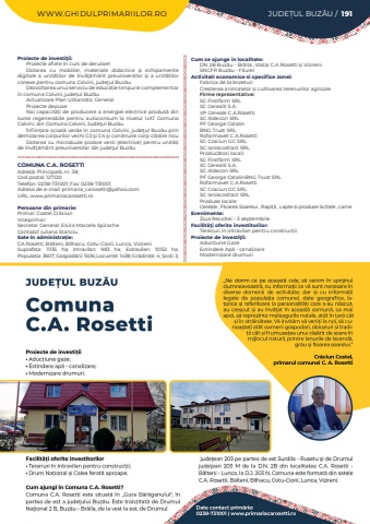 WWW.GHIDULPRIMARIILOR.RO JUDE%u021aUL BUZ%u0102U / 191Proiecte de investi%u0163ii:Proiecte aflate %u00een curs de derulare:Dotarea cu mobilier, materiale didactice %u015fi echipamente digitale a unit%u0103%u021bilor de %u00eenv%u0103%u0163%u0103m%u00e2nt preuniversitar %u015fi a unit%u0103%u021bilor conexe pentru comuna Calvini, jude%u0163ul Buz%u0103uDezvoltarea unui serviciu de educa%u021bie timpurie complementar %u00een comuna Calvini, jude%u021bul Buz%u0103uActualizare Plan Urbanistic GeneralProiecte depuse:Noi capacit%u0103%u021bi de producere a energiei electrice produs%u0103%u00a0din surse regenerabile pentru autoconsum la nivelul UAT Comuna Calvini, din Comuna Calvini, Jude%u0163ul Buz%u0103u%u00cenfiin%u021bare %u0219coal%u0103 verde %u00een comuna Calvini, jude%u0163ul Buz%u0103u prin demolarea corpurilor vechi C3 %u015fi C4 %u015fi construire corp cl%u0103dire nou Dotarea cu microbuze %u015fcolare verzi (electrice) pentru unit%u0103%u021bi de %u00eenv%u0103%u0163%u0103m%u00e2nt preuniversitar din jude%u0163ul Buz%u0103uCOMUNA C.A. ROSETTIAdres%u0103: Principal%u0103, nr. 38; Cod po%u0219tal: 127120Telefon: 0238-731001; Fax: 0238-731001; Adresa de e-mail: primaria_carosetti@yahoo.comURL: www.primariacarosetti.roPersoane din primarie:Primar: Costel%u00a0Cr%u0103ciunViceprimar:%u00a0Secretar General: Elvira Marcela SpiracheContabil:%u00a0Iuliana%u00a0StanciuSate %u00een administra%u021bie:CA Rosetti, B%u0103lteni, B%u00eelhacu, Cotu-Ciorii, Lunca, VizireniSuprafa%u021ba:%u00a0 11135 ha; Intravilan:%u00a0 983 ha; Extravilan:%u00a0 10152 ha; Popula%u021bia:%u00a03607; Gospod%u0103rii:%u00a01506; Locuin%u021be:%u00a01438; Gr%u0103dini%u021be:%u00a04; %u0218coli:%u00a03; Cum se ajunge in localitate:DN 2B Buz%u0103u - Br%u0103ila , sta%u021bia C.A.Rosetti %u0219i VizireniSNCFR Buz%u0103u - F%u0103ureiActivitati economice si specifice zonei:Fabrica de br%u00e2nzeturiCre%u0219terea animalelor %u0219i cultivarea terenurilor agricoleFirme reprezentative:SC Firstfarm SRLSC Cerealit S.A.VP Cereale C.A.RosettiSC Aldecon SRLPF George CatalinBNG Trust SRLRofarmavet C.A.RosettiSC Craciun GC SRLSC Ianiscostlact SRLProduc%u0103tori locali:SC Firstfarm SRLSC Cerealit S.A.SC Aldecon SRLPF George CatalinBNG Trust SRLRofarmavet C.A.RosettiSC Craciun GC SRLSC Ianiscostlact SRLProduse locale: Cereale , Floarea Soarelui , Rapi%u021b%u0103%u00a0, Lapte %u0219i produse lactate , carneEvenimente:Ziua Recoltei %u2013 3 septembrieFacilit%u00e3%u0163i oferite investitorilor:Terenuri %u00een intravilan pentru construc%u021biiProiecte de investi%u0163ii:Aduc%u021biune GazeExtindere Ap%u0103%u00a0- canalizare Modernizare drumuri