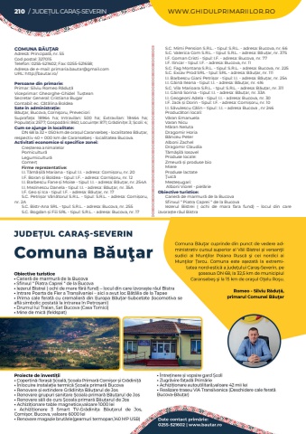 210 / JUDE%u021aUL CARA%u0218-SEVERIN WWW.GHIDULPRIMARIILOR.ROCOMUNA B%u0102U%u0162ARAdres%u0103: Principal%u0103, nr. 55Cod po%u0219tal: 327015Telefon: 0255-521602; Fax: 0255-521658; Adresa de e-mail: primaria.bautar@gmail.comURL: http://bautar.ro/Persoane din primarie:Primar: Silviu Romeo R%u0103du%u021b%u0103Viceprimar:%u00a0Gheorghe-Ghidel%u00a0 Tu%u0219tean%u00a0Secretar General:%u00a0Cristiana%u00a0BugarContabil: ec.%u00a0C%u0103t%u0103lina%u00a0BoldeaSate %u00een administra%u021bie:B%u0103u%u0163ar, Bucova, Corni%u015foru, PrevecioriSuprafa%u021ba:%u00a0 18964 ha; Intravilan:%u00a0 500 ha; Extravilan:%u00a0 18464 ha; Popula%u021bia:%u00a02577; Gospod%u0103rii:%u00a0860; Locuin%u021be:%u00a0871; Gr%u0103dini%u021be:%u00a03; %u0218coli:%u00a04; Cum se ajunge in localitate:DN 68 la 32 + 050 km de ora%u0219ul Caransebe%u015f - localitatea B%u0103u%u021bar, respectiv 40 + 000 km de Caransebe%u0219 - localitatea Bucova.Activitati economice si specifice zonei:Cre%u0219terea animalelorPomicultur%u0103Legumicultur%u0103Comer%u021bFirme reprezentative:I.I. T%u0103m%u0103%u0219il%u0103 Mariana - tipul: I.I. - adresa: Corni%u0219oru, nr. 20I.F. Boran %u0219i Boldea - tipul:%u00a0I.F. - adresa: Corni%u0219oru, nr. 12I.I. Barbescu Fane %u0219i Moise - tipul: I.I. - adresa: B%u0103u%u021bar, nr. 254AI.I. Mezinescu Danela - tipul: I.I. - adresa: B%u0103u%u021bar, nr. 35AI.F. Geo %u0219i Ica - tipul: I.F. - adresa: B%u0103u%u021bar, nr. 17S.C. Petri%u0219or V%u00e2n%u0103torul S.R.L. - tipul: S.R.L. - adresa: Corni%u0219oru, nr. 2AS.C. Bistr-Ana SRL - tpul: S.R.L. - adresa: Bucova, nr. 255S.C. Bogdan %u0219i Fiii SRL%u00a0- tipul: S.R.L. - adresa: Bucova, nr. 17S.C. Mimi Pension S.R.L. - tipul: S.R.L. - adresa: Bucova, nr. 66S.C. Valerica Com S.R.L. - tipul: S.R.L. - adresa: B%u0103u%u021bar, nr. 375I.F. Goman Cristi - tipul: I.F. - adresa: Bucova, nr. 77I.F. Ilincar - tipul: I.F. - adresa: Bucova, nr. 11S.C. Fag Montana S.R.L. - tipul: S.R.L. - adresa: Bucova, nr. 225S.C. Excav Prod SRL - tpul: SRL - adresa: B%u0103u%u021bar, nr. 111I.I. Barbescu Giani Petri%u0219or - tipul: I.I. - adresa: B%u0103u%u021bar, nr. 254I.I. G%u0103in%u0103 Ileana - tipul: I.I. - adresa: B%u0103u%u021bar, nr. 416S.C. Vila Marioara S.R.L. - tpul: S.R.L. - adresa: B%u0103u%u021bar, nr. 311I.I. G%u0103in%u0103 Sorina - tipul: I.I. - adresa: B%u0103u%u021bar, nr. 33AI.I. Geogeoni Adela - tipul: I.I. - adresa: Bucova, nr. 30I.F. Jack %u0219i Dorin - tipul: I.F. - adresa: Corni%u0219oru, nr. 10I.I. S%u0103vulescu C%u0103lin %u2013 tipul : I.I. %u2013 adresa Bucova , nr 246Produc%u0103tori locali:V%u0103ran EmanuelaVaran NicuM%u0103ran NelutaDragomir HoriaB%u0103nceu PeterAlboni ZachelDragomir ClaudiaT%u0103m%u0103%u015fil%u0103 IosovelProduse locale:Zmeur%u0103 %u0219i produse bioMiereProduse lactate%u0162uic%u0103Me%u0219te%u0219ugari: Alboni Viorel - piel%u0103rieObiective turistice:Carier%u0103%u00a0de marmur%u0103%u00a0de la BucovaSfinxul %u201c Piatra Caprei %u201c de la BucovaIezerul Bistrei ( ochi de mara fara fund) %u2013 locul din care izvora%u0219te r%u00e2ul Bistra