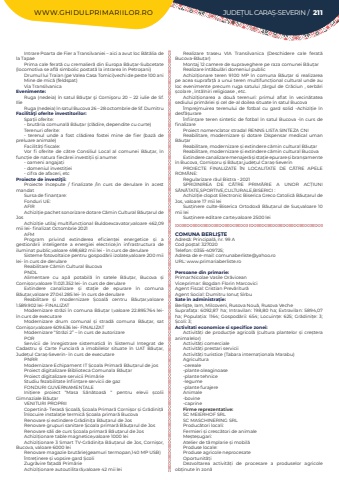 WWW.GHIDULPRIMARIILOR.RO JUDE%u021aUL CARA%u0218-SEVERIN / 211Intrare Poarta de Fier a Transilvaniei %u2013 aici a avut loc B%u0103t%u0103lia de la TapaePrima cale ferat%u0103%u00a0cu cremalier%u0103%u00a0din Europa B%u0103u%u021bar-Subcetate (locomotiva se afl%u0103 simbolic postat%u0103 la intrarea %u00een Petro%u0219ani)Drumul lui Traian (pe Valea Casa Tomici)vechi de peste 100 ani Mine de mic%u0103 (feldspat)Via TransilvanicaEvenimente:Ruga (nedeia) %u00een satul B%u0103u%u0163ar %u015fi Corni%u015foru 20 %u2013 22 iulie de Sf. IlieRuga (nedeia) %u00een satul Bucova 26 %u2013 28 octombrie de Sf. DumitruFacilit%u00e3%u0163i oferite investitorilor:Spa%u021bii oferite:- brut%u0103ria comunal%u0103 B%u0103u%u021bar (cl%u0103dire, dependite cu curte)Terenuri oferite:- terenul unde a fost cl%u0103direa fostei mine de fier (baz%u0103 de preluare animale)Facilit%u0103%u021bi fiscale:Vor fi oferite de c%u0103tre Consiliul Local al comunei B%u0103u%u021bar, %u00een func%u021bie de natura fiec%u0103rei investi%u021bii %u0219i anume:- oameni angaja%u021bi- domeniul investi%u021biei- cifra de afaceri, etcProiecte de investi%u0163ii:Proiecte %u00eencepute / finalizate /%u00een curs de derulare %u00een acest mandatSursa de finan%u021bare:Fonduri UE:AFIRAchizi%u021bie pachet sonorizare dotare C%u0103min Cultural B%u0103u%u021barul de JosAchizi%u021bie utilaj multifunc%u021bional Buldoexcavator,valoare 462,09 mii lei- finalizat Octombrie 2021AFMProgram privind extinderea eficien%u021bei energetice %u0219i a gestion%u0103rii inteligente a energiei electrice,%u00een infrastructura de iluminat public,valoare 498,682 mii lei - %u00een curs de derulareSisteme fotovoltaice pentru gospod%u0103rii izolate,valoare 200 mii lei- %u00een curs de derulareReabilitare C%u0103min Cultural BucovaPNDLAlimentare cu ap%u0103 potabil%u0103 %u00een satele B%u0103u%u021bar, Bucova %u0219i Corni%u0219or,valoare 11.021.352 lei- %u00een curs de derulareExtindere canalizare %u0219i sta%u021bie de epurare %u00een comuna B%u0103u%u021bar,valoare 27.041.285 lei- %u00een curs de derulareReabilitare %u0219i modernizare %u0218coal%u0103 centru B%u0103u%u021bar,valoare 1.589.902 lei- FINALIZATModernizare str%u0103zi %u00een comuna B%u0103u%u021bar I,valoare 22.895.764 lei%u00een curs de executareModernizare drum comunal %u0219i strad%u0103 comuna B%u0103u%u021bar, sat Corni%u0219or,valoare 609.636 lei- FINALIZATModernizare %u201cStr%u0103zi 2%u201d %u2013 %u00een curs de autorizarePORServicii de %u00eenregistrare sistematic%u0103 %u00een Sistemul Integrat de Cadastru %u0219i Carte Funciar%u0103 a imobilelor situate %u00een UAT B%u0103u%u021bar, Jude%u021bul Cara%u0219-Severin- %u00een curs de executarePNRRModernizare Echipament IT %u0218coala Primar%u0103%u00a0B%u0103u%u021barul de josProiect digitalizare Biblioteca Comunala B%u0103u%u021barProiect digitalizare servicii Prim%u0103rieStudiu fezabilitate %u00eenfiin%u021bare servicii de gaz FONDURI GUVERNAMENTALEIni%u021biere proiect %u201cMasa S%u0103n%u0103toas%u0103%u00a0 %u201c pentru%u00a0 elevii %u0219colii Gimnaziale B%u0103u%u021barVENITURI PROPRIICopertin%u0103- Teras%u0103 %u0218coal%u0103, %u0218coala Primar%u0103 Corni%u0219or %u0219i Gr%u0103dini%u021b%u0103%u00cenlocuire instala%u021bie termic%u0103 %u0218coala primar%u0103 BucovaRenovare %u0219i extindere Gr%u0103dini%u021ba B%u0103u%u021barul de JosRenovare grupuri sanitare %u0218coala primar%u0103 B%u0103u%u021barul de JosRenovare s%u0103li de curs %u0218coala primar%u0103 B%u0103u%u021barul de JosAchizi%u021bionare table magnetice,valoare 1000 leiAchizi%u021bionare 3 Smart TV-Gr%u0103dini%u021ba B%u0103u%u021barul de Jos, Corni%u0219or, Bucova, valoare 6000 leiRenovare magazie brut%u0103rie(geamuri termopan,140 MP USB)%u00centre%u021binere %u0219i vopsire gard %u0218coliZugr%u0103vire fa%u021bad%u0103 Prim%u0103rieAchizi%u021bionare autoutilitar%u0103,valoare 42 mii leiRealizare traseu VIA Transilvanica (Deschidere cale ferat%u0103 Bucova-B%u0103u%u021bar)Montaj 12 camere de supraveghere pe raza comunei B%u0103u%u021barRealizare %u00eent%u0103bul%u0103ri domeniul publicAchizi%u021bionare teren 9100 MP %u00een comuna B%u0103u%u021bar si realizarea pe acea suprafa%u021b%u0103%u00a0a unui teren multifunc%u021bional cultural unde au loc evenimente precum ruga satului ,t%u00e2rgul de Cr%u0103ciun , serb%u0103ri %u0219colare , %u00eent%u00e2lniri religioase , etc.Achizi%u021bionarea a dou%u0103%u00a0 terenuri: primul aflat %u00een vecin%u0103tatea sediului prim%u0103riei %u0219i cel de-al doilea situate %u00een satul Bucova %u00cemprejmuirea terenului de fotbal cu gard solid -Achizi%u021bie %u00een desf%u0103%u0219urare%u00cenfiin%u021bare teren sintetic de fotbal %u00een satul Bucova -%u00een curs de finalizareProiect nomenclator stradal RENNS LISTA SINTEZA CNIReabilitare, modernizare %u0219i dotare Dispensar medical uman B%u0103u%u021barReabilitare, modernizare %u0219i extindere c%u0103min cultural B%u0103u%u021barReabilitare, modernizare %u0219i extindere c%u0103min cultural BucovaExtindere canalizare menajer%u0103 %u0219i sta%u021bie epurare %u0219i bran%u0219amente %u00een Bucova, Corni%u0219oru %u0219i B%u0103u%u021bar,jude%u021bul Cara%u0219-SeverinPROIECTE FINALIZATE %u00ceN LOCALITATE DE C%u0102TRE APELE ROM%u00c2NE:Regularizare r%u0103ul Bistra - 2021SPRIJINIREA DE C%u0102TRE PRIM%u0102RIE A UNOR AC%u021aIUNI S%u0102N%u0102TATE,SPORTIVE,CULTURALE,BISERICI :Achizi%u021bie clopot Electronic Biserica Greco Catolic%u0103 B%u0103u%u021barul de Jos, valoare 17 mii leiSus%u021binere culte-Biserica Ortodox%u0103 B%u0103u%u021barul de Sus,valoare 10 mii lei Sus%u021binere editare carte,valoare 2500 leiCOMUNA BERLI%u015eTEAdres%u0103: Principal%u0103, nr. 99 ACod po%u0219tal: 327020Telefon: 0355-409725; Adresa de e-mail: comunaberliste@yahoo.roURL: www.primariaberliste.roPersoane din primarie:Primar:Nicolae Vasile Or%u0103viceanViceprimar: Bogdan Florin Marcovici%u00a0Agent Fiscal: Cristian Prev%u0103ritur%u0103%u00a0Agent 