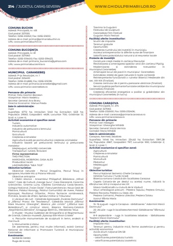 214 / JUDE%u021aUL CARA%u0218-SEVERIN WWW.GHIDULPRIMARIILOR.ROCOMUNA BUCHINAdres%u0103: Principal%u0103, nr. 4BCod po%u0219tal: 327055Telefon: 0255-516163; Fax: 0255-516151; Adresa de e-mail: primar@primariabuchin.roURL: www.primariabuchin.roCOMUNA BUCO%u015eNI%u0162AAdres%u0103: Principal%u0103, nr. 81Cod po%u0219tal: 327060Telefon: 0255-519400; Fax: 0255-519423; Adresa de e-mail: primaria_bucosnita@yahoo.comURL: www.primariabucosnita.roMUNICIPIUL CARANSEBE%u015eAdres%u0103: P-%u0163a Revolu%u0163iei, nr. 1Cod po%u0219tal: 325400Telefon: 0255-514885; Fax: 0255-515139; Adresa de e-mail: primaria.caransebes@gmail.comURL: www.primaria-caransebes.roPersoane din primarie:Primar: Felix Cosmin BorceanViceprimar: Marin NedelcuSecretar General: Ana BratuDirector Economic: Marius PredaSate %u00een administra%u021bie:JupaSuprafa%u021ba:%u00a0 6772 ha; Intravilan:%u00a0 1240 ha; Extravilan:%u00a0 5531 ha; Popula%u021bia:%u00a0 29563; Gospod%u0103rii:%u00a0 4629; Locuin%u021be:%u00a0 700; Gr%u0103dini%u021be:%u00a0 12; %u0218coli:%u00a04; Licee:%u00a06; Activitati economice si specifice zonei:Turism,Industria automotiveIndustria de prelucare a lemnuluiPomicultur%u0103Sivicultur%u0103Cre%u0219terea animalelorAgricultur%u0103 axat%u0103 pe pomicultur%u0103 %u015fi cre%u015fterea animalelorIndustria bazat%u0103 pe prelucrarea lemnului %u015fi prelucrarea metalelorMe%u015fte%u015fuguri, activit%u0103%u0163i comercialeTransporturi: rutiere, feroviareFirme reprezentative:TMD FRICTIONMARCHESI, MOBIROM, CASA ALEXProduc%u0103tori locali: LIMON%u0102D%u0102RIA %u201cNEA TIC%u0102%u201dObiective turistice:Obiective naturale - Parcul Dragalina, Parcul Teiu%u0219; %u00een apropiere, Muntele Mic %u0219i Poiana M%u0103ruluiObiective antropice1. Cl%u0103diri istorice - Ansamblul Philipphof, Biblioteca %u201eMihail Halici%u201d, Casa de Cultur%u0103 %u201eGeorge Suru%u201d, Casa Diecezan%u0103, Cazarma Gr%u0103nicerilor, Cinema Luna, Cl%u0103direa Comitatului Cara%u0219-Severin, Colegiul Na%u021bional %u201eTraian Doda%u201d, Fostul penitenciar, Noua Cas%u0103 de P%u0103strare, Palatul Korongy, Palatul Comunit%u0103%u021bii de Avere, Palatul Episcopal, Pavilionul Ofi%u021berilor, Prima farmacie rom%u00e2neasc%u0103, Prim%u0103ria, %u0218coala de ofi%u021beri, Spitalul militar %u0219i Tribunalul2. L%u0103ca%u0219uri de cult - Catedrala Episcopal%u0103 %u201e%u00cenvierea Domnului%u201d %u0219i %u201eSf%u00e2ntul Proroc Ilie Tesviteanul%u201d, Catedrala istoric%u0103 %u201eSf%u00e2ntul Mare Mucenic Gheorghe%u201d, Biserica %u201edin cimitir%u201d (%u201eSf%u00e2ntul Ioan Botez%u0103torul%u201d) %u0219i cimitirul istoric, Biserica Romano-Catolic%u0103 %u201eNeprih%u0103nita Z%u0103mislire%u201d, Sinagoga Beith EL, M%u0103n%u0103stirea Teiu%u02193. Muzee - Muzeul Jude%u021bean de Etnografie %u0219i al Regimentului de Grani%u021b%u0103, Colec%u021bia muzeal%u0103 %u201eEpiscop Elie Miron Cristea%u201d4. Parcurile monumentale de sculptur%u0103 %u00een lemn, andezit %u0219i marmur%u01035. Monumente %u0219i statuiDe asemenea, pentru mai multe informa%u021bii, exist%u0103 Centrul Na%u021bional de Informare %u0219i Promovare Turistic%u0103 al Municipiului Caransebe%u0219Evenimente:Serb%u0103rile Cet%u0103%u021biiRuga de la ora%u0219Toamna la Gugulani Festivalul de sculptur%u0103Caransebe%u0219 Film FestivalGugulan Rock FestivalFacilit%u00e3%u0163i oferite investitorilor:Scutiri de impoziteTerenuri gratuiteOportunit%u0103%u021biCre%u0219terea num%u0103rului de investi%u021bii %u00een municipiuAccesul antreprenorilor la diferite surse de finan%u021bareValorificarea poten%u021bialului natural %u0219i al resurselor localeProiecte de investi%u0163ii:Construire cre%u0219%u0103 medie %u00een cartierul Racovi%u021beiRevitalizarea %u0219i amenajarea spa%u021biilor verzi din cartierul PipirigModernizarea %u0219i extinderea trotuarelor %u00een municipiul%u00a0Caransebe%u0219Amenajare locuri de joac%u0103 %u00een municipiul%u00a0%u00a0Caransebe%u0219Extinderea re%u021belei de gaze naturale %u00een toate cartiereleReinterpretarea func%u021bional%u0103 a ruinelor Bisericii Medievale din sec. XIII-XIX (finalizat)Crearea centrului de zi pentru persoane v%u00e2rstnice (finalizat)Servicii publice performante furnizate cet%u0103%u021benilor municipiului Caransebe%u0219 (finalizat)Cre%u0219terea eficien%u021bei energetice a %u0219colilor %u0219i gr%u0103dini%u021belor din municipiul Caransebe%u0219 (%u00een lucru)COMUNA CARA%u015eOVAAdres%u0103: Principal%u0103, nr. 274Cod po%u0219tal: 327065Telefon: 0255-232000; Fax: 0255-232406; Adresa de e-mail: carasova@primariacarasova.roURL: www.primariacarasova.roPersoane din primarie:Primar: Ivan Ha%u021beganViceprimar:%u00a0Gheorghe%u00a0Mih%u0103il%u0103%u00a0Secretar General:%u00a0Maria%u00a0Vernica%u00a0Contabil:%u00a0Maria%u00a0Mih%u0103il%u0103%u00a0Sate %u00een administra%u021bie:Cara%u015fova, Nermed, IabalceaSuprafa%u021ba:%u00a0 14146 ha; Intravilan:%u00a0 234,62 ha; Extravilan:%u00a0 13911,38 ha; Popula%u021bia:%u00a0 2967; Gospod%u0103rii:%u00a0 797; Locuin%u021be:%u00a0 930; Gr%u0103dini%u021be:%u00a0 2; %u0218coli:%u00a02; Licee:%u00a01; Activitati economice si specifice zonei:Agricultur%u0103Cre%u015fterea animalelorPomicultur%u0103Silvicultur%u0103P%u0103storitulMe%u0219te%u0219ugari Dogar%u00a0Obiective turistice:Parcul Na%u021bional Semenic-Cheile Cara%u0219uluiCetatea Turcului ( Turski Grad)Biserica romano-catolic%u0103 din localitatea Cara%u0219ovaCapela Calvaria-de pe dealul cu acela%u0219i nume, ridicat%u0103 la sf%u00e2r%u0219itul sec.XIX %u0219i inceputul sec.XXMoara tradi%u021bional%u0103 cu ciutur%u0103 de la ViaductSituri arheologice precum : Pe%u0219tera %u021aapului, Pe%u0219tera Omului, Pe%u0219tera Racovi%u021ba, Pe%u0219tera cu Oase, etcPe%u0219tera Comarnic, Pe%u0219tera Lilieciilor; Pe%u0219tera %u021aolosuIzvorul Sf%u00e2nta MariaEvenimente:15- 16 august- ruga la Cara%u0219ova - s%u0103rb%u0103toarea %u201d Adormirii Maicii Domnului%u201d25- 26 iulie - ruga %u00een loca