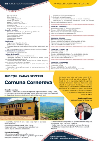 218 / JUDE%u021aUL CARA%u0218-SEVERIN WWW.GHIDULPRIMARIILOR.RONik Kop Bian IIBijan Stefania IIMartaloggu Ani%u0219ca IIVulpes Ion Jarcu IIVulpes Petru Jarcu PFA,Martalogu Duicu Radu PFA s.aProduse locale:Br%u00e2nza de oi, br%u00e2nza de vaci, sucuri naturale de fructeProduse tradi%u021bionale din carneObiective turistice:Ansamblul morilor de ap%u0103, de la %u00eenceputul sec.XXPeisajele naturale din mun%u021bii CerneiRezerva%u021bia Iauna-CraiovaRezerva%u021bia BelarecaPe%u0219tera lui Ion BarzoniPiatra IlisoveiEvenimente:Ruga satului Bogaltin-20 iulieRuga satului Cornereva-15 augustFestivalul Na%u021bional Mariana Dr%u0103ghicescu- luna septembrie-sat BogaltinT%u00e2rgul produselor tradi%u021bionale-luna octombrie-sat CornerevaFacilit%u00e3%u0163i oferite investitorilor:Impozite %u0219i%u00a0taxe locale reduseProiecte de investi%u0163ii:Alimentare cu ap%u0103%u00a0%u00een comuna CornerevaCanalizare menajer%u0103%u00a0 %u0219i sta%u021bie de epurare a apelor uzate menajere %u00een localitatea CornerevaCanalizare menajer%u0103%u00a0 sista%u021bie de epurare %u00een satele: Bogaltin, Gruni, Arsuri, Izvor,comuna CornerevaModernizare drumuri comunale %u00een comuna Cornereva- %u00een lungime de 19 kmModernizare drumuri comunale %u00een comuna Cornereva- %u00een lungime de 5,6 kmReabilitare %u0219i modernizare %u0218coala Profesional%u0103%u00a0Agricol%u0103%u00a0BogaltinReabilitare %u0219i modernizare %u0218coala cu clasele I-IV ZanogiReabilitare %u0219i modernizare Dispensar Uman %u00een comuna Cornereva,jude%u021bul Cara%u0219-SeverinCOMUNA DALBO%u015eE%u0162Adres%u0103: Principal%u0103, nr. 130; Cod po%u0219tal: 327165Telefon: 0355-401766; Fax: 0355-780130; Adresa de e-mail: primariadalboset@yahoo.comURL: http://www.comunadalboset.ro/COMUNA DOCLINAdres%u0103: nr. 1; Cod po%u0219tal: 327175Telefon: 0255-527001, 0255-527074; Fax: 0255-527001; Adresa de e-mail: primaria_doclin@yahoo.comURL: http://www.comuna-doclin.ro/COMUNA DOGNECEAAdres%u0103: Principal%u0103, nr. 639Cod po%u0219tal: 327180Telefon: 0255-236305, 236499; Fax: 0255-236305, 236499; Adresa de e-mail: dogneceaprimaria@yahoo.comURL: https://comunadognecea.ro/COMUNA DOMA%u015eNEAAdres%u0103: Principal%u0103, nr. 318Cod po%u0219tal: 327185Telefon: 0255-263101; Fax: 0255-263101; Adresa de e-mail: primariadomasnea@yahoo.com