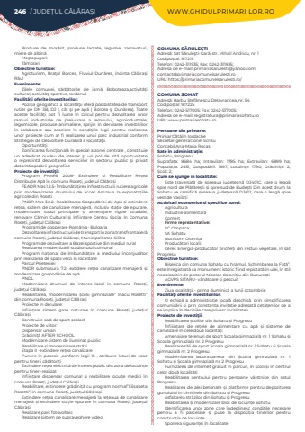 246 / JUDE%u021aUL C%u0102L%u0102RA%u0218I WWW.GHIDULPRIMARIILOR.ROProduse de mor%u0103rit, produse lactate, legume, zarzavaturi, miere de albin%u0103Me%u015fte%u015fugari:T%u00e2mplariObiective turistice:Agroturism, Bra%u0163ul Borcea, Fluviul Dun%u0103rea, %u00eencinta C%u0103l%u0103ra%u0219i R%u0103ulEvenimente:Zilele comunei, s%u0103rb%u0103torile de iarn%u0103, Boboteaza,activit%u0103%u021bi cultural, activit%u0103%u0163i sportive, IordanulFacilit%u00e3%u0163i oferite investitorilor:Pozi%u021bia geografic%u0103 a localit%u0103%u0163ii ofer%u0103 posibilitatea de transport rutier pe DN 3B, DJ 1, c%u00e2t %u015fi pe ap%u0103 ( Borcea %u015fi Dun%u0103rea). Toate aceste facilit%u0103%u021bi pot fi luate %u00een calcul pentru dezvoltarea unor ramuri industriale de prelucrare a lemnului, agroindustrale, legumicole, produse animaliere, sprijin %u00een derularea investi%u021biilor %u00een colaborare sau asociere %u00een condi%u0163iile legii pentru realizarea unor proiecte cum ar fi realizarea unui parc industrial conform Strategiei de Dezvoltare Durabil%u0103 a localit%u0103%u0163ii.Oportunit%u0103%u0163iZonificarea func%u0163ional%u0103 %u00een special a zonei centrale , constituie un adev%u0103rat nucleu de interes %u015fi un pol de alt%u0103 oportunitate o reprezint%u0103 dezvoltarea serviciilor %u00een sectorul public %u015fi privat datorit%u0103 a%u015fez%u0103rii geograficeProiecte de investi%u0163ii:Program PHARE 2006- Extindere %u0219i Reabilitare Re%u021bea Distribu%u021bie Ap%u0103 %u00een comuna Rose%u021bi, jude%u021bul C%u0103l%u0103ra%u0219iFEADR Mas 1.2.5- %u00cembun%u0103t%u0103%u021birea infrastructurii rutiere agricole prin modernizarea drumului de acces Amzaua la exploata%u021biile agricole din Rose%u021biPNDR Mas 3.2.2- Reabilitarea Gospod%u0103riei de Ap%u0103 %u0219i extindere re%u021bea, sistem de canalizare menajer%u0103, inclusiv sta%u021bie de epurare, modernizare str%u0103zi principale %u0219i amenajare rigole stradale, renovare C%u0103min Cultural %u0219i %u00eenfiin%u021bare Centru Social %u00een Comuna Rose%u021bi, jude%u021bul C%u0103l%u0103ra%u0219iProgram de cooperare Rom%u00e2nia- BulgariaDezvoltarea infrastructurii de transport %u00een zona transfrontalier%u0103 comuna Rose%u021bi, jude%u021bul C%u0103l%u0103ra%u0219i, Municipalitatea SilitraProgram de dezvoltare a Bazei sportive din mediul ruralRealizarea moderniz%u0103rii stadionului comunalProgram na%u021bional de %u00eembun%u0103t%u0103%u021bire a mediului %u00eenconjur%u0103tor prin realizarea de spa%u021bii verzi %u00een localitateParcul PrietenieiPNDR subm%u0103sura 7.2- extidere re%u021bea canalizare menajer%u0103 %u0219i modernizare gospod%u0103rie de ap%u0103PNDLModernizare drumuri de interes local %u00een comuna Rose%u021bi, jude%u021bul C%u0103l%u0103ra%u0219iReabilitarea, modernizarea %u0219colii gimnaziale%u201d Inacu Rosetti%u201d din comuna Rose%u021bi, jude%u021bul C%u0103l%u0103ra%u0219iProiecte %u00een derulare:%u00cenfiin%u021bare sistem gaze naturale %u00een comuna Rose%u021bi, jude%u021bul C%u0103l%u0103ra%u0219iConstruire sal%u0103%u00a0de sport %u0219colar%u0103Proiecte de viitor:Dispensar umanGr%u0103dini%u021b%u0103 AFTER SCHOOLModernizare sistem de iluminat publicReabilitare %u0219i modernizare str%u0103ziEtapa II -extindere re%u021bea canalizarePunere %u00een posesie ,conform legii 15 , atribuire loturi de case pentru tinerii c%u0103s%u0103tori%u021biExtindere re%u021bea electric%u0103 de interes public din zona de locuin%u021be pentru tineri-realizat%u00cenfiin%u021bare dispensar comunal %u0219i reabilitare locui%u021be medici %u00een comuna Rose%u021bi, jude%u021bul C%u0103l%u0103ra%u0219iReabilitare, extindere gr%u0103dini%u021b%u0103 cu program normal%u201dElisabeta Rosetti%u201d, %u00een comuna Rose%u021bi, jude%u021bul C%u0103l%u0103ra%u0219iExtindere re%u021bea canalizare menajer%u0103 la re%u021beaua de canalizare menajer%u0103 %u0219i extindere sta%u021bie epurare %u00een comuna Rose%u021bi, jude%u021bul C%u0103l%u0103ra%u0219iRealizare parc fotovoltaic Realizare sistem de supraveghere videoCOMUNA S%u0102RULE%u015eTIAdres%u0103: Sat S%u0103rule%u015fti-Gar%u0103, str. Mihail Andricu, nr. 1Cod po%u0219tal: 917215Telefon: 0242-311935; Fax: 0242-311935; Adresa de e-mail: primariasarulesti@yahoo.comcontact@primariacomuneisarulesti.roURL: https://primariacomuneisarulesti.ro/COMUNA SOHATAdres%u0103: Barbu %u0218tef%u0103nescu Delavrancea, nr. 54Cod po%u0219tal: 917225Telefon: 0242-517005; Fax: 0242-517005; Adresa de e-mail: registratura@primariasohatu.roURL: www.primariasohatu.roPersoane din primarie:Primar:C%u0103t%u0103lin IordacheSecretar general:Ionel ScrisuContabil:Ana-Maria Roca%u0219%u00a0Sate %u00een administra%u021bie:Sohatu, ProgresuSuprafa%u021ba:%u00a0 8684 ha; Intravilan:%u00a0 1785 ha; Extravilan:%u00a0 6899 ha; Popula%u021bia:%u00a0 2451; Gospod%u0103rii:%u00a0 1697; Locuin%u021be:%u00a0 1790; Gr%u0103dini%u021be:%u00a0 2; %u0218coli:%u00a02; Cum se ajunge in localitate:Este traversat%u0103 de %u0219oseaua jude%u021bean%u0103 DJ401C, care o leag%u0103 spre nord de Pl%u0103t%u0103re%u0219ti %u0219i spre sud de Bude%u0219ti Din acest drum la Sohatu se ramific%u0103 %u0219oseaua jude%u021bean%u0103 DJ412, care o leag%u0103 spre vest de Vasila%u021biActivitati economice si specifice zonei:AgriculturaIndustrie alimentar%u0103Comer%u021bFirme reprezentative:SC OmpacaSA SohatuNutricom Olteni%u021baProduc%u0103tori locali:Ceres Energia-produc%u0103tor briche%u021bi din resturi vegetale, %u00een sat ProgresuObiective turistice:Biserica din comuna Sohatu cu hramul,, Schimbarea la Fa%u021b%u0103%u201d, este %u00eenregistrat%u0103%u00a0ca monument istoric fiind repictat%u0103%u00a0%u00een ulei, %u00een stil neobizantin de pictorul Nicolae Coloni%u021biu din Bucure%u0219tiAGVPS SITARU- v%u00e2n%u0103toare %u0219i pescuitEvenimente:Ziua localit%u0103%u0163ii - prima duminic%u0103 a lunii octombrieFacilit%u00e3%u0163i oferite investitorilor:O echip%u0103 a administra%u021bi