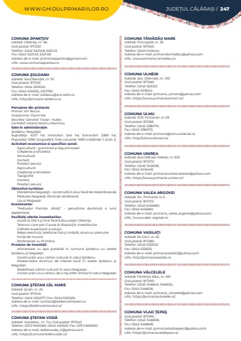 WWW.GHIDULPRIMARIILOR.RO JUDE%u021aUL C%u0102L%u0102RA%u0218I / 247COMUNA SPAN%u0162OVAdres%u0103: C%u0103l%u0103ra%u015fi, nr. 84Cod po%u0219tal: 917230Telefon: 0242-522148, 522143; Fax: 0242-522143, 522148; Adresa de e-mail: primariaspantov@gmail.comURL: www.comunaspantov.roCOMUNA %u015eOLDANUAdres%u0103: Sos.Olteni%u021bei ,nr 70Cod po%u0219tal: 917235Telefon: 0242 530530; Fax: 0242-530530, 530790; Adresa de e-mail: soldanu@cl.e-adm.roURL: http://primaria-soldanu.roPersoane din primarie:Primar:%u00a0Ion BucurViceprimar: Florin IlieSecretar General: Traian%u00a0 HuleaContabil: Iuliana Stancu MarinciuSate %u00een administra%u021bie:%u015eoldanu, Negoe%u015ftiSuprafa%u021ba:%u00a0 4227 ha; Intravilan:%u00a0 244 ha; Extravilan:%u00a0 3280 ha; Popula%u021bia:%u00a03318; Gospod%u0103rii:%u00a01146; Locuin%u021be:%u00a01083; Gr%u0103dini%u021be:%u00a01; %u0218coli:%u00a02; Activitati economice si specifice zonei:Agricultur%u0103 - graminee %u015fi leguminoaseCre%u015fterea animalelorSilvicultur%u0103Comer%u0163Prest%u0103ri serviciiAgricultur%u0103Cre%u015fterea animalelorTipografieComer%u0163Prest%u0103ri serviciiObiective turistice:M%u0103n%u0103stirea Negoe%u015fti - construit%u0103 %u00een anul 1649 de Matei BasarabP%u0103durea Negoe%u015fti (fond de v%u00e2n%u0103toare)Lacul Negoe%u015ftiEvenimente:%u201cFestivalul Pomilor Altoi%u0163i%u201d - penultima duminic%u0103 a lunii septembrieFacilit%u00e3%u0163i oferite investitorilor:Acces la DN 4 %u015fi linia ferat%u0103 Bucure%u015fti-Olteni%u0163aTerenuri care pot fi puse la dispozi%u0163ia investitorilorCalitate superioar%u0103 a soluluiRe%u0163ea electric%u0103, telefonie fix%u0103 %u015fi mobil%u0103, drumuri pietruiteFor%u0163%u0103 de munc%u0103Parteneriat cu Prim%u0103riaProiecte de investi%u0163ii:Alimentare cu ap%u0103 potabil%u0103 %u00een comuna %u015eoldanu cu satele %u015eoldanu %u015fi Negoe%u015ftiConstruc%u0163ie unui c%u0103min cultural %u00een satul %u015eoldanuModernizare drumuri de interes local %u00een satele %u015eoldanu %u015fi Negoe%u015ftiReabilitare c%u0103min cultural %u00een satul Negoe%u015ftiConstruc%u0163ia unui centru de zi tip After School %u00een satul Negoe%u015ftiCOMUNA %u015eTEFAN CEL MAREAdres%u0103: %u015ecolii, nr. 25Cod po%u0219tal: 917245Telefon: 0242-530077; Fax: 0242-530025; Adresa de e-mail: contact@stefancelmarecl.roURL: https://stefancelmarecl.ro/COMUNA %u015eTEFAN VOD%u0102Adres%u0103: Viorelelor, nr. 114; Cod po%u0219tal: 917240Telefon: 0372-900080, 0342-401549; Fax: 0372-893920; Adresa de e-mail: stefanvoda_cl@yahoo.comURL: https://comunastefanvoda.ro/COMUNA T%u0102M%u0102D%u0102U MAREAdres%u0103: Principal%u0103, nr. 55Cod po%u0219tal: 917250Telefon: 0242-643444; Adresa de e-mail: primariatamadau@yahoo.comURL: www.primaria-tamadau.roCOMUNA ULMENIAdres%u0103: %u0218os. Olteni%u021bei, nr. 310Cod po%u0219tal: 917260Telefon: 0242-523123; Fax: 0242-523554; Adresa de e-mail: primaria_ulmeni@yahoo.comURL: https://www.primariaulmeni.ro/COMUNA ULMUAdres%u0103: STR. Primariei ,nr 29Cod po%u0219tal: 917265Telefon: 0242-338070; Fax: 0242-338070; Adresa de e-mail: primarie@ulmucalarasi.roURL: http://ulmucalarasi.ro/COMUNA UNIREAAdres%u0103: %u0218os.C%u0103l%u0103ra%u0219i-Fete%u0219ti, nr 303Cod po%u0219tal: 917270Telefon: 0242-343028; Fax: 0242-343448; Adresa de e-mail: primariaunireacalarasi@yahoo.comURL: https://www.primaria-unirea.ro/COMUNA VALEA ARGOVEIAdres%u0103: Str. Primariei nr.5Cod po%u0219tal: 917275Telefon: 0242-645680; Fax: 0242-645680; Adresa de e-mail: primaria_valea_argovei@yahoo.comURL: /www.valea-argovei.roCOMUNA VASILA%u0162IAdres%u0103: str.Garii ,nr 45Cod po%u0219tal: 917280Telefon: 0242-532532; Fax: 0242-532555; Adresa de e-mail: primariavasilati@yahoo.comURL: http://primariavasilati.roCOMUNA V%u00c2LCELELEAdres%u0103: Floren%u0163a Albu, nr. 691Cod po%u0219tal: 917290Telefon: 0242-346605, 346603,; Fax: 0242-346606; Adresa de e-mail: primaria_vilcelele@yahoo.comURL: https://primariavilcelele.ro/COMUNA VLAD %u0162EPE%u015eCod po%u0219tal: 917295Telefon: 0242-346806; Fax: 0242-346808; Adresa de e-mail: primariavladtepescl@yahoo.comURL: https://primariavladtepes.ro/