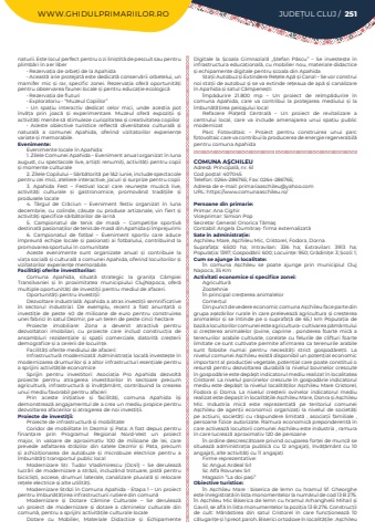 WWW.GHIDULPRIMARIILOR.RO JUDE%u021aUL CLUJ / 251naturii. Este locul perfect pentru o zi lini%u0219tit%u0103 de pescuit sau pentru plimb%u0103ri %u00een aer liber%u2022 Rezerva%u021bia de orbe%u021bi de la Apahida%u2022 Aceast%u0103 arie protejat%u0103 este dedicat%u0103 conserv%u0103rii orbetelui, un mamifer mic %u0219i rar, specific zonei. Rezerva%u021bia ofer%u0103 oportunit%u0103%u021bi pentru observarea faunei locale %u0219i pentru educa%u021bie ecologic%u0103%u2022 Rezerva%u021bia de fluturi%u2022 Exploratoriu - %u201cMuzeul Copiilor%u201d%u2022 Un spa%u021biu interactiv dedicat celor mici, unde ace%u0219tia pot %u00eenv%u0103%u021ba prin joac%u0103 %u0219i experimentare. Muzeul ofer%u0103 expozi%u021bii %u0219i activit%u0103%u021bi menite s%u0103 stimuleze curiozitatea %u0219i creativitatea copiilor %u2022 Aceste obiective turistice reflect%u0103 diversitatea cultural%u0103 %u0219i natural%u0103 a comunei Apahida, oferind vizitatorilor experien%u021be variate %u0219i memorabile.Evenimente:Evenimente locale %u00een Apahida:1. Zilele Comunei Apahida %u2013 Eveniment anual organizat %u00een luna august, cu spectacole live, arti%u0219ti renumi%u021bi, activit%u0103%u021bi pentru copii %u0219i momente culturale2. Zilele Copilului %u2013 S%u0103rb%u0103torit%u0103 pe 1&2 iunie, include spectacole pentru cei mici, ateliere interactive, jocuri %u0219i surprize pentru copii3. Apahida Fest %u2013 Festival local care reune%u0219te muzic%u0103 live, activit%u0103%u021bi culturale %u0219i gastronomice, promov%u00e2nd tradi%u021biile %u0219i produsele locale4. T%u00e2rgul de Cr%u0103ciun %u2013 Eveniment festiv organizat %u00een luna decembrie, cu colinde, c%u0103su%u021be cu produse artizanale, vin fiert %u0219i activit%u0103%u021bi specifice s%u0103rb%u0103torilor de iarn%u01035. Campionatul de tenis de mas%u0103 %u2013 Competi%u021bie sportiv%u0103 destinat%u0103 pasiona%u021bilor de tenis de mas%u0103 din Apahida %u0219i %u00eemprejurimi6. Campionatul de fotbal %u2013 Eveniment sportiv care aduce %u00eempreun%u0103 echipe locale %u0219i pasiona%u021bi ai fotbalului, contribuind la promovarea sportului %u00een comunitate Aceste evenimente sunt organizate anual %u0219i contribuie la via%u021ba social%u0103 %u0219i cultural%u0103 a comunei Apahida, oferind locuitorilor %u0219i vizitatorilor experien%u021be memorabile.Facilit%u00e3%u0163i oferite investitorilor:Comuna Apahida, situat%u0103 strategic la grani%u021ba C%u00e2mpiei Transilvaniei %u0219i %u00een proximitatea municipiului ClujNapoca, ofer%u0103 multiple oportunit%u0103%u021bi de investi%u021bii pentru mediul de afaceri.Oportunit%u0103%u021bi pentru investi%u021bii:Dezvoltare industrial%u0103: Apahida a atras investi%u021bii semnificative %u00een sectorul industrial. De exemplu, recent a fost anun%u021bat%u0103 o investi%u021bie de peste 40 de milioane de euro pentru construirea unei fabrici %u00een satul Dezmir, pe un teren de peste cinci hectareProiecte imobiliare: Zona a devenit atractiv%u0103 pentru dezvoltatori imobiliari, cu proiecte care includ construc%u021bia de ansambluri reziden%u021biale %u0219i spa%u021bii comerciale, datorit%u0103 cre%u0219terii demografice %u0219i a cererii de locuin%u021be.Facilit%u0103%u021bi oferite mediului de afaceri:Infrastructur%u0103 modernizat%u0103: Administra%u021bia local%u0103 investe%u0219te %u00een modernizarea drumurilor %u0219i a altor infrastructuri esen%u021biale pentru a sprijini activit%u0103%u021bile economiceSprijin pentru investitori: Asocia%u021bia Pro Apahida dezvolt%u0103 proiecte pentru atragerea investitorilor %u00een sectoare precum agricultur%u0103, infrastructur%u0103 %u0219i %u00eenv%u0103%u021b%u0103m%u00e2nt, contribuind la crearea unui mediu favorabil pentru afaceri Prin aceste ini%u021biative %u0219i facilit%u0103%u021bi, comuna Apahida %u00ee%u0219i demonstreaz%u0103 angajamentul de a crea un mediu propice pentru dezvoltarea afacerilor %u0219i atragerea de noi investi%u021bii.Proiecte de investi%u0163ii:Proiecte de infrastructur%u0103 %u0219i mobilitate:Coridor de mobilitate %u00een Dezmir %u0219i Pata: A fost depus pentru finan%u021bare prin Programul Regional Nord-Vest un proiect major, %u00een valoare de aproximativ 100 de milioane de lei, care prevede asfaltarea str%u0103zilor din satele Dezmir %u0219i Pata, precum %u0219i achizi%u021bionarea de autobuze %u0219i microbuze electrice pentru a %u00eembun%u0103t%u0103%u021bi transportul public localModernizare Str. Tudor Vladimirescu (Dc41) %u2013 Se deruleaz%u0103 lucr%u0103ri de modernizare a str%u0103zii, incluz%u00e2nd trotuare, pist%u0103 pentru bicicli%u0219ti, accese, drumuri laterale, canalizare pluvial%u0103 %u0219i relocare re%u021bele electrice %u0219i alte utilit%u0103%u021bi.Modernizare Str%u0103zi %u00een Comuna Apahida - Etapa 1 %u2013 Un proiect pentru %u00eembun%u0103t%u0103%u021birea infrastructurii rutiere din comun%u0103Modernizare %u0219i Dotare C%u0103mine Culturale %u2013 Se deruleaz%u0103 un proiect de modernizare %u0219i dotare a c%u0103minelor culturale din comun%u0103, pentru a sprijini activit%u0103%u021bile culturale localeDotare cu Mobilier, Materiale Didactice %u0219i Echipamente Digitale la %u0218coala Gimnazial%u0103 %u201e%u0218tefan P%u0103scu%u201d %u2013 Se investe%u0219te %u00een infrastructura educa%u021bional%u0103, cu mobilier nou, materiale didactice %u0219i echipamente digitale pentru %u0219coala din ApahidaSta%u021bii Autobuz %u0219i Extindere Re%u021bele Ap%u0103 %u0219i Canal %u2013 Se vor construi noi sta%u021bii de autobuz %u0219i se va extinde re%u021beaua de ap%u0103 %u0219i canalizare %u00een Apahida %u0219i satul C%u00e2mpene%u0219ti%u00cemp%u0103durire 21.800 mp %u2013 Un proiect de re%u00eemp%u0103durire %u00een comuna Apahida, care va contribui la protejarea mediului %u0219i la %u00eembun%u0103t%u0103%u021birea peisajului localRefacere Pia%u021bet%u0103 Central%u0103 %u2013 Un proiect de revitalizare a centrului local, care va include amenajarea unui spa%u021biu 