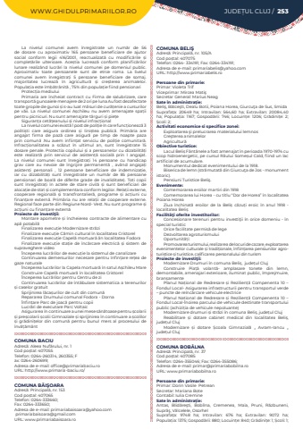 WWW.GHIDULPRIMARIILOR.RO JUDE%u021aUL CLUJ / 253La nivelul comunei avem %u00eenregistrate un num%u0103r de 56 de dosare cu aproximativ 165 persoane beneficiare de ajutor social conform legii 416/2001, reactualizat%u0103%u00a0 cu modific%u0103rile %u0219i complet%u0103rile ulterioare. Ace%u0219tia lucreaz%u0103%u00a0 conform planific%u0103rilor lunare realiz%u00e2nd lucr%u0103ri la nivelul comunei pe domeniul public. Aproximativ toate persoanele sunt de etnie roma. La livelul comunei avem %u00eenregistra%u021bi 5 persoane beneficiare de somaj. majoritatea lucreaz%u0103%u00a0 %u00een agricultur%u0103%u00a0 %u0219i cre%u0219terea animalelor. Popula%u021bia este %u00eemb%u0103tr%u00e2nit%u0103%u00a0, 75% din popula%u021bie fiind pensionariProtec%u021bia mediuluiPrimaria are %u00eencheiat contract cu Firma de salubrizare, care transport%u0103%u00a0gunoaiele menajere de 2 ori pe luna Au fost dezafectate toate gropile de gunoi %u0219i s-au luat m%u0103suri de cur%u0103%u021benie a cursurilor pe v%u0103ii. La nivelul comunei A%u0219chileu nu avem amenajate spa%u021bii pentru picnicuri. Nu sunt amenajate t%u00e2rguri %u0219i pie%u021beSiguran%u021ba cet%u0103%u021beanului %u0219i nivelul infrac%u021bionalLa nivelul comunei exist%u0103%u00a01 post de poli%u021bie %u00een care func%u021bioneaz%u0103%u00a03 politi%u0219ti care asigura ordinea %u0219i lini%u0219tea public%u0103. Prim%u0103ria are angajat firma de paz%u0103%u00a0 care asigur%u0103%u00a0 pe timp de noapte paza prin comun%u0103%u00a0 .Nu avem infiin%u021bat serviciu de poli%u021bie comunitar%u0103. Infrac%u021bionalitatea a sc%u0103zut %u00een ultimul an, sunt %u00eenregistrate 15 dosare penale. Protectia copilului %u0219i a persoanelor cu dizabilit%u0103%u021bi este realizat%u0103%u00a0 prin servicul de asisten%u021b%u0103%u00a0 social%u0103%u00a0 prin l angajat. La nivelul comunei sunt %u00eenregistra%u021bi 14 persoane cu handicap grav care au nevoie de %u00eengrijire permanent%u0103%u00a0 , av%u00e2nd angaja%u021bi asisten%u021bi personali , 12 persoane beneficiare de indemniza%u021bie, iar cu dizabilit%u0103%u021bi sunt %u00eenregistrate un num%u0103r de 85 persoane pensionari de boal%u0103%u00a0 de diferite grade de invaliditate). Toti copii sunt %u00eenregistra%u021bi %u00een actele de stare civil%u0103%u00a0 %u0219i sunt beneficiari de aloca%u021bie de stat %u0219i complementara conform legilor. Rela%u021bii externe, cooperare regional%u0103%u00a0 %u0219i transfrontalier%u0103, programe %u0219i ac%u021biuni cu finan%u021bare extern%u0103. Prim%u0103ria nu are rela%u021bii de cooperare externe. Regional face parte din Regiune Nord- Vest. Nu sunt programe %u0219i ac%u021biuni cu finan%u021bare extern%u0103Proiecte de investi%u0163ii:Montare apometre %u0219i %u00eencheierea contracte de alimentare cu ap%u0103%u00a0potabil%u0103Finalizarea execu%u021bie Modernizare str%u0103ziFinalizare execu%u021bie C%u0103min cultural %u00een localitatea CristorelFinalizarea execu%u021bie Capel%u0103%u00a0mortuar%u0103%u00a0%u00e2n localitatea FodoraFinalizare execu%u021bie sta%u021bie de %u00eenc%u0103rcare electric%u0103%u00a0 %u0219i sistem de supraveghere video%u00cenceperea lucr%u0103rilor de execu%u021bie la sistemul de canalizareContinuarea demersurilor necesare pentru %u00eenfin%u021bare re%u021bea de gaze naturale%u00cenceperea lucr%u0103rilor la Capela mortuar%u0103%u00a0%u00een satul A%u0219chileu MareConstruire Capel%u0103%u00a0mortuar%u0103%u00a0%u00een localitatea Cristorel%u00cenceperea lucr%u0103rilor pentru Centru de ziContinuarea lucr%u0103rilor de %u00eent%u0103bulare sistematica a terenurilor %u0219i caselor gratuitSprijinirea l%u0103ca%u0219urilor de cult din comun%u0103Repararea Drumului comunal Fodora - Dorna%u00cenfin%u021bare Parc de joac%u0103%u00a0pentru copiiLucr%u0103ri de executare Parc VoltaicAsigurarea %u00een continuare a unei mese s%u0103n%u0103toase pentru %u0219colarii %u0219i pre%u0219colarii %u0219colii Gimnaziale %u0219i sprijinirea %u00een continuare a %u0219colilor %u0219i gr%u0103dini%u021belor din comun%u0103%u00a0 pentru bunul mers al procesului de %u00eenv%u0103%u021b%u0103m%u00e2ntCOMUNA BACIUAdres%u0103: Aleea Nuf%u0103rului, nr. 1Cod po%u0219tal: 407055Telefon: 0264-260314, 260355; Fax: 0264-260699; Adresa de e-mail: office@primariabaciu.roURL: http://www.primaria-baciu.ro/COMUNA B%u0102I%u015eOARAAdres%u0103: Principal%u0103, nr. 153Cod po%u0219tal: 407065Telefon: 0264-333660; Fax: 0264-333650; Adresa de e-mail: primariabaisoara@yahoo.com primariabaisoara@gmail.comURL: www.primariabaisoara.roCOMUNA BELI%u015eAdres%u0103: Principal%u0103, nr. 105/ACod po%u0219tal: 407075Telefon: 0264- 334191; Fax: 0264-334191; Adresa de e-mail: primariabelis@yahoo.comURL: http://www.primariabelis.roPersoane din primarie:Primar: Violeta TrifViceprimar :Mircea Mati%u015fSecretar General: Marius NeagSate %u00een administra%u021bie:Beli%u015f, B%u0103lce%u015fti, Dealu Botii, Poiana Horea, Giurcu%u0163a de Sus, SmidaSuprafa%u021ba:%u00a0 20649 ha; Intravilan:%u00a0 564,60 ha; Extravilan:%u00a0 20084,40 ha; Popula%u021bia:%u00a0 1167; Gospod%u0103rii:%u00a0 746; Locuin%u021be:%u00a0 1206; Gr%u0103dini%u021be:%u00a0 2; %u0218coli:%u00a02; Activitati economice si specifice zonei:Exploatarea %u015fi prelucrarea materialului lemnosCre%u015fterea animalelorAgricultur%u0103Obiective turistice:Lacul Beli%u0219 F%u00e2nt%u00e2nele a fost amenajat %u00een perioada 1970-1974 cu scop hidroenergetic, pe cursul R%u00e2ului Some%u0219ul Cald, fiind un lac artificial de acumulare.%u00a0Monumentul dedicat evenimentului de la 1918.Biserica de lemn (str%u0103mutat%u0103 din Giurcu%u0163a de Jos - monument istoric).Pensiuni Turistice Beli%u015f.Evenimente:Comemorarea eroilor martiri din 1918Comemorarea lui Horea - cu titlu %u201cDor de Horea%u201d %u00een localitatea Poiana HoreaZiua %u00eenchinat%u0103 eroilor de la Beli%u0219 c%u0103zu%u021bi eroic %u00een anul 1918 - localitatea Beli%u0219Facilit%u00e3%u0163i oferite investitorilor:Conce