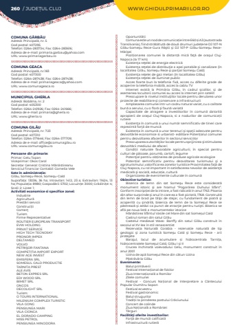 260 / JUDE%u021aUL CLUJ WWW.GHIDULPRIMARIILOR.ROCOMUNA G%u00c2RB%u0102UAdres%u0103: Principal%u0103, nr. 5Cod po%u0219tal: 407295Telefon: 0264-283734; Fax: 0264-283616; Adresa de e-mail: primaria.garbau@yahoo.comURL: www.primariagarbau.roCOMUNA GEACAAdres%u0103: Principal%u0103, nr.183Cod po%u0219tal: 407300Telefon: 0264-287438; Fax: 0264-287438; Adresa de e-mail: primariageaca@yahoo.comURL: www.comunageaca.roMUNICIPIUL GHERLAAdres%u0103: Bob%u00e2lna, nr. 2Cod po%u0219tal: 405300Telefon: 0264-241926; Fax: 0264-241666; Adresa de e-mail: primaria@gherla.roURL: www.gherla.roCOMUNA GIL%u0102U Adres%u0103: Principal%u0103, nr. 723Cod po%u0219tal: 407310Telefon: 0264-371646; Fax: 0264-371709; Adresa de e-mail: office@comunagilau.roURL: www.comunagilau.roPersoane din primarie:Primar: Gelu TopanViceprimar: Okos CarolSecretar General: Cristina M%u0103n%u0103stireanuServiciul financiar Contabil: Cornelia VeleSate %u00een administra%u021bie:Gil%u0103u, Some%u015fu-Rece, Some%u015fu-CaldSuprafa%u021ba:%u00a0 13036, 36 ha; Intravilan:%u00a0 1412, 23 a; Extravilan:%u00a0 11624, 13 ha; Popula%u021bia:%u00a08980; Gospod%u0103rii:%u00a05702; Locuin%u021be:%u00a03000; Gr%u0103dini%u021be:%u00a04; %u0218coli:%u00a02; Licee:%u00a01; Activitati economice si specifice zonei:IndustrieAgricultur%u0103Prest%u0103ri serviciiConstruc%u021biiComer%u0163TurismFirme Reprezentative:ROUTIER EUROPEAN TRANSPORTEVW HOLDINGPRIVAT SERVICEHIGH TECH TECNOSKYPRONOR IMPEXDELTAMEDVOLVOPETRI%u015eOR FANTANACOMPETITIA IMPORT EXPORTNEW AGE INVESTEMISFERA SRLSOMESUL CALD PRODUCTIETARNITA PRESTALE AVISBETON EXPRES SRLEDI WOOD SRLBIMET SRLONCOSDECOLIGHT SRLTurism: O TOURS INTERNATIONALMILENIUM COMPLEX TURISTICVILA GONGPENSIUNEA MARIVILA CIONCAEL DORADO CAMPINGMISS PETROLPENSIUNEA MINODORAOportunit%u0103%u021bi:Comuna este un nod de comunica%u021bie %u00eentre E60 %u0219i A3 (autostrada Transilvania), fiind str%u0103b%u0103tut%u0103 de dou%u0103 drumuri jude%u021bene DJ 107-N Gil%u0103u-Some%u015fu Rece-Gura R%u00e2%u015ftii %u015fi DJ 107-P Gil%u0103u-Some%u015fu ReceM%u0103ri%u015feiPozi%u021bionarea comunei la distan%u021b%u0103 mic%u0103 fa%u0163%u0103 de ora%u015ful ClujNapoca (la 17 km)Existen%u0163a re%u0163elei de energie electric%u0103Existen%u0163a re%u0163elei de distribu%u0163ie a apei potabile %u015fi canalizare (%u00een localitatea Gil%u0103u, Some%u015fu Rece %u015fi par%u0163ial Some%u015fu Cald)Existen%u0163a re%u0163elei de gaz metan (%u00een localitatea Gil%u0103u)Existen%u0163a re%u0163elei de iluminat publicAcces foarte bun la telefonia fix%u0103, acces cu diferite grade de acoperire la telefonia mobil%u0103, acces la cablu TVInternet exist%u0103 la Prim%u0103ria Gil%u0103u, %u00een cadrul %u015fcolilor, %u015fi de asemenea locuitorii comunei au acces la internet prin satelitPreocupare la nivelul institu%u0163iilor locale pentru derularea unor proiecte de reabilitare %u015fi conservare a infrastructuriiAmplasarea comunei %u00eentr-un cadru natural variat, cu o calitate bun%u0103 a aerului, cu o flor%u0103 %u015fi faun%u0103 variat%u0103Capacitate de atragere a investitorilor %u00een comun%u0103 datorit%u0103 apropierii de ora%u015ful Cluj-Napoca, si a nodurilor de comunica%u021bii rutiereExisten%u0163a %u00een comun%u0103 a unui num%u0103r semnificativ de tineri care reprezint%u0103 for%u0163%u0103 de munc%u0103Existen%u021ba %u00een comun%u0103 a unor terenuri %u015fi spa%u0163ii adecvate pentru dezvolt%u0103rile economice si urbanist- edilitare Poten%u021bialul comunei pentru dezvoltarea afacerilor %u00een sectorul serviciilorPreocuparea autorit%u0103%u0163ilor locale pentru sprijinirea %u015fi stimularea dezvolt%u0103rii mediului de afaceriCondi%u021bii naturale favorabile agriculturii, %u00een special pentru culturi de p%u0103ioase, porumb, cartofi, legumePoten%u0163ial pentru ob%u021binerea de produse agricole ecologicePoten%u021bial semnificativ pentru dezvoltarea turismului %u015fi a agroturismului ,valorificarea zonelor turistice Proximitatea fa%u0163%u0103 de Cluj-Napoca, cu rol important %u00een satisfacerea nevoilor de asisten%u0163%u0103 medical%u0103 %u015fi social%u0103, educa%u021bie, cultur%u0103Organizarea de evenimente culturale %u00een comun%u0103 Obiective turistice:Biserica de lemn din sat Some%u015fu Rece este considerat%u0103 monument istoric %u015fi are hramul %u201cPogor%u00e2rea Duhului Sf%u00e2nt%u201d. Conform inscrip%u021biei de la intrare, a fost ridicat%u0103 %u00een anul 1763. Pisania din altar surprinde %u015fi anul %u00een care ea a fost pictat%u0103, 1768. Construit%u0103 din lemn de brad pe t%u0103lpi de stejar, cu fundament de piatr%u0103 %u015fi acoperit%u0103 cu %u015findril%u0103, biserica de lemn de la Some%u015ful Rece se p%u0103streaz%u0103 %u015fi ast%u0103zi ca punct de atrac%u0163ie pentru turi%u015fti. Biserica se afl%u0103 pe noua list%u0103 a monumentelor istoriceM%u0103n%u0103stirea Sf%u00e2ntul Vasile cel Mare din sat Some%u0219ul CaldCastrul roman din satul Gil%u0103uCastelul medieval Wass- Banffy din satul Gil%u0103u construit %u00een secolul al XV-lea %u00een stil renascentist Rezerva%u021bia Natural%u0103 Corabia - rezerva%u021bie natural%u0103 de tip geologic %u015fi zona turistic%u0103 Some%u015fu Cald %u015fi Some%u015fu Rece - arii protejateBarajul, lacul de acumulare %u0219i hidrocentrala Tarni%u021ba, hidrocentralele Some%u015ful Cald, Gil%u0103u I %u015fi IICrucea %u00eenchinat%u0103 voievodului Gelu, monument construit %u00een anul 2001Uzina de ap%u0103 Some%u015ful Rece din c%u0103tun UzinaP%u0103str%u0103v%u0103ria Gil%u0103uEvenimente:Balul prim%u0103veriiFestival Interna%u021bional de folclorZiua Interna%u021bional%u0103 a RomilorZilele comuneiFestival - Concurs Na%u021bional de Interpretare a C%u00e2ntecului Popular Dumitru SoponFestival ecvestruFestival gastronomicBalul strugurilorTradi%u021bii la prinderea postului Cr%u0103ciunuluiConcert de colindeZiua Na%u021bional%u0103 a Rom%u00e2niei T%u00e2rguriFacilit%u00e3%u0163i oferite investitorilor:F