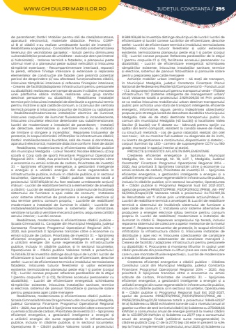 WWW.GHIDULPRIMARIILOR.RO JUDE%u021aUL CONSTAN%u021aA / 295de paratr%u0103snet; Dot%u0103ri: Mobilier pentru s%u0103li de clas%u0103/laboratoare, aparatur%u0103 electronic%u0103, materiale didactice. Pentru CORPul B al cl%u0103dirii s-au realizat urm%u0103toarele lucr%u0103ri de investi%u021bii: %u2022 Reabilitarea acoperi%u0219ului; %u2022 Consolid%u0103ri la funda%u021bii %u0219i sistematizarea terenului din vecin%u0103tatea garajelor; %u2022 Solu%u021bii pentru diminuarea vulnerabilit%u0103%u021bilor produse de umiditate - execu%u021bie dren perimetral %u0219i hidroizola%u021bii; %u2022 Izolarea termic%u0103 a fa%u021badelor, a plan%u0219eului peste ultimul nivel %u0219i a plan%u0219eului peste subsol ne%u00eenc%u0103lzit %u0219i %u00eenlocuirea t%u00e2mpl%u0103riei exterioare; %u2022 Recompartimentare interioar%u0103, repara%u021bii la pere%u021bi, refacere finisaje interioare %u0219i exterioare %u0219i repararea elementelor de construc%u021bie ale fa%u021badei care prezint%u0103 poten%u021bial pericol de desprindere %u0219i/ sau afecteaz%u0103 func%u021bionalitatea cl%u0103dirii, %u00eenlocuirea t%u00e2mpl%u0103riei interioare %u0219i refacerea finisajelor interioare; %u2022 Crearea de facilit%u0103%u021bi/adaptarea infrastructurii pentru persoanele cu dizabilit%u0103%u021bi: realizarea unei rampe de acces %u00een cl%u0103dire, montarea unei platforme oblice mobile, realizarea unui grup sanitar destinat persoanelor cu dizabilit%u0103%u021bi; %u2022 Reabilitarea instala%u021biei termice prin %u00eenlocuirea instala%u021biei de distribu%u021bie a agentului termic pentru %u00eenc%u0103lzire %u0219i ap%u0103 cald%u0103 de consum, a cazanului din centrala termic%u0103 proprie %u0219i %u00eenlocuirea corpurilor de %u00eenc%u0103lzire cu radiatoare; %u2022 Reabilitarea/modernizarea instala%u021biilor electrice de iluminat, %u00eenlocuirea corpurilor de iluminat fluorescente %u0219i incandescente, %u00eenlocuirea circuitelor electrice deteriorate sau subdimensionate, lucr%u0103ri de modernizare a instala%u021biei de paratr%u0103snet; %u2022 Instala%u021bii de detectare, semnalizare %u0219i avertizare incendiu %u0219i instala%u021bii de limitare %u0219i stingere a incendiilor; Repararea trotuarelor de protec%u021bie, %u00een scopul elimin%u0103rii infiltra%u021biilor la infrastructura cl%u0103dirii; Dot%u0103ri: mobilier/accesorii buc%u0103t%u0103rie, sal%u0103 de mese %u0219i dormitoare, aparatur%u0103 electronic%u0103, materiale didactice conform listei de dot%u0103riReabilitarea, modernizarea %u0219i eficientizarea cl%u0103dirilor publice din municipiul Medgidia - Liceul Teoretic Nicolae B%u0103lcescu (Corp %u0219coal%u0103 %u0219i Corp sal%u0103 de sport) Finan%u021bare: Programul Opera%u021bional Regional 2014 %u2013 2020, Axa prioritar%u0103 3: Sprijinirea tranzi%u021biei c%u0103tre o economie cu emisii sc%u0103zute de carbon, Prioritatea de investi%u021bii 3.1. %u2013 Sprijinirea eficien%u021bei energetice, a gestion%u0103rii inteligente a energiei %u0219i a utiliz%u0103rii energiei din surse regenerabile %u00een infrastructurile publice, inclusiv %u00een cl%u0103dirile publice, %u0219i %u00een sectorul locuin%u021belor, Opera%u021biunea B %u2013 Cl%u0103diri publice. Valoarea total%u0103 a proiectului: 12.157.815,68 lei Au fost realizate urm%u0103toarele ac%u021biuni/m%u0103suri: %u2022 Lucr%u0103ri de reabilitare termic%u0103 a elementelor de anvelop%u0103 a cl%u0103dirii; %u2022 Lucr%u0103ri de reabilitare termic%u0103 a sistemului de %u00eenc%u0103lzire/a sistemului de furnizare a apei calde de consum; Instalarea unor sisteme alternative de producere a energiei electrice %u0219i/sau termice pentru consum propriu; %u2022 Lucr%u0103rile de reabilitare/modernizare a instala%u021biei de iluminat %u00een cl%u0103diri; %u2022 Lucr%u0103rile de instalare/reabilitare/modernizare a sistemelor de climatizare, ventilare natural%u0103 %u0219i ventilare mecanic%u0103 pentru asigurarea calit%u0103%u021bii aerului interior; %u2022 Lucr%u0103ri conexe.Reabilitarea, modernizarea si eficientizarea cl%u0103dirii publice %u2013 %u0218coala Gimnazial%u0103 I.L. Caragiale din Municipiul Medgidia, jude%u021bul Constan%u021ba Finan%u021bare: Programul Opera%u021bional Regional 2014 %u2013 2020, Axa prioritar%u0103 3: Sprijinirea tranzi%u021biei c%u0103tre o economie cu emisii sc%u0103zute de carbon, Prioritatea de investi%u021bii 3.1. %u2013 Sprijinirea eficien%u021bei energetice, a gestion%u0103rii inteligente a energiei %u0219i a utiliz%u0103rii energiei din surse regenerabile %u00een infrastructurile publice, inclusiv %u00een cl%u0103dirile publice, %u0219i %u00een sectorul locuin%u021belor, Opera%u021biunea B %u2013 Cl%u0103diri publice Valoarea total%u0103 a proiectului: 14.150.616.32 lei Investitia distinge dou%u0103 tipuri de lucr%u0103ri: lucr%u0103ri de eficientizare %u0219i lucr%u0103ri conexe lucr%u0103rilor de eficientizare, descrise astfel: %u2022 Lucrari de eficientizare termic%u0103 a imobilului: termoizolarea fa%u021badelor, %u00eenlocuirea tuturor ferestrelor %u0219i u%u0219ilor exterioare existente, termoizolarea plan%u0219eului peste etaj 1 %u0219i parter (corpul C3); %u2022 Lucr%u0103ri conexe propuse: refacerea pardoselilor de la etajul 1 (pentru corpurile C1 %u0219i C2), facilitarea accesului persoanelor cu dizabilit%u0103%u021bi; %u2022 Lucr%u0103ri de eficientizare energetic%u0103: schimbarea t%u00e2mpl%u0103riilor existente, %u00eenlocuirea instala%u021biilor sanitare, termice %u0219i electrice, sistemul de panouri fotovoltaice %u0219i panourile solare pentru prepararea apei calde menajereReabilitarea, modernizarea %u0219i eficientizarea cl%u0103dirii publice %u2013 %u0218coala Gimnazial%u0103 Mircea Dragomirescu din municipiul Medgidia, jude%u021bul Constan%u021ba Finan%u021bare: Programul Opera%u021bional Regional 2014 %u2013 2020, Axa prioritar%u0103 3: Sprijinirea tranzi%u021biei c%u0103tre o economie cu emisii sc%u0103zute de carbon, Prioritatea de investi%u021bii 3.1. %u2013