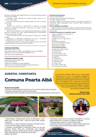 300 / JUDE%u021aUL CONSTAN%u021aA WWW.GHIDULPRIMARIILOR.ROdigitale a unit%u0103%u021bilor de %u00eenv%u0103%u021b%u0103m%u00e2nt din comuna Pecineaga, proiect finan%u021bat prin PNRRExtindere re%u021bea electric%u0103%u00a0 de interes public cartier Icil %u00een comuna PecineagaExtindere re%u021bea electric%u0103%u00a0de interes public cap I %u0219i II %u00een comuna Pecineaga%u00cen viitorSisteme de colectare %u0219i valorificare a gunoiului de grajdconstruire platform%u0103 destinat%u0103 gunoiului de grajd, proiect finan%u021bat prin AFMSprijinirea investi%u021biilor %u00een noi capacit%u0103%u021bi de producere a energiei electrice produs%u0103 din surse regenerabile(panouri fotovoltaice), proiect finan%u021bat prin PNRR%u00cenfiin%u021bare re%u021bea de gaze naturale proiect finan%u021bat, prin Anghel SalignyReabilitare %u0219i extinfdere alimentare cu ap%u0103 %u0219i canalizare menajer%u0103, proiect finan%u021bat prin Anghel SalignyModernizare str%u0103zi %u00een comuna Pecineaga, drumuri comunale 21/2019, proiect finan%u021bat prin Anghel SalignyCOMUNA PE%u015eTERAAdres%u0103: Izvorului, nr. 25ACod po%u0219tal: 907240; Telefon: 0241-856800; Fax: 0241-856872; Adresa de e-mail: primariapestera@yahoo.comURL: www.comunapestera.roCOMUNA POARTA ALB%u0102Adres%u0103: Calea Bucure%u015fti, nr. 25Cod po%u0219tal: 907245Telefon: 0241-853228; Fax: 0241-853228; Adresa de e-mail: registratura@primariapoartaalba.roURL: http://primariapoartaalba.roPersoane din primarie:Primar: Vasile DelicotiSecretar General: Camelia Cump%u0103na%u015fuContabil: Gabriela GogoiSuprafa%u021ba:%u00a06186,78 ha; Intravilan:%u00a0763,61 ha; Extravilan:%u00a05423,17 ha; Popula%u021bia:%u00a0 5208; Gospod%u0103rii:%u00a0 1945; Locuin%u021be:%u00a0 1673; Gr%u0103dini%u021be:%u00a0 3; %u0218coli:%u00a02; Licee:%u00a01; Cum se ajunge in localitate:Leg%u0103tura dintre satul Poarta Alb%u0103 %u0219i satul Nazarcea se face prin DJ 228A, iar leg%u0103tura dintre satul Poarta Alb%u0103 %u0219i cartier Via se face prin DJ 228Activitati economice si specifice zonei:Cultura cerealelor %u0219i a vi%u021bei de vieLegumicultur%u0103Cre%u0219terea animalelorPrest%u0103ri servicii %u00een agricultur%u0103Comer%u021bProduc%u021bia de ghea%u021b%u0103Servicii de transport marfuriProduc%u021bia de mobil%u0103Produc%u021bie de mobil%u0103Firme Reprezentative:Penitenciarul Poarta AlbaSc Agrobrava SrlSC Tritech SRLSC Cristian Impex SRLSC Duvigneau MurfatlarSc Gibis SrlSC H&State SrlProduc%u0103tori locali:Sc Agrobrava SrlSC Tritech SRLSC Cristian Impex SRLSC Duvigneau Murfatlar