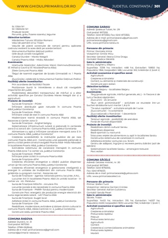 WWW.GHIDULPRIMARIILOR.RO JUDE%u021aUL CONSTAN%u021aA / 301Sc Gibis SrlSC H&State SrlProduse locale:Porumb, gr%u00e2u, floarea soarelui, legumeObiective turistice:M%u0103n%u0103stirea Tuturor Sfin%u021bilor RomaniValul de pam%u00e2nt al lui TraianValurile de piatr%u0103%u00a0 construite de romani pentru ap%u0103rarea castrului existent la acea%u00a0dat%u0103%u00a0pe aceste teritoriiMonumentul fo%u0219tilor de%u021binu%u021bi politiciCele dou%u0103 canale navigabile:Canalul Dun%u0103re %u2013 Marea Neagr%u0103Canalul Poarta Alb%u0103 %u2013 Midia, N%u0103vodariEvenimente:Hramurile bisericilor: Adormirea Maicii Domnului(Nazarcea), Sf. Mihail %u0219i Gavril %u0219i Sf. Nicolae(Poarta Alba)Zilele Comunei Poarta Alb%u0103T%u00e2rgul de toamn%u0103%u00a0 organizat de %u0218coala Gimnazial%u0103%u00a0 nr. 1 Poarta AlbaZiua Eroilor, celebrat%u0103%u00a0la Monumentul Fo%u0219tilor De%u021binuti PoliticiFacilit%u00e3%u0163i oferite investitorilor:Prin acordarea de facilit%u0103%u021bii fiscalePozi%u021bionare bun%u0103%u00a0 la %u00eentret%u0103ierea a dou%u0103%u00a0 c%u0103i navigabile importante din jude%u021bPosibilitatea dezvolt%u0103rii transportului de m%u0103rfuri %u0219i a altor activit%u0103%u021bi%u00a0 specifice pe Canalul Dun%u0103rea Marea Neagr%u0103%u00a0 dar %u0219i a agriculturiiProiecte de investi%u0163ii:Sursa de finan%u021bare %u2013 POIM%u00cenfiin%u021bare distribu%u021bie gaze naturale %u00een comuna Poarta Alb%u0103%u00a0jude%u021bul Constan%u021baSursa de finantare- PNDL%u00cenfiin%u021bare cre%u0219%u0103%u00a0de stat %u00een comuna Poarta Alb%u0103Modernizare tram%u0103 stradal%u0103%u00a0 %u00een comuna Poarta Alb%u0103, sat Nazarcea %u0219i Cartier zona DSursa de finan%u021bare - Anghel SalignySistematizare infrastructur%u0103%u00a0 rutier%u0103%u00a0 %u0219i pietonal%u0103%u00a0 %u00een cartierele zona D %u0219i zona E din%u00a0 Comuna Poarta Alb%u0103, jude%u021bul%u00a0Constan%u021baAlimentare cu ap%u0103%u00a0%u0219i %u00eenfiin%u021bare canalizare menajer%u0103%u00a0zona E %u00een comuna Poarta Alb%u0103, jude%u021bul Constan%u021ba%u201dCre%u0219terea accesibilit%u0103%u021bii la institu%u021biile publice de pe raza comunei Poarta Alb%u0103 prin%u00a0 Construirea unei pasarele pietonale %u0219i pentru cicli%u0219ti peste canalul navigabil Poarta Alb%u0103- Midia N%u0103vodari %u00een localitatea%u00a0Poarta Alb%u0103, jude%u021bul%u00a0Constan%u021baExtinderea sistemului de canalizare menajer%u0103%u00a0 %u00een comuna Poarta Alb%u0103 zona T %u0219i cartier via, jude%u021bul Constan%u021baSursa de finan%u021bare- PNRR%u00cenfiin%u021bare piste ciclisti %u00een comuna Poarta Alb%u0103Sursa de finan%u021bare-AFMCre%u0219terea eficien%u021bei energetice a cl%u0103dirii publice dispensar uman (p+1e) comuna Poarta Alb%u0103, jude%u021bul Constan%u021baCre%u0219terea eficien%u021bei energetice %u0219i gestionarea inteligent%u0103%u00a0 a energiei %u00een unitatea de %u00eenv%u0103%u021b%u0103m%u00e2nt din comuna Poarta Alb%u0103, gr%u0103dini%u021ba cu program normal - Nazarcea satSursa de finan%u021bare - agen%u021bia nationala pentru locuin%u021be, A.N.L.Lucuin%u021be Anl %u00een localitatea Poarta Alb%u0103 24 unit%u0103%u021bi locative - %u00een cartier via - str. PalatuluiSursa de finan%u021bare MDLPA - circulara l114Locuin%u021be sociale %u0219i de necesitate %u00een comuna Poarta Alb%u0103Sursa de finan%u021bare - PNRR- fondul pentru modernizareConstruire Parc energetic de produc%u021bie energie electric%u0103 din sursa regenerabila solar%u0103%u00a0- UAT Poarta Alb%u0103Sursa de finan%u021bare- buget localAsfaltare str%u0103zi %u00een comuna Poarta Alb%u0103, jude%u021bul Constan%u021baSursa de finan%u021bare- CNIReabilitare, modernizare, extindere %u0219i dotare c%u0103min cultural %u00een comuna Poarta Alb%u0103, Aleea Cantinei nr. 2, jude%u021bul Constan%u021baConstruire sediu prim%u0103rie Poarta Alb%u0103%u00a0COMUNA RASOVAAdres%u0103: Dun%u0103rii, nr. 31Cod po%u0219tal: 907250Telefon: 0769-052946; Adresa de e-mail: primariarasova@gmail.comcontact@primaria-rasova.roCOMUNA SARAIUAdres%u0103: %u015eoseaua Tulcei, Nr. 29Cod po%u0219tal: 907255Telefon: 0241-873355; Fax: 0241-873355; Adresa de e-mail: primariasaraiu@yahoo.comprimariasaraiu@gmail.comURL: www.primaria-saraiu.roPersoane din primarie:Primar: Dorinela IrimiaViceprimar: Emilia MicuSecretar General: Ileana Crina DraguContabil: Rodica D%u0103n%u0103il%u0103Sate %u00een administra%u021bie:Saraiu, Dulgheru, StejaruSuprafa%u021ba:%u00a0 11318 ha; Intravilan:%u00a0 468 ha; Extravilan:%u00a0 10850 ha; Popula%u021bia:%u00a01356; Gospod%u0103rii:%u00a0585; Locuin%u021be:%u00a0512; Gr%u0103dini%u021be:%u00a02; %u0218coli:%u00a02; Activitati economice si specifice zonei:Agricultur%u0103Cre%u015fterea animalelor Comer%u0163 cu alimente %u015fi materiale de construc%u0163iiConstruire%u00a0parc eolianObiective turistice:Schitul Stejaru - localitatea StejaruEvenimente:T%u00e2rg (produse agricole, m%u0103rfuri generale, etc.) - %u00een fiecare zi de luni a fiec%u0103rei s%u0103pt%u0103m%u00e2niZiua unirii - 24 ianuarie%u201cBun venit primim%u0103var%u0103!%u201d - activitate ce reune%u0219te %u00eentr-un buchet s%u0103rb%u0103torile lunii martie: 1, 8 %u0219i 9%u201cTe salut copil%u0103rie!%u201d - activitate ampl%u0103 de 1 iunieZiua comunei - 14 octombrieZiua na%u021bional%u0103 a Rom%u00e2niei - 1 decembrieFacilit%u00e3%u0163i oferite investitorilor:Terenuri agricole - posibilit%u0103%u0163i de arendareFor%u0163%u0103 de munc%u0103 disponibil%u0103Proiecte de investi%u0163ii:Reabilitare c%u0103min cultural SaraiuReabilitare dispensarBaz%u0103 sportiv%u0103 cu nocturn%u0103%u00cenlocuirea re%u021belei de alimentare cu ap%u0103 %u00een localitatea SaraiuConstruc%u021bia sistemului de canalizare %u00een comun%u0103Asfaltarea str%u0103zilor comunei cca. 16 kmCentru de ad%u0103post, %u00eengrijire %u0219i recreere pentru b%u0103tr%u00e2ni (azil de b%u0103tr%u00e2ni)Sistematizare localitate Saraiu - amenajare trotuar