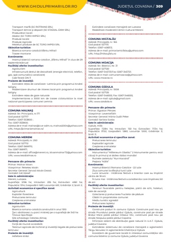 Transport marf%u0103 (SC ROTRANS SRL)Transport lemne %u015fi depozit (SC STADIAL EXIM SRL)Produc%u0103tori locali:Abator (SC TORO IMPEX SRL)Produse locale:Produse Agricole Mezeluri produse de SC TORO IMPEX SRLObiective turistice:Biserica romano-catolic%u0103 Sf%u00e2ntu MihailTrasee montaneEvenimente:Hramul bisericii romano-catolice ,,Sf%u00e2ntu Mihail%u201d %u00een ziua de 29 septembrie/anualFacilit%u00e3%u0163i oferite investitorilor:AgroturismInfrastructur%u0103 destul de dezvoltat%u0103 (energie electric%u0103, telefon, gaz, ap%u0103 comunal%u0103 %u0219i canalizare) Cale ferat%u0103 DN 11Proiecte de investi%u0163ii:Extindere re%u021bea de canalizare -Lemnia prin programul Andrei SalignyModernizare drumuri de interes local-prin programul Andrei SalignyExtindere re%u021bea de gaze naturaleImplementarea a 3000 km de trasee cicloturistice la nivel na%u021bional-participarea comunei LemniaCOMUNA MALNA%u015eAdres%u0103: Str. Principala, nr.171Cod po%u0219tal: 527117Telefon: 0267-353800 ; Fax: 0267-353800; Adresa de e-mail: malnas@cv.e-adm.ro, malnas2004@yahoo.comURL: https://primariamalnas.ro/COMUNA MERENIAdres%u0103: Principal%u0103, nr. 250Cod po%u0219tal: 527112Telefon: 0267-369970; Fax: 0267-369971; Adresa de e-mail: office@mereni.ro, istvanmolnar72@yahoo.comURL: www.kezdialmas.roPersoane din primarie:Primar: Molnar IstvanViceprimar:%u00a0Rekete%u0219%u00a0Istv%u00e1nSecretar General: Jancs%u00f3 Istv%u00e1n Dezs%u00f6Contabil: G%u00e1l J%u00f3zsefSate %u00een administra%u021bie:Mereni, LutoasaSuprafa%u021ba:%u00a0 5196 ha; Intravilan:%u00a0 235 ha; Extravilan:%u00a0 4961 ha; Popula%u021bia:%u00a01314; Gospod%u0103rii:%u00a0583; Locuin%u021be:%u00a0651; Gr%u0103dini%u021be:%u00a02; %u0218coli:%u00a02; Activitati economice si specifice zonei:Agricultur%u0103Explot%u0103ri forestierePrelucrarea lemnuluiCre%u015fterea animalelorObiective turistice:AgroturismBiserica romano-catolic%u0103 construit%u0103 %u00een anul 1510%u0162arc v%u00e2n%u0103toresc cu porci mistre%u0163i pe o suprafa%u0163%u0103 de 343 haTinovul Apa Ro%u015fieSite arheologic Cetatea Alma%u015fFacilit%u00e3%u0163i oferite investitorilor:For%u0163%u0103 de munc%u0103 accesibil%u0103Terenuri agricole de %u00eenchiriat %u015fi investi%u0163ii legate de prelucrarea lemnuluiProiecte de investi%u0163ii:Asfaltare str%u0103ziExtindere canalizare menajer%u0103%u00a0sat LutoasaReabilitare moderat%u0103%u00a0C%u0103min Cultural MereniCOMUNA MICFAL%u0102UAdres%u0103: Principal%u0103, nr. 165Cod po%u0219tal: 527115Telefon: 0367-408313; Adresa de e-mail: primariamicfalau@yahoo.comURL: http://mikoujfalu.roCOMUNA MOAC%u015eAAdres%u0103: Str. Bisericii, Nr. 31Cod po%u0219tal: 527120Telefon: 0267-345721;Fax: 0267-345721; Adresa de e-mail: comunamoacsa@yahoo.comURL: www.moacsa.roCOMUNA OJDULAAdres%u0103: Principal%u0103, nr. 1008Cod po%u0219tal: 527125Telefon: 0267-346555; Fax: 0267-346555; Adresa de e-mail: ojdula@gmail.comURL: www.ozsdola.roPersoane din primarie:Primar: %u00c1goston P%u00e9nzes%u00a0Viceprimar: LeventeT%u00f3th%u00a0Secretar General:%u00a0M%u00e1rta-Judit P%u00e9ter%u00a0Contabil: Sarlota Szaba%u00a0Sate %u00een administra%u021bie:Ojdula, HilibSuprafa%u021ba:%u00a0 11284 ha; Intravilan:%u00a0 150 ha; Extravilan:%u00a0 11134 ha; Popula%u021bia:%u00a0 3722; Gospod%u0103rii:%u00a0 1280; Locuin%u021be:%u00a0 1200; Gr%u0103dini%u021be:%u00a0 3; %u0218coli:%u00a03; Activitati economice si specifice zonei:Prelucrarea lemnuluiExploat%u0103ri agricoleCre%u015fterea animalelorObiective turistice:Monumentul %u201cMilleneum Obelisc%u201d 2 Monumente pentru eroii c%u0103zu%u0163i %u00een primul %u015fi al doilea r%u0103zboi mondialRuinele castelului %u201cKun Kocs%u00e1rd%u201dPe%u015ftera %u201cK%u0151lik%u201dEvenimente:Hramul Bisericii Romano-Catolice - 22 iulieZiua comunei la sf%u00e2r%u015fitul lunii iulieLuna ianuarie - %u00eent%u00e2lnirea festiv%u0103 a tinerilor care au %u00eemplinit v%u00e2rsta de 18 ani%u00a0 %u00cen luna mai - %u00eent%u00e2lnirea festiv%u0103 a cons%u0103tenilor care %u00eemplinesc 50 de aniFacilit%u00e3%u0163i oferite investitorilor:Terenuri favorabile pentru hele%u015ftee, p%u00e2rtii de schi, hoteluri, sate de vacan%u0163%u0103Colectarea %u015fi prelucrarea fructelor de p%u0103dureCl%u0103diri %u00een proprietatea comuneiMediu turistic agreabilPrelucrarea lapteluiProiecte de investi%u0163ii:Construire poduri %u00een comuna Ojdula: Construire pod nou pe strada Prundului peste p%u00e2r%u00e2ul Ojdula, construire pod pe strada Bra%u021bul Mare peste p%u00e2r%u00e2ul Orbaiul Mic, construire pod nou pe strada Nisipului peste p%u00e2r%u00e2ul Capolna%u00cenfiin%u021bare sistem de distribu%u021bie gaze natural %u00een U.A.T. Ojdula, jude%u021bul CovasnaExtinderea sistemului de canalizare menajer%u0103 a aglomer%u0103rii T%u00e2rgu Secuiesc %u00een aglomer%u0103rile Ghelin%u021ba %u0219i OjdulaEcosistem de guvernare local%u0103 %u00een interesul comunit%u0103%u021bilor din comuna Estelnic %u0219i comuna Ojdula, jude%u021bul CovasnaWWW.GHIDULPRIMARIILOR.RO JUDE%u021aUL COVASNA / 309
