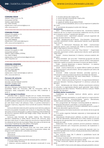 310 / JUDE%u021aUL COVASNA WWW.GHIDULPRIMARIILOR.ROCOMUNA OZUNAdres%u0103: Gabor Aron, nr. 75Cod po%u0219tal: 527130Telefon: 0267-331002; Fax: 0267-331003; Adresa de e-mail: primaria@ozun.roURL: www.ozun.roCOMUNA POIANAdres%u0103: Principal%u0103, nr. 10Cod po%u0219tal: 527140Telefon: 0267-368629; Fax: 0267-368629; Adresa de e-mail: poian@cosys.roURL: www.comunapoian.roCOMUNA RECIAdres%u0103: Principal%u0103, nr. 268Cod po%u0219tal: 527145Telefon: 0267-373803, 373799; Fax: 0267-373803; Adresa de e-mail: primariareci@gmail.comURL: http://reci.ro/COMUNA S%u00c2NZIENIAdres%u0103: Principal%u0103, nr. 337Cod po%u0219tal: 527150Telefon: 0267-366019; Fax: 0267-366019; Adresa de e-mail: sanzieni@cv.e-adm.roURL: www.sanzieni.roPersoane din primarie:Primar: Balogh TiborSecretar General: B%u00e1ndi LeventeContabil:%u00a0Gergely CsillaSate %u00een administra%u021bie:S%u00e2nzieni, Petriceni, Valea Seac%u0103, Casinu-MicSuprafa%u021ba:%u00a0 9670 ha; Intravilan:%u00a0 398 ha; Extravilan:%u00a0 9272 ha; Popula%u021bia:%u00a0 4563; Gospod%u0103rii:%u00a0 1679; Locuin%u021be:%u00a0 1913; Gr%u0103dini%u021be:%u00a0 4; %u0218coli:%u00a03; Cum se ajunge in localitate:%u201eS%u00e2nzieni este o a%u015fezare situat%u0103 %u00eentr-un mediu fermec%u0103tor, fiind una dintre perlele %u0162inutului Trei Scaune cu istoria ei demn%u0103 de respect %u015fi cu %u00eensemnatele sale evenimente religioase. A%u015fezarea se afl%u0103 %u00een jude%u0163ul Covasna, la un km %u015fi jum%u0103tate de T%u00e2rgu Secuiesc, pe cele dou%u0103 maluri ale p%u00e2r%u00e2ului Ca%u0219in, %u00een partea anterioar%u0103 a Mun%u0163ilor Ca%u0219inului, regiunea fiind numit%u0103 de localnici P%u0103m%u00e2ntul Sf%u00e2nt%u201d.Comuna S%u00e2nzieni este situat%u0103 %u00een partea nord-estic%u0103 a jude%u0163ului Covasna (la poalele Carpa%u0163ilor de Curbur%u0103, %u00een Depresiunea T%u00e2rgu Secuiesc), la limita teritorial%u0103 cu jude%u0163ul Harghita %u015fi este str%u0103b%u0103tut%u0103 de drumul na%u0163ional DN11B care leag%u0103 ora%u015ful T%u00e2rgu Secuiesc de satul Cozmeni. Comuna este format%u0103 din satele: Ca%u0219inu Mic, Petriceni, S%u00e2nzieni (re%u0219edin%u021ba) %u0219i Valea Seac%u0103. Centrul de comun%u0103, satul S%u00e2nzieni este situat %u00een Valea Ca%u015finului, pe drumul na%u0163ional DN113 la o distan%u0163%u0103 de 5 km de municipiul T%u00e2rgu Secuiesc %u015fi 40 de km de municipiul re%u015fedin%u0163%u0103 de jude%u0163 Sf%u00e2ntu Gheorghe.Activitati economice si specifice zonei:Depresiunea de Trei scaune fiind cea mai mare zon%u0103 de cultivare a cartofului, marea majoritate a localnicilor tr%u0103iesc din singurul venit ob%u0163inut din cultivarea cartofuluiAgricultur%u0103Silvicultur%u0103 Exploatarea %u015fi prelucrarea lemnuluiObiective turistice:Comuna ofer%u0103 multe puncte de atrac%u0163ie pentru vizitatori:1 -ruinele cet%u0103%u0163ii Tarnoczy2 -biserica romano-catolic%u0103 din S%u00e2nzieni construit%u0103 %u00een anul 14013 -muzeul satului din Ca%u0219inu Mic4 -izvorul de ap%u0103 mineral%u0103 din Ca%u0219inu Mic5 -moara din Valea Seac%u01036 -capela Sf. %u015etefan de pe dealul Perk%u01517 -flora %u015fi fauna deosebit%u0103, aerul curat %u015fi nepoluat al p%u0103durilor din zon%u01038 -apropierea de popasul turistic din C%u0103tru%u015fa.Evenimente:18.01. -%u00a0Hramul Bisericesc la Ca%u0219inul Mic %u00a0Aniversare Jubilar%u0103, C%u0103s%u0103toria de Aur %u015fi Argint Aniversarea c%u0103s%u0103toriilor de 25 %u015fi 50 de ani %u00een biserica romano- catolic%u0103 din S%u00e2nzieniCarnavalul Iernii -%u00a0 eveniment popular cultural organizat de grupul de dans folcloric %u201cPerk%u00f6%u201d08.03 -%u00a0S%u0103rb%u0103toarea de 8 Martie -%u00a0Ziua femeilor%u00a0 Organiza%u0163ie cutural%u0103, eveniment artistic, spectacolul elevilor %u015fcolii generale %u201cApor Istv%u00e1n%u201d15.03 -%u00a0 %u00cen Memoriam Revolu%u0163ia din 1848 -%u00a0 memorandul organizat pentru eroii revolu%u0163iei din 1848 la morm%u00e2ntul eroilor aflat %u00een fa%u0163a bisericii romano-catolice%u00cen prima Duminica a lunii mai %u201cZiua Mamei %u201c -%u00a0 Organiza%u0163ie cultural%u0103, eveniment artistic, spectacolul elevilor %u015fcolii generale %u201cApor Istv%u00e1n%u201dRusalii -%u00a0 Hramul bisericesc %u00een biserica romano-catolic%u0103 din S%u00e2nzieniPrima s%u00e2mb%u0103t%u0103%u00a0 din luna Mai %u201c %u00cent%u00e2lnirea grupurilor de dans popular interna%u0163ional%u201d - Eveniment cultural artistic interna%u0163ional organizat copiilor %u015fi tinerilor dansatori la scena pe dealul Perk%u00f610.08 - Hramul Bisericesc a satului Petriceni -%u00a0 la biserica romano%u00a0catolic%u0103 din Petriceni20.08 - Hramul Bisericesc la capela Sf%u00e2ntul%u00a0%u015etefan pe dealul Perk%u00f6 Eveniment cultural artistic, dansuri populare pe scena de pe dealul Perk%u00f618-20.08 - Zilele Culturale S%u00e2nzieni, activit%u0103%u0163i sportive %u015fi evenimente cultural-artistice pe terenul de fotbal din S%u00e2nzieni24.08 - Hramul Bisericesc din satul Valea-Seac%u0103 -%u00a0 la biserica romano- catolic%u0103 din Valea-Seac%u010311-18.10 - Zilele Culturale de Toamn%u0103 -%u00a0%u00een organizarea bibliotecii comunei S%u00e2nzieni %u201cKem%u00e9ny Zsigmond%u201d %u00een c%u0103minul cultural din S%u00e2nzieni 25.12 - S%u0103rb%u0103toarea de Cr%u0103ciun diferite evenimente artistice %u015fi culturale, %u00een organizarea elevilor %u015fcolii generale %u201cApor Istv%u00e1n%u201d %u015fi a grupului de dans folcloric %u201cPerk%u00f6%u201dla c%u0103minul cultural %u201cPet%u0151fi S%u00e1ndor%u201d din S%u00e2nzieniFacilit%u00e3%u0163i oferite investitorilor:Posibilitate de investi%u0163ii, terenuri oferite pentru parcuri industrialeCre%u015fte interesul asocia%u0163iilor cu profil agricol %u015fi a agricultorilor fa%u0163%u0103 de finan%u0163%u0103rile nerambursabile, pentru dezvoltarea, modernizarea asocia%u0163iilor %u015fi a fermelor agriolePrin programele de finan%u0163