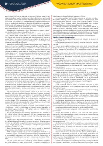 30 / JUDE%u021aUL ALBA WWW.GHIDULPRIMARIILOR.ROapoi %u00een locul cel mai de sus pun un %u015ferve%u0163el frumos legat cu un colac, o sticl%u0103 de %u0163uic%u0103 %u015fi un premiu %u00een bani. De la mire la mireas%u0103 %u015fi la biseric%u0103 %u00eenainte to%u0163i nunta%u015fii mergeau c%u0103l%u0103ri pe cai. %u00centor%u015fi de la cununie. To%u0163i %u00ee%u015fi %u00eencercau puterile s%u0103 urce %u00een v%u00e2rful armindenului %u015fi cel ce reu%u015fe%u015fte e r%u0103spl%u0103tit cu darurile din v%u00e2rful armindenului . %u00cencep%u00e2nd de la Pa%u015fti %u015fi p%u00e2n%u0103 la Rusalii cre%u015ftinii fac sfe%u015ftanii %u00een case iar la munte (la animale) la fiecare cruce din culmile de dealuri, pentru sem%u0103n%u0103turi - %u00een tot timpul anului.M%u0103nc%u0103rurile tradi%u0163ionale sunt %u201cBalmo%u015ful cu salat%u0103 verde%u201d c%u00e2rna%u0163ul %u015fi sl%u0103nina afumat%u0103, ou%u0103 fierte, etc.Hramul bisericii se face cu pomenirea v%u0103ilor %u015fi mun%u0163ilor c%u00e2nd cre%u015ftinii aduc multe daruri ca: prescuri, lum%u00e2n%u0103ri, t%u0103m%u00e2ie, vin, fructe, etc. Atunci se %u00eencheie a%u015fa numita asocia%u0163ie %u201ccununa anului%u201d care e format%u0103 din cre%u015ftinii ce se oblig%u0103 a da gr%u00e2ul, vinul %u015fi banii trebuincio%u015fi pentru prescuri %u00een timpul unui an. Ace%u015ftia sunt pomeni%u0163i la slujbele de peste an.La colindat se umbl%u0103 %u00een forma%u0163ii de crai, stea, turc%u0103 (capr%u0103) iar feciorii cei mai mari umbl%u0103 %u00een grupuri la colindat av%u00e2nd %u015fi c%u00e2te 1-2 muzican%u0163i. %u00cen trecut darurile ce se d%u0103deau la cr%u0103ciun constau %u00een bani, colaci, m%u0103nc%u0103ruri, b%u0103uturi, pr%u0103jituri. La sf%u00e2r%u015fitul celor 3 zile de colindat se adunau toate darurile %u015fi se f%u0103cea o petrecere la care invitau %u015fi pe cei ce i-au colindat. Ast%u0103zi darurile constau numai %u00een bani, colind%u0103torii se adun%u0103 la cele dou%u0103 c%u0103mine culturale, iar banii sunt str%u00e2n%u015fi cu ajutorul caprei (turca).P%u00e2n%u0103 %u00een 1960 ponorenii mai aveau %u015fi o tradi%u0163ie de munc%u0103. %u00cen orice var%u0103, aproape din fiecare cas%u0103 mergeau la %u201c%u0163ar%u0103%u201d c%u00e2te 1-3 persoane, care se %u00eentov%u0103r%u0103%u015feau %u00een echipe %u015fi luau cu ruptul la secerat holdele de pe Valea Mure%u015fului, de unde se %u00eentorceau cu gr%u00e2u %u00een schimbul muncii. La fel %u015fi la culesul porumbului toamna. Plecarea la %u201d%u0163ar%u0103%u201d era un fel de s%u0103rb%u0103toare precum este %u00een 21 mai ie%u015firea cu vitele la p%u0103%u015fune. Sosirea de la %u0163ar%u0103 constituia o s%u0103rb%u0103toare %u015fi mai mare, c%u00e2nd cei r%u0103ma%u015fi acas%u0103 %u00eei %u00eent%u00e2mpinau ca pe ni%u015fte eroi, ce printr-un efort de c%u00e2teva s%u0103pt%u0103m%u00e2ni au asigurat p%u00e2inea familiei. Un alt obicei ce a existat %u00een comuna Ponor %u00een decursul a dou%u0103 secole era adunarea s%u0103rb%u0103toreasc%u0103 de la %u201cPiatra Cr%u00eesnicului%u201d. Acest loc, asemeni s%u0103rb%u0103torii de pe Muntele G%u0103ina, constituia un prilej de %u00eent%u00e2lnire al fetelor %u015fi fl%u0103c%u0103ilor din Ponor %u015fi comunele limitrofe: Baia de Arie%u015f, Mogo%u015f, R%u00eeme%u0163, Lup%u015fa, Bistra. %u00cen fiecare an %u00een luna Rusaliilor preo%u0163ii din aceste comune se %u00eent%u00e2lneau acolo, f%u0103ceau maslu dup%u0103 care fl%u0103c%u0103ii %u015fi fetele care aducea merinde %u015fi b%u0103utur%u0103 de acas%u0103 %u00eencingeau o hor%u0103 la muzica l%u0103utarilor p%u00e2n%u0103 noaptea t%u00e2rziu. Acest obicei a durat p%u00e2n%u0103 %u00een anul 1965.Ie%u015firea la munte privind v%u0103ratul are loc la 21 mai. Aici erau preg%u0103tite st%u00e2nele %u015fi colibele pentru animale. %u00cenvoirea v%u0103ratului constituia o tradi%u0163ie %u015fi era urm%u0103rit%u0103 de 1-2 paznici. Taxa de gloab%u0103 constituia dublul taxei legale. P%u00e2n%u0103 %u00een 1970 m%u0103sura laptelui la oi se exprima %u00een Kg-br%u00e2nz%u0103/cap de oaie (de obicei 3 kg br%u00e2nz%u0103 %u015fi 1 kg unt). Dup%u0103 1970 amplasarea st%u00e2nelor fiind organizat%u0103 mai aproape de locuin%u0163ele gospodarilor m%u0103sura laptelui este un muls pentru 5 oi, dou%u0103 mulsuri pentru 10 oi, etc.Ca unitate de m%u0103sur%u0103 pentru lungime a fos folosit st%u00e2njenul = 6 picioare = 1,896 m. Ca unitate de m%u0103sur%u0103 pentru suprafa%u0163%u0103 a fost folosit iug%u0103rul cadastral = 576 pr%u0103jini p%u0103trate = 1600 st%u00e2njeni p%u0103tra%u0163i = 5,754 metri p%u0103tra%u0163i.Ca unitate de capacitate a fost %u015fi este folosit%u0103 litra (ferdela) = 20 l (15Kg), mirta = 1/2 litre, p%u0103trarul = 1/4 litre. Actualmente sunt folosite ca unit%u0103%u0163i de m%u0103sur%u0103: metrul, m2, litrul, kg, %u0163olul, litra (ferdela).P%u00e2n%u0103 %u00een anul 1974 comuna Ponor nu a avut t%u00e2rg de animale %u015fi m%u0103rfuri. Locuitorii comunei mergeau s%u0103 v%u00e2nd%u0103 %u015fi s%u0103 cumpere animale %u015fi m%u0103rfuri la t%u00e2rgurile din comunele %u00eenvecinate: S%u0103lciua, Lup%u015fa, Mogo%u015f, R%u00eeme%u0163, etc. Dup%u0103 1974 s-a %u00eenfiin%u0163at t%u00e2rg de animale %u015fi m%u0103rfuri %u2013 o dat%u0103 pe lun%u0103.De%u015fi Ponorul este o comun%u0103 de munte totu%u015fi %u00een decursul timpului s-au ridicat c%u00e2%u0163iva oameni de seam%u0103 din v%u0103ile ei.%u00cent%u00e2i vom aminti pe preo%u0163ii dinastiei Ciorbe%u015ftilor Ilie, Simion %u015fi Lauren%u0163iu Ciorbea. Din neamul lor s-a ridicat din partea %u0163%u0103r%u0103neasc%u0103 %u015fi protopopul Sighetului Iosif Ciorbea. Neamul Ciorbe%u015ftilor a culminat cu Victor Ciorbea fost prim ministru al Rom%u00e2niei (1996-1997).Tot din %u0163%u0103ranii de aici s-a ridicat %u015fi Victor Herdea, %u00eenv%u0103%u0163%u0103tor din Aiud, Chiril%u0103 Ioan preot %u00een Bucure%u