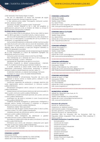 320 / JUDE%u021aUL D%u00c2MBOVI%u021aA WWW.GHIDULPRIMARIILOR.ROunde Voievodul Vlad %u0162epe%u015f tr%u0103gea %u00een %u0163eap%u0103.Tot aici s-a descoperit un tezaur de monede de argint imperiale romane din vremea imperiului romanA fost editat%u0103 prima edi%u0163ie %u201cMonografia Comunei Lucienioameni, obiceiuri, tradi%u0163ii%u201d%u00a0Pe teritoriu se afl%u0103 %u015fi un popas turistic %u201cAvr%u0103moaia%u201dComuna Lucieni dispune %u015fi de o sal%u0103 de preg%u0103tire %u015fi perfec%u0163ionare, precum %u015fi de un stadion de fotbal cu echipa %u00een divizia Onoare-Campionatul Jude%u0163eanFacilit%u00e3%u0163i oferite investitorilor:Comuna ofer%u0103 2705 ha de p%u0103dure, 116 ha izlaz, 1490 ha teren agricol, 88 ha gol alpin, %u00een muntele Cufuritu, masivul LeaotaAre circa 120 ha planta%u0163ie pomicol%u0103 de pruni, meri, dou%u0103 lacuri locale, unul %u201cLa domni%u015foara%u201d, %u00een suprafa%u0163a de 1,27 ha, al doilea %u201cLa Avr%u0103moaia%u201d, %u00een suprafa%u0163%u0103 de 3,29 ha.Comuna beneficieaz%u0103 de urm%u0103toarele utilit%u0103%u0163i: iluminat public pe toate drumurile comunale, serviciu local de salubritate, cablu TV, internet %u00een toat%u0103 comuna (institu%u0163ii %u015fi popula%u0163ie), telefonie digital%u0103, re%u0163ea de alimentare cu ap%u0103 prin Program SAPARD cu peste 700 gospod%u0103rii racordate.Pe teritoriu sunt dou%u0103 sta%u0163ii una de consacrare zgur%u0103 rezultat%u0103 de la COS T%u00e2rgovi%u015fte %u015fi a doua de exploatare agregate r%u00e2u (balastier%u0103), precum %u015fi 2 mori.Comuna Lucieni are acces direct la DN 72 %u015fi DJ 702B.R%u00e2ul D%u00e2mbovi%u0163a pe o distan%u0163%u0103 de circa 3 km %u015fi barajul de acumulare V%u0103c%u0103re%u015fti - Lucieni - Pier%u015finari.Apropierea de T%u00e2rgovi%u015fte %u015fi de gar%u0103 la circa 9 km.Prim%u0103rie modern%u0103, cu dotare corespunz%u0103toare - internet, cablu TV, %u00eenc%u0103lzire central%u0103, grupuri sanitare moderne.O %u015fcoal%u0103 modern%u0103 cu dou%u0103 nivele, av%u00e2nd s%u0103li de clas%u0103 cu laboratoare (informatic%u0103, fizic%u0103-chimie, anatomie), 4 grupuri sanitare moderne, beneficieaz%u0103 de internet, cablu TV.3 cabinete medicale, un cabinet stomatologic, farmacie.Transport %u00een comun al SC ATLASIB-MONDOTRANS.Proiecte de investi%u0163ii:Debirocratizarea %u0219i eficientizarea fluxurilor de lucru prin digitalizare %u0219i servicii online %u0219i mobile pentru cet%u0103%u021beni %u00een UAT Lucieni, jude%u021bul D%u00e2mbovi%u021baConstruire capacitate de produc%u021bie a energiei electrice din surse regenerabile pentru autoconsum %u00een comuna Lucieni, jude%u021bul D%u00e2mbovi%u021baEficientizare energetic%u0103 c%u0103min cultural %u00een comuna Lucieni, jude%u021bul D%u00e2mbovi%u021baModernizarea %u0219i eficientizarea sistemului de iluminat public %u00een satul Lucieni, comuna Lucieni, jude%u021bul D%u00e2mbovi%u021baReabilitare %u0219i modernizare baz%u0103%u00a0sportiv%u0103, sat Lucieni, comuna Lucieni, jude%u021bul D%u00e2mbovi%u021baAmenajare loc de joac%u0103%u00a0 %u0219i recreere %u00een zona Ciurari,comuna Lucieni, jude%u021bul D%u00e2mbovi%u021baCre%u0219terea eficien%u021bei energetice %u0219i gestionarea inteligent%u0103%u00a0 a energiei pentru %u0218coala Gimnazial%u0103%u00a0 %u0219i Gr%u0103dini%u021ba cu program normal %u00een comuna Lucieni, jude%u021bul D%u00e2mbovi%u021baReabilitare cl%u0103dire %u201cBloc specialisti%u201dConstruire sal%u0103%u00a0de sport %u0219colara-Proiect pilot %u00een satul Lucieni, comuna Lucieni, T14, P377, jude%u021bul D%u00e2mbovi%u021baInstalarea de sta%u021bii de re%u00eenc%u0103rcare pentru vehicule electrice %u00een comuna Lucieni, jude%u021bul D%u00e2mbovi%u021ba%u00cenfiin%u021bare re%u021bea inteligent%u0103%u00a0 de distribu%u021bie a gazelor naturale,comuna Lucieni, jude%u021bul D%u00e2mbovi%u021baExtindere %u0219i modernizare re%u021bea de ap%u0103%u00a0%u0219i canalizare %u00een comuna Lucieni, judeul D%u00e2mbovi%u021ba%u00cenfiin%u021barea unui centru de colectare a de%u0219eurilor prin aport voluntar %u00een comuna Lucieni, jude%u021bul D%u00e2mbovi%u021baPod peste r%u00e2ul D%u00e2mbovi%u021ba la limita administrative %u00eentre comunele Lucieni %u0219i V%u0103c%u0103re%u0219tiCOMUNA LUDE%u015eTICod po%u0219tal: 137270Telefon: 0345-527186,0743-008783; Fax: 0345-527186; Adresa de e-mail: ecretariat@primarialudesti.roCOMUNA LUNGULE%u0162UAdres%u0103: Principal%u0103Cod po%u0219tal: 137280Telefon: 0245-717502; Fax: 0245-717434; Adresa de e-mail: lunguletu_primaria@yahoo.comURL: www.primarialunguletu.roCOMUNA MALU CU FLORICod po%u0219tal: 137285Telefon: 0245-670114; Fax: 0245-670114; Adresa de e-mail: primaria.malu@yahoo.comURL: https://malucuflori.ro/COMUNA M%u0102NE%u015eTIAdres%u0103: Principal%u0103, nr. 1Cod po%u0219tal: 137290Telefon: 0245-732011; Fax: 0245-732159; Adresa de e-mail: contact@comunamanestidb.roURL: www.comunamanestidb.roCOMUNA M%u0102T%u0102SARUAdres%u0103: Sat Cre%u021bule%u0219ti, Nr. 78Cod po%u0219tal: 137295Telefon: 0728-006040; Fax: 0372-252117; Adresa de e-mail: primariamata_db@yahoo.comURL: https://www.primariamatasaru-db.ro/COMUNA MOGO%u015eANIAdres%u0103: str Morii , nr. 200Cod po%u0219tal: 137305Telefon: 0345-505220; Fax: 0345-505220; Adresa de e-mail: prmogosani@yahoo.comURL: www.mogosani.roMUNICIPIUL MORENIAdres%u0103: Str. Alexandru Ioan Cuza, Nr. 15Cod po%u0219tal: 135300Telefon: 0245-667265; Fax: 0245-667265; Adresa de e-mail: contact@primariamoreni.roURL: www.primariamoreni.roPersoane din primarie:Primar: ec. Gabriel PurcaruViceprimar: ec. %u0218tefania IonescuAdministrator public: Gheorghe BreazuSecretar general: jr. Carmen PopescuDirector economic: ec. Daniela SimionSuprafa%u021ba:%u00a0 3514 ha; Intravilan:%u00a0 610 ha; Extravilan:%u00a0 3167 ha; Popula%u021bia:%u00a0 20524; Gospod%u0103rii:%u00a0 7153; Locuin%u021be:%u00a0 7780; Gr%u0103dini%u021be:%u00a0 7; %u0218coli:%u00a04; Licee:%u00a02; Activitati ec