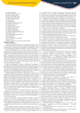 WWW.GHIDULPRIMARIILOR.RO JUDE%u021aUL D%u00c2MBOVI%u021aA / 325SC BENETON SERVSRL CASA PRIM TEXTIL SRLMOTRIS COMPANY SRLREGATA INVESTMENT SRLSC BENY LINK IMPEX SRLSC CARTAXO MAGIC SRLSC CECILIA SRLSC COMENA SRLSC DASKO EXPRES TRANS SRL SC DONATO COM SRLSC GIBOMAR SRLSC ITANCAR FILGRUP SRLSC MICRAL IMPEX SRLSC MONTE BIANCO SASC RAIMAN CAPUCINO SASC TURISM SAF%u0102NU%u021a%u0102 IMPEX SRLProduc%u0103tori locali:SUN GARDEN MANAGEMENTRALEX PUCIOASASC RISCONF SRLANDA CONFECTION CAMI SRLProduse locale:Croitorie: Lenjerii de pat, articole vestimentareObiective turistice:Obiective de vizitare:Serile Pucioasei sunt at%u00e2t de calme, odihnitoare %u015fi pl%u0103cute, %u00eenc%u00e2t %u00een acest or%u0103%u015fel balnear, oriunde %u0163i-ai %u00eendrepta pa%u015fii g%u0103se%u015fti o oaz%u0103 de lini%u015fte pentru medita%u0163ie. Strada Regal%u0103 te conduce prin centrul ora%u015fului ghidat de lampadare %u015fi ghirlande cu becuri multicolore.Parcul Independen%u021bei din Pucioasa se afl%u0103 %u00een partea de miaz%u0103noapte a centrului ora%u0219ului %u0219i a fost amenajat de veteranii din R%u0103zboiul de Independen%u021b%u0103 de la 1877%u20131878, %u00een secolul al 19-lea. Integrat %u00een zona istoric%u0103 a Sta%u021biunii Pucioasa, parcul este situat la 300 m de bazele de tratament. Parcul este o oaz%u0103 de verdea%u021ba, lini%u0219te %u0219i r%u0103coare pentru locuitorii ora%u0219ului, cu terenuri de sport, locuri de joac%u0103 pentru copii %u0219i spa%u021biu expozi%u021bional pentru lucr%u0103rile Taberei de sculptur%u0103 %u00een lemn de la Pucioasa. Studen%u021bii clasei de sculptur%u0103 de la Academia de Art%u0103 din Bucure%u0219ti, sub %u00eendrumarea lui Liviu Brezeanu, au expus %u00een parc %u0219ase sculpturi de mari dimensiuni, din lemn de stejar.Muzeul de Etnografie %u0219i Folclor - amatorii de cunoa%u015ftere a comorilor satului rom%u00e2nesc de odinioar%u0103 se pot opri, vizavi de %u201dCasa Portughez%u0103%u201d, la Muzeul de Etnografie %u0219i Folclor al ora%u015fului, ad%u0103postit %u00eentr-o cas%u0103 veche de dou%u0103 veacuri, ce a apar%u021binut familiei Dobre%u015ftilor, una din cele mai importante familii ce au marcat istoria ora%u0219ului Pucioasa. Muzeul ad%u0103poste%u0219te piese vestimentare %u0219i de uz casnic ce amintesc de via%u021ba de odinioar%u0103 a locuitorilor din Pucioasa.Cetatea Sf%u00e2nt%u0103 Noul Ierusalim %u2013 a%u0219ezam%u00e2nt cu o arhitectur%u0103 original%u0103, construit de arti%u0219tii plastici, so%u021bii Zidaru.%u00a0Gr%u0103dina acestei biserici este un spa%u0163iu impun%u0103tor, prin por%u0163ile de lemn ce acoper%u0103 aproape %u00een totalitate ceea ce se afl%u0103 dincolo de ele.Clubul Copiilor %u201dCasa Nicolae Mateescu%u201d bijuteria arhitectural%u0103 a ora%u0219ului ce dateaz%u0103 din perioada interbelic%u0103 (1938), oper%u0103 a cunoscutului arhitect Joja. Conacul a apar%u021binut unuia dintre cei mai importan%u021bi negustori ai urbei de alt%u0103dat%u0103.Muzeul Aviatic Pucioasa %u201dGeneral Cosmonaut Dumitru Prunariu%u201d - muzeul poart%u0103 numele primului %u0219i singurului rom%u00e2n care a zburat vreodat%u0103 %u00een spa%u021bial cosmic. Aici v%u0103 sunt prezentate machete de avioane %u00een miniatur%u0103 de la pionierii avia%u021biei rom%u00e2ne p%u00e2n%u0103 la cele din prezent. Colec%u021bia este unic%u0103 %u00een %u021bar%u0103 %u0219i str%u0103in%u0103tate.Lacul de acumulare de la Pucioasa construit %u00een anul 1974, la o altitudine de 400m, are ca scop acumularea %u0219i regularizarea apei r%u00e2ului Ialomi%u021ba. Odat%u0103 ajun%u0219i aici, frumuse%u021bea locului, fauna %u0219i vegeta%u021bia v%u0103 va uimi %u0219i v%u0103 va duce cu g%u00e2ndul la o delt%u0103. P%u0103durile de foioase %u0219i conifere din jur %u00eentregesc atmosfera peisagistic%u0103 a lacului de la Pucioasa.Monumentul Eroilor Ora%u0219ului Pucioasa ridicat %u00een centrul ora%u0219ului, la intersec%u021bia str%u0103zii Republicii cu strada F%u00e2nt%u00e2nelor, a fost inaugurat la 16 noiembrie 1925 %u00een cinstea eroilor c%u0103zu%u021bi %u00een Primul R%u0103zboi Mondial pentru re%u00eentregirea neamului, din anii 1916 %u2013 1918. Soldatul, simbol al eroismului %u0219i jertfei supreme a celor care au realizat Rom%u00e2nia Mare este turnat din bronz %u0219i are %u00een%u0103l%u021bimea de 2 metri.Gara feroviar%u0103 Pucioasa situat%u0103 pe Bulevardul G%u0103rii, este o impresionant%u0103 cl%u0103dire utilitar%u0103, datat%u0103 %u00eenc%u0103 din anul 1894, %u00eenscris%u0103 %u00een prezent %u00een Lista Monumentelor Istorice din Rom%u00e2nia %u0219i inclus%u0103 %u00een itinerariul %u201eG%u0103ri de poveste%u201d.%u201d La pas pe Strada Regal%u0103%u201d este un %u00eendemn spre a descoperi arhitectura frumoaselor case de vilegiatur%u0103 cu care ora%u0219ul se m%u00e2ndre%u0219te. Stilul neorom%u00e2nesc specific sta%u021biunilor balneare montane se reg%u0103se%u0219te la tot pasul. Vila %u201eAurelia%u201d, Casa %u201eMircescu%u201d, Hanul Z%u0103r%u0103foaia, Casa %u201dDobrescu%u201d sunt doar c%u00e2teva dintre casele ce spun povestea Pucioasei, an de an.BikeXpert Alpine Challenge%u00a0 - BikeXpert %u0219i Prim%u0103ria ora%u0219ului Pucioasa, prin competi%u021bia montan%u0103 BikeXpert Alpine Challenge%u00a0 %u00ee%u0219i propun s%u0103 sprijine stilul de via%u021b%u0103 energic %u0219i s%u0103n%u0103tos. Astfel promov%u0103m ciclismul, ca mod s%u0103natos %u0219i ecologic de petrecere al timpului liber %u00een natur%u0103. BikeXpert Alpine Challenge%u00a0este o provocare pentru to%u021bi riderii. Evenimentul vine %u00een %u00eent%u00e2mpinarea iubitorilor de natur%u0103, a cicli%u0219tilor amatori %u0219i profesioni%u0219ti ce doresc s%u0103-%u0219i testeze abilit%u0103%u021bile pe dou%u0103 ro%u021bi, %u00eentr-un cadru natural de neuitat.Road Grand Tour The Wall - din 2018 are loc cursa de ciclism pe %u0219osea cu punct de pornire ora%u0219ul Pucioasa prin The Wall - RGT Pucioasa. Exist