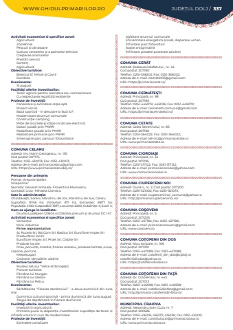 WWW.GHIDULPRIMARIILOR.RO JUDE%u021aUL DOLJ / 337Activitati economice si specifice zonei:Agricultur%u0103ZootehniePescuit %u015fi v%u00e2n%u0103toare Cultura cerealelor %u015fi a palntelor tehniceCre%u015fterea animalelorPrest%u0103ri serviciiComer%u0163Agricultur%u0103%u00a0Obiective turistice:Biserica Sf. Mihail %u015fi GavrilDun%u0103reaEvenimente:15 augustFacilit%u00e3%u0163i oferite investitorilor:Teren agricol pentru arendare sau concesionareCu respectarea legalit%u0103%u0163ii existenteProiecte de investi%u0163ii:Canalizare %u015fi%u00a0extindere re%u0163ea ap%u0103Proiect socialBaz%u0103 sportiv%u0103 - %u00een derulare la faz%u0103 S.F.Modernizare drumuri comunaleConstruc%u0163ie campingPiste de biciclete %u015fi sta%u0163ie inc%u0103rcare electric%u0103Dotari %u015fcoal%u0103%u00a0prin PNRRReabilitare%u00a0%u015fcoal%u0103 prin PNRRReabilitare primarie prin PNRRAmenajare parc panouri fotovoltaiceCOMUNA CELARUAdres%u0103: Inv. Marin Georgescu, nr. 135Cod po%u0219tal: 207175Telefon: 0351-430213; Fax: 0351-430213; Adresa de e-mail: primariacelaru@yahoo.comURL: https://www.primariacelarudolj.ro/Persoane din primarie:Primar: Antonie %u0218tefanViceprimar:%u00a0Secretar General: Mihaela- Florentina%u00a0Marinescu%u00a0Contabil:%u00a0Livia- Mihaela%u00a0Cismaru%u00a0Sate %u00een administra%u021bie:Ghizd%u0103ve%u015fti,%u00a0Soreni,%u00a0Marotinu de Jos,%u00a0Marotinu de Sus,%u00a0CelaruSuprafa%u021ba:%u00a0 9748 ha; Intravilan:%u00a0 871 ha; Extravilan:%u00a0 8877 ha; Popula%u021bia:%u00a04100; Gospod%u0103rii:%u00a01697; Locuin%u021be:%u00a02200; Gr%u0103dini%u021be:%u00a04; %u0218coli:%u00a04; Cum se ajunge in localitate:Drumul jude%u021bean DJ604 %u0219i DJ604A precum %u0219i drumul DC 147Activitati economice si specifice zonei:Comer%u021bulMica industrieFirme reprezentative:Sc Rucela Srl, Bd Com Srl, Badico Srl, Eurofiore Impex SrlProduc%u0103tori locali:Eurofiore Impex Srl, Proel Srl, Cisbite SrlProduse locale:Gr%u00e2u, porumb, maz%u0103re, floarea soarelui, produse lactate, ovine, caprine, porcineMe%u0219te%u0219ugari: Croitorie, t%u00e2mpl%u0103rie, zid%u0103rieObiective turistice:Muzeul satului %u201cVetre str%u0103mo%u015fe%u015ftiPuncte turistice:F%u00e2nt%u00e2na lui MurganF%u00e2nt%u00e2na lui Stelian F%u00e2nt%u00e2na lui PetcuEvenimente:S%u0103rb%u0103toarea %u201cFloarea salc%u00e2mului%u201d - a doua duminic%u0103 din luna maiDuminica cultural sportiv%u0103 - prima duminic%u0103 din luna augustT%u00e2rgul de s%u0103pt%u0103m%u00e2n%u0103 %u00een fiecare duminic%u0103Facilit%u00e3%u0163i oferite investitorilor:Investi%u021bii %u00een agricultur%u0103Prim%u0103ria pune la dispozi%u021bia investitorilor suprafe%u021be de teren %u0219i infrastructur%u0103 %u00een curs de modernizareProiecte de investi%u0163ii:Extindere canalizareAsfaltare drumuri comunaleEficientizare energetic%u0103 %u0219coal%u0103, dispensar uman%u00cenfiin%u021bare parc fotovoltaicSta%u021bie antigrindin%u0103 %u00cenfiin%u021bare perdele protec%u021bie salc%u00e2miCOMUNA CER%u0102TAdres%u0103: %u0218oseaua Calafatului , nr. 42Cod po%u0219tal: 207180Telefon: 0251-358202; Fax: 0251-358202; Adresa de e-mail: clcerat2015@gmail.comURL: https://primariacerat.ro/COMUNA CERN%u0102TE%u015eTIAdres%u0103: Principal%u0103, nr. 98Cod po%u0219tal: 207185Telefon: 0251-445072, 445036; Fax: 0251-445072; Adresa de e-mail: cernatesti.comuna@gmail.comURL: https://primariacernatesti.ro/COMUNA CETATEAdres%u0103: Calea Severinului, nr. 83Cod po%u0219tal: 207190Telefon: 0251-364022; Fax: 0251-364022; Adresa de e-mail: tehnic@primariacetate.roURL: www.primariacetate.roCOMUNA CIOROIA%u015eIAdres%u0103: Principal%u0103, nr. 34Cod po%u0219tal: 207195Telefon: 0251-317122; Fax: 0251-317122; Adresa de e-mail: primariacioroiasi@yahoo.com URL: www.comunacioroiasi.roCOMUNA CIUPERCENII NOIAdres%u0103: Dun%u0103rii, nr. 2; Cod po%u0219tal: 207200Telefon: 0251-321002; Fax: 0251-321072; Adresa de e-mail: ciuperceniinoi_comuna@yahoo.roURL: http://primariaciuperceniinoi.ro/COMUNA CO%u015eOVENIAdres%u0103: Principal%u0103, nr. 5Cod po%u0219tal: 207205Telefon: 0251-457186; Fax: 0251-457186; Adresa de e-mail: primariecosoveni@gmail.comURL: www.cosoveni.roCOMUNA CO%u0162OFENII DIN DOSAdres%u0103: Nicu Iovipale, nr. 166Cod po%u0219tal: 207210Telefon: 0251-447089; Fax: 0251-447089; Adresa de e-mail: cotofenii_din_dos@cjdolj.rocotofeniidindos@yahoo.roURL: https://cotofeniidindos.roCOMUNA CO%u0162OFENII DIN FA%u0162%u0102Adres%u0103: str. Cotofenilor, nr 442Cod po%u0219tal: 207013Telefon: 0251-446598; Fax: 0251-446598; Adresa de e-mail: cotofeniidinfata@gmail.comURL: http://primaria-cotofeniidinfata.ro/MUNICIPIUL CRAIOVAAdres%u0103: Alexandru Ioan Cuza, nr. 7Cod po%u0219tal: 200585Telefon: 0251-416235, 416237, 416236; Fax: 0251-415222; Adresa de e-mail: consiliulocal@primariacraiova.roURL: www.primariacraiova.ro