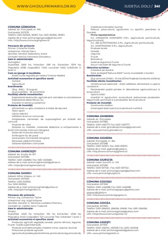 WWW.GHIDULPRIMARIILOR.RO JUDE%u021aUL DOLJ / 341COMUNA G%u00c2NGIOVAAdres%u0103: Str. Principal%u0103, nr. 199Cod po%u0219tal: 207275Telefon: 0251-351505, 351811; Fax: 0251-351505, 351811; Adresa de e-mail: primariagingiova@yahoo.comURL: http://www.comunagingiova.ro/Persoane din primarie:Primar: Cristache PredaViceprimar: Marcel OlaruSecretar General: Sadoveanu IoanaContabil: Marina Genoveva DimulescuSate %u00een administra%u021bie:Como%u015fteniSuprafa%u021ba:%u00a0 5618 ha; Intravilan:%u00a0 299 ha; Extravilan:%u00a0 5319 ha; Popula%u021bia:%u00a0 2538; Gospod%u0103rii:%u00a0 1400; Locuin%u021be:%u00a0 1400; Gr%u0103dini%u021be:%u00a0 2; %u0218coli:%u00a02; Cum se ajunge in localitate:Exist%u0103%u00a0curse regulate pe traseul Craiova-NedeiaActivitati economice si specifice zonei:Comer%u0163Agricultur%u0103%u00a0Evenimente:T%u00e2rg - B%u00e2lci - 15 AugustZiua localit%u0103%u0163ii - 26 octombrieFacilit%u00e3%u0163i oferite investitorilor:Exploatarea terenurilor agricole prin arendare %u0219i concesionareExploatarea albiei R%u00e2ului JiuInvesti%u021bii %u00een sectorul zootehnicProiecte de investi%u0163ii:Alimentare cu ap%u0103 ,canalizare %u0219i sta%u021bie de epurareTeren sportC%u0103min b%u0103tr%u00e2ni Asfaltare drumuri comunaleAmplasarea camerelor de supraveghere pe str%u0103zile din comun%u0103Proiecte de viitorDotarea cu mobilier ,materiale didactice %u0219i echipamente a %u0218colii Gimnaziale ,Comuna G%u00e2ngiovaSta%u021bie de %u00eenc%u0103rcare electric%u0103Amenajare loc de joac%u0103Gard %u0219coala Gimnazial%u0103 G%u00e2ngiovaRenovare cl%u0103dire Prim%u0103rie Dotarea biblioteci comunaleCOMUNA GHERCE%u015eTIAdres%u0103: Str. Eroilor Nr.107Cod po%u0219tal: 207280Telefon: 0251-450580; Fax: 0251-450580; Adresa de e-mail: primariaghercesti@yahoo.roURL: https://primariaghercesti.ro/COMUNA GHIDICIAdres%u0103: Mihai Viteazu, nr. 140Cod po%u0219tal: 207456Telefon: 0251-323352; Fax: 0251-323352; Adresa de e-mail: primaria.ghidici@yahoo.roURL: http://primariaghidici.roPersoane din primarie:Primar: Ing. Constantin TacheViceprimar: Ing. Virgil SclipceaSecretar General: Jr. Ramona Loredana PomacuContabil: Ec. C%u0103t%u0103lin Sorin Tudoric%u0103Sate %u00een administra%u021bie:GhidiciSuprafa%u021ba:%u00a0 4520 ha; Intravilan:%u00a0 194 ha; Extravilan:%u00a0 4326 ha; Popula%u021bia:%u00a02440; Gospod%u0103rii:%u00a0721; Locuin%u021be:%u00a0740; Gr%u0103dini%u021be:%u00a01; %u0218coli:%u00a01; Activitati economice si specifice zonei:Produc%u021bie agricol%u0103 vegetal%u0103( cereale, plante tehnice, legume, fructe- livad%u0103 superintensiv%u0103)Produse animale(complex cre%u0219tere ovine, caprine, bovine) Prelucrare produse agricole Agricultur%u0103%u00a0(cereale, plante tehnice, pomicultur%u0103, legumicultur%u0103);Cre%u0219terea animalelor (suine);Pescuit, piscicultur%u0103, agroturism cu specific pesc%u0103resc la Dun%u0103re).Firme reprezentative:S.C. ONSANTIN AGROSERV S.R.L. (agricultur%u0103, pomicultur%u0103, legumicultur%u0103);S.C. ABI AGROTRADING S.R.L. (agricultur%u0103, pomicultur%u0103);S.C. MARTRADING S.R.L. (agricultur%u0103)Produse localeCerealeLegumeFructeBr%u00e2nzeturiCoserve legume %u0219i fructeSucuri naturale de legume %u0219i fructeObiective turistice:Croaziere pe dun%u0103re Zona protejat%u0103%u201dNatura 2000%u201d-lunca inundabil%u0103 a Dun%u0103riiEvenimente:Ziua comunei Ghidici - 21 mai (Sfin%u021bii %u00cemp%u0103ra%u021bi Constantin %u0219i Elena)Facilit%u00e3%u0163i oferite investitorilor:Infrastructur%u0103 adecvat%u0103 - str%u0103zi asfaltate, alimentare cu ap%u0103 %u0219i canalizare;Parteneriate public-private %u00een dezvoltarea agroturismului %u0219i acvaculturii.Oportunit%u0103%u021bi:Investi%u021bii %u00een agroturism, acvacultur%u0103, prelucrarea produselor legumicole, pomicole %u0219i a produselor de acvacultur%u0103Proiecte de investi%u0163ii:Constructie stadionAmenajare bazin piscicol %u0219i pensiune turistic%u0103COMUNA GHINDENIAdres%u0103: str. PrincipalaCod po%u0219tal: 207366Telefon: 0251-455777; Fax: 0251-455777; Adresa de e-mail: ghindeniprimaria@gmail.comURL: www.primaria-ghindeni.roCOMUNA GIGHERAAdres%u0103: Principal%u0103, nr. 184Cod po%u0219tal: 207285Telefon: 0251-353011; Fax: 0251-353011; Adresa de e-mail: gighera@cjdolj.roURL: http://www.comunagighera.ro/COMUNA GIURGI%u0162AAdres%u0103: Calea Dun%u0103rii, nr. 123Cod po%u0219tal: 207295Telefon: 0251-357122 ; Fax: 0251-357122 ; Adresa de e-mail: primariagiurgita@yahoo.comURL: www.primariagiurgita.roCOMUNA GOGO%u015eUCod po%u0219tal: 207300Telefon: 0251-445098; Fax: 0251-445098; Adresa de e-mail: primariagogosu@yahoo.comgogo%u015fu@cjdolj.roURL: http://www.primariagogosu.roCOMUNA GOICEACod po%u0219tal: 207305Telefon: 0251-256003, 256056, 256161; Fax: 0251-256056; Adresa de e-mail: primariagoicea@yahoo.comURL: https://www.comunagoicea.ro/COMUNA GOIE%u015eTICod po%u0219tal: 207310Telefon: 0251-452154, 452108; Fax: 0251-452108; Adresa de e-mail: primariagoiesti@yahoo.comURL: www.primariagoiesti.ro