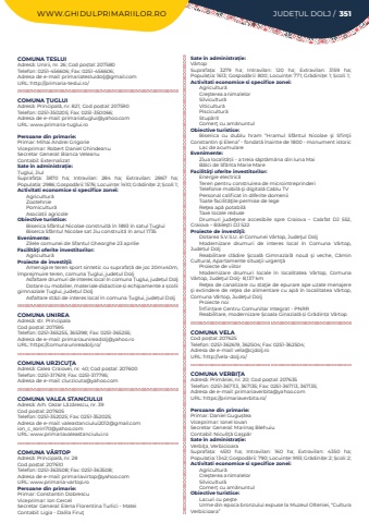 WWW.GHIDULPRIMARIILOR.RO JUDE%u021aUL DOLJ / 351COMUNA TESLUIAdres%u0103: Unirii, nr. 26; Cod po%u0219tal: 207580Telefon: 0251-456606; Fax: 0251-456606; Adresa de e-mail: primariatesluidolj@gmail.comURL: http://primaria-teslui.ro/COMUNA %u0162UGLUIAdres%u0103: Principal%u0103, nr. 821; Cod po%u0219tal: 207590Telefon: 0251-350205; Fax: 0251-350066; Adresa de e-mail: primariatuglui@yahoo.comURL: www.primaria-tuglui.roPersoane din primarie:Primar:%u00a0Mihai Andrei GrigorieViceprimar: Robert Daniel GhindeanuSecretar General: Bianca VeleanuContabil: ExternalizatSate %u00een administra%u021bie:%u021auglui, JiulSuprafa%u021ba:%u00a0 3870 ha; Intravilan:%u00a0 284 ha; Extravilan:%u00a0 2867 ha; Popula%u021bia:%u00a02986; Gospod%u0103rii:%u00a01576; Locuin%u021be:%u00a01410; Gr%u0103dini%u021be:%u00a02; %u0218coli:%u00a01; Activitati economice si specifice zonei:Agricultur%u0103ZootehniePomicultur%u0103Asocia%u021bii agricoleObiective turistice:Biserica Sf%u00e2ntul Nicolae construit%u0103 %u00een 1893 %u00een satul %u021augluiBiserca Sf%u00e2ntul Nicolae sat Jiu construit%u0103 %u00een anul 1735Evenimente:Zilele comunei de Sfantul Gheorghe 23 aprilieFacilit%u00e3%u0163i oferite investitorilor:Agricultur%u0103Proiecte de investi%u0163ii:Amenajare teren sport sintetic cu suprafa%u021b%u0103 de joc 20mx40m, %u00eemprejmuire teren, comuna %u021auglui, jude%u021bul DoljAsfaltare drumuri de interes local %u00een comuna %u021auglui, jude%u021bul DoljDotare cu mobilier, materiale didactice %u0219i echipamente a %u0219colii gimnaziale %u021auglui, jude%u021bul DoljAsfaltare st%u0103zi de interes local %u00een comuna %u021auglui, jude%u021bul DoljCOMUNA UNIREAAdres%u0103: str. PrincipalaCod po%u0219tal: 207595Telefon: 0251-365255, 365398; Fax: 0251-365255; Adresa de e-mail: primariaunireadolj@yahoo.roURL: https://comunaunireadolj.ro/COMUNA URZICU%u0162AAdres%u0103: Calea Craiovei, nr. 40; Cod po%u0219tal: 207600Telefon: 0251-317619; Fax: 0251-317795; Adresa de e-mail: clurzicuta@yahoo.comCOMUNA VALEA STANCIULUIAdres%u0103: Arh. Cezar L%u0103z%u0103rescu, nr. 39Cod po%u0219tal: 207605Telefon: 0251-352025; Fax: 0251-352025; Adresa de e-mail: valeastanciului2012@gmail.comion_c_sorin70@yahoo.comURL: www.primariavaleastanciului.roCOMUNA V%u00c2RTOPAdres%u0103: Principal%u0103, nr. 28Cod po%u0219tal: 207610Telefon: 0251-363508; Fax: 0251-363508; Adresa de e-mail: primariavirtop@yahoo.comURL: www.primaria-vartop.roPersoane din primarie:Primar: Constantin DobrescuViceprimar: Ion CercelSecretar General: Elena Florentina Turlici - MateiContabil: Ligia - Dalila Firu%u0163Sate %u00een administra%u021bie:V%u00e2rtopSuprafa%u021ba:%u00a0 3279 ha; Intravilan:%u00a0 120 ha; Extravilan:%u00a0 3159 ha; Popula%u021bia:%u00a01613; Gospod%u0103rii:%u00a0800; Locuin%u021be:%u00a0771; Gr%u0103dini%u021be:%u00a01; %u0218coli:%u00a01; Activitati economice si specifice zonei:Agricultur%u0103Cre%u015fterea animalelorSilvicultur%u0103Viticultur%u0103Piscicultur%u0103Stup%u0103ritComer%u0163 cu am%u0103nuntulObiective turistice:Biserica cu dublu hram %u201cHramul Sf%u00e2ntul Nicolae %u015fi Sfin%u0163ii Constantin %u015fi Elena%u201d - fondat%u0103 %u00eenainte de 1800 - monument istoricLac de acumulareEvenimente:Ziua localit%u0103%u021bii - a treia s%u0103pt%u0103m%u00e2na din luna MaiB%u00e2lci de Sf%u0103nta Marie MareFacilit%u00e3%u0163i oferite investitorilor:Energie electric%u0103Teren pentru construirea de microintreprinderiTelefonie mobil%u0103 %u015fi digital%u0103 Cablu TVPersonal calificat %u00een diferite domeniiToate facilit%u0103%u0163ile permise de legeRe%u0163ea ap%u0103 potabil%u0103Taxe locale reduse Drumuri jude%u0163ene accesibile spre Craiova %u2013 Calafat DJ 552, Craiova %u2013 B%u0103ile%u015fti DJ 522Proiecte de investi%u0163ii:Dotarea S.V.S.U. al Comunei V%u00e2rtop, Jude%u0163ul DoljModernizare drumuri de interes local %u00een Comuna V%u00e2rtop, Jude%u021bul DoljReabilitare cl%u0103dire %u015ecoal%u0103 Gimnazial%u0103 nou%u0103 %u015fi veche, C%u0103min Cultural, Apartamente situa%u0163ii urgen%u0163%u0103Proiecte de viitor Modernizare drumuri locale %u00een localitatea V%u00e2rtop, Comuna V%u00e2rtop, Jude%u0163ul Dolj- 8,137 km Re%u0163ea de canalizare cu sta%u0163ie de epurare ape uzate menajere %u015fi extindere de re%u0163ea de alimentare cu ap%u0103 %u00een localitatea V%u00e2rtop, Comuna V%u00e2rtop, Jude%u0163ul DoljProiecte noi%u00cenfiin%u021bare Centru Comunitar Integrat - PNRRReabilitare, modernizare %u0218coala Ginazial%u0103%u00a0%u0219i Gr%u0103din%u021ba V%u00e2rtopCOMUNA VELACod po%u0219tal: 207625Telefon: 0251-362619, 362504; Fax: 0251-362504; Adresa de e-mail: vela@cjdolj.roURL: http://vela-dolj.ro/COMUNA VERBI%u0162AAdres%u0103: Prim%u0103riei, nr. 20; Cod po%u0219tal: 207635Telefon: 0251-367113, 367135; Fax: 0251-367113, 367135; Adresa de e-mail: primariaverbita@yahoo.comURL: https://primariaverbita.ro/Persoane din primarie:Primar: Daniel Gugu%u0219teaViceprimar: Ionel IovanSecretar General: Marina%u015f BlehuiuContabil: Niculi%u0163%u0103 Ga%u015fp%u0103rSate %u00een administra%u021bie:Verbi%u0163a, VerbicioaraSuprafa%u021ba:%u00a0 4510 ha; Intravilan:%u00a0 160 ha; Extravilan:%u00a0 4350 ha; Popula%u021bia:%u00a01342; Gospod%u0103rii:%u00a0790; Locuin%u021be:%u00a0993; Gr%u0103dini%u021be:%u00a02; %u0218coli:%u00a02; Activitati economice si specifice zonei:Agricultur%u0103Cre%u015fterea animalelorSilvicultur%u0103Comer%u0163 cu am%u0103nuntulObiective turistice:Lacuri cu pe%u015fteUrme din epoca bronzului expuse la Muzeul Olteniei, %u201cCultura Verbicioara%u201d