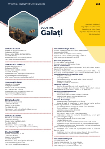 WWW.GHIDULPRIMARIILOR.RO 353Suprafa%u021b%u0103: 4.466 km%u00b2Popula%u021bie: 642.337 locuitoriRe%u0219edin%u021b%u0103 de jude%u021b: Gala%u021biPopula%u021bia re%u0219edin%u021bei de jude%u021b: 332.154 locuitoriJUDE%u021aULGala%u021biCOMUNA BARCEAAdres%u0103: Str. Mihai Eminescu nr.1Cod po%u0219tal: 807005Telefon: 0236-335701, 335702, 335703; Fax: 0236-335701; Adresa de e-mail: barcea@gl.e-adm.roURL: www.primaria-barcea.roCOMUNA B%u0102L%u0102B%u0102NE%u015eTIAdres%u0103: Principal%u0103, nr. 22Cod po%u0219tal: 807010Telefon: 0236-348508, 348625; Fax: 0236-348508; Adresa de e-mail: alabanesti@gl.e-adm.roprimariabalabanesti@yahoo.comURL: https://www.comunabalabanesti.ro/COMUNA B%u0102L%u0102%u015eE%u015eTIAdres%u0103: str. PrincipalaCod po%u0219tal: 807020Telefon: 0236-334782, 334709; Fax: 0236-334782, 334709; Adresa de e-mail: balasesti@gl.e-adm.roprimariabalasesti@yahoo.comURL: www.primariabalasesti.roCOMUNA B%u0102LENIAdres%u0103: Principal%u0103, nr. 30Cod po%u0219tal: 807025Telefon: 0236-330530; Fax: 0236-330430; Adresa de e-mail: primariabaleni@yahoo.comURL: www.comunabaleni.roCOMUNA B%u0102NEASAAdres%u0103: str. Principala FNCod po%u0219tal: 807030Telefon: 0236-348750, 341347; Fax: 0236-341347; Adresa de e-mail: baneasa@gl.e-adm.roURL: https://www.primariacomuneibaneasa.ro/ORA%u0218UL BERE%u015eTIAdres%u0103: Trandafirilor, nr. 28Cod po%u0219tal: 805100Telefon: 0236-342524; Fax: 0236-342316; Adresa de e-mail: office@orasulberesti.roprimariaberesti@yahoo.comURL: https://www.orasulberesti.ro/COMUNA BERE%u015eTI-MERIAAdres%u0103: sat Bere%u0219ti-Meria, comuna Bere%u0219ti-MeriaCod po%u0219tal: 807035Telefon: 0236-342418; Fax: 0236-342434; Adresa de e-mail: beresti_meria@gl.e-adm.roURL: www.comunaberesti-meria.roPersoane din primarie:Primar: Adrian Marian Ciuc%u0103Secretar General: jr. B%u0103nuc Lumini%u0163aSate %u00een administra%u021bie:Bere%u015fti-Meria, Slivna, Onciu,%u00a0Prodane%u015fti, Puricani, S%u0103seni,%u00a0Alde%u015fti, %u015eipote,%u00a0Ple%u015fa, Balinte%u015ftiSuprafa%u021ba:%u00a010812,44 ha; Intravilan:%u00a0957 ha; Extravilan:%u00a09855,44 ha; Popula%u021bia:%u00a03575; Gospod%u0103rii:%u00a01131; Locuin%u021be:%u00a01716; Gr%u0103dini%u021be:%u00a05; %u0218coli:%u00a04; Activitati economice si specifice zonei:Cre%u015fterea animalelorCultura plantelorCultivarea plantelor (porumb, gr%u00e2u, floarea soarelui)Cre%u015fterea animalelorComer%u0163 cu produse alimentareObiective turistice:Biserica din satul Bere%u0219ti-Meria secolele XIV-XVSitul arheologic de la Puricani %u201cPoarta B%u00e2zanului%u201d, a%u0219ezare secolele XI-X -a Chr, Hallstatt, 10000 a Chr, PaleoliticFacilit%u00e3%u0163i oferite investitorilor:Arendare terenuriSpa%u0163ii pentru depozitare %u015fi comer%u0163 cu cerealeMaterii prime pentru produse alimentareFor%u0163%u0103 de munc%u0103 calificat%u0103%u00a0Proiecte de investi%u0163ii:Re%u021bea de ap%u0103%u00a0%u0219i canalizare %u00een satul SlivnaRe%u021bea de ap%u0103%u00a0 %u0219i canalizare %u00een satul Bere%u0219ti-Meria, proiect realizat %u00een parteneriat cu APA CANAL GALA%u021aI SASal%u0103 de manifestari Social-Culturale %u00een satul Balinte%u0219tiTeren multisport %u00een satul Ple%u0219aAchizi%u021bionare autoutilitar%u0103%u00a0IVECOPROIECTE %u00ceN DERULARE:Parc de joc%u0103%u00a0pentru%u00a0copii %u00een satul B%u0103linte%u0219tiModernizare str%u0103zi %u00een comuna Bere%u0219ti-Meria, 4 km prin programul Anghel SalignyConstruire dispensar uman %u00een satul PleaPROIECTE PROPUSE:Continuare modernizare str%u0103zi %u00een comuna Bere%u0219ti-MeriaModernizare re%u021bea iluminat public %u00een comuna Bere%u0219ti-Meria%u00cenfiin%u021barea unui sistem de fose septice inteligente/canalizare pentru satele Ple%u0219a %u0219i B%u0103linte%u0219ti%u00cenfiin%u021barea unui sistem de supraveghere video %u00een comuna Bere%u0219ti-MeriaReabilitare c%u0103minul cultural, blocul %u0219i %u0219coala din satul SlivnaConstruirea unui c%u0103min cultural %u00een satul Ple%u0219aCOMUNA BRANI%u015eTEACod po%u0219tal: 807050Telefon: 0236-332408; Fax: 0236-332450; Adresa de e-mail: branistea@gl.e-adm.roURL: https://www.primariabranistea.ro/