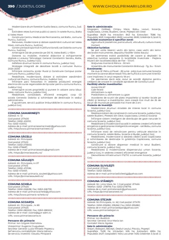 390 / JUDE%u021aUL GORJ WWW.GHIDULPRIMARIILOR.ROModernizare drum forestier Susita Seaca, comuna Runcu, Jud.GorjExtindere re%u021bea iluminat public %u0219i casnic %u00een satele Runcu, Balta %u0219i Valea MareConstruire Centru Medical de Permanenta, sat Balta , comuna Runcu, Jud.GorjRenovare, modernizare %u0219i dotare a%u0219ez%u0103m%u00e2nt cultural sat Valea Mare, comuna Runcu, Jud.GorjConstruire baz%u0103%u00a0sportiv%u0103%u00a0multifunctional%u0103, sat Dobrita comuna Runcu, Jud.GorjAmenajare zid de protec%u021bie pe DS 16, Valea Baltii, L=55mDotarea cu mobilier, material didactice %u0219i echipamente digitale a Liceului Tehnologic General Constantin Sandru, Balta, Comuna Runcu, Jude%u021bul GorjAsfaltare drumuri locale %u00een comuna Runcu, jude%u021bul GorjStrategie integrat%u0103%u00a0 de dezoltare local%u0103%u00a0 a comunei Runcu 2024-2030%u00cenfiin%u021bare consortiu %u0219colar Rural %u0219i Construire Campus %u0219colar comuna Runcu, jude%u021bul GorjReabilitare, modernizare, dotare %u0219i extindere a%u0219ez%u0103m%u00e2nt cultural sat Runcu, comuna Runcu, Jude%u021bul Gorj%u00cenfiin%u021bare parc fotovoltaic %u00een vederea producerii energiei electrice din surse regenrabile de tip solar pentru comuna Runcu, Jude%u021bul GorjAmenajare acces propriet%u0103%u021bi %u0219i punere %u00een valoare zona Izbuc Jales, comuna Runcu, jude%u021bul GorjReabilitare, consolidare, eficient%u0103%u00a0 energetic corp C3 %u0219coala Generala Dobri%u021ba %u0219i schimbare de destina%u0219ie %u00een sediul administrativ.E-guvernare, servicii publice %u00eembun%u0103t%u0103%u021bite %u00een comuna Runcu, jude%u021bul GorjCOMUNA SAMARINE%u015eTIAdres%u0103: nr. 12Cod po%u0219tal: 217400Telefon: 0253-412012; Fax: 0253-412012; Adresa de e-mail: primariasamarinesti@yahoo.comURL: http://www.primariasamarinesti.ro/COMUNA S%u0102CELUAdres%u0103: str. PrincipalaCod po%u0219tal: 217410Telefon: 0253-275502; Fax: 0253-275687; Adresa de e-mail: primariasacelu@gmail.comURL: https://primariasacelu.ro/COMUNA S%u0102ULE%u015eTIAdres%u0103: str. Principala, nr.37Cod po%u0219tal: 217415Telefon: 0253-472126; Fax: 0253-472001; Adresa de e-mail: primaria_saulesti@yahoo.comURL: https://primariasaulesti.ro/COMUNA SCHELACod po%u0219tal: 217420Telefon: 0253-226538; Fax: 0253-226733; Adresa de e-mail: primaria.schela@yahoo.comURL: http://www.primaria-schela.ro/COMUNA SCOAR%u0162AAdres%u0103: str. Principala , nr.83Cod po%u0219tal: 217425Telefon: 0253-280222; Fax: 0253-280222; Adresa de e-mail: coarta@gj.e-adm.roURL: www.primariascoarta.roPersoane din primarie:Primar: Ion Grigore Stamatoiu%u00a0Viceprimar: Eugenia Ciugudean%u00a0Secretar General:%u00a0Luiza Mihaela Popescu%u00a0%u0218ef serviciu contabilitate:%u00a0Maria Isdrariu%u00a0%u0218e serviciu investitii:%u00a0Claudiu P%u00eeni%u015foar%u0103%u00a0Sate %u00een administra%u021bie:Mogo%u015fani, Coliba%u015fi, C%u00eempu Mare, Bobu, Lazuri, Scoar%u0163a, Cop%u0103cioasa, Lintea, Budieni, Cerat, Pi%u015fte%u015ftii din DealSuprafa%u021ba:%u00a0 8429 ha; Intravilan:%u00a0 843 ha; Extravilan:%u00a0 7586 ha; Popula%u021bia:%u00a05021; Gospod%u0103rii:%u00a02500; Locuin%u021be:%u00a02500; Gr%u0103dini%u021be:%u00a05; %u0218coli:%u00a05; Activitati economice si specifice zonei:Agricultur%u0103 (zootehnie, pomicultur%u0103, viticultur%u0103, cultura mare)Comer%u0163Obiective turistice:Se pot vizita biserici vechi din lemn, case vechi din lemn declarate monumente, depozitul fosilifer Valea IbauluiDe asemenea exist%u0103 posibilit%u0103%u0163i de cazare %u015fi deplas%u0103ri la obiective turistice apropiate %u00een localit%u0103%u0163ile %u00eenvecinate - Pe%u015ftera Muierii din localitatea Baia de Fier - 13 kmSta%u0163iunea montan%u0103 R%u00e2nca - 30 kmAnsamblu de monumente Constantin Br%u00e2ncu%u015fi - Tg. Jiu - 15 kmEvenimente:De ziua Sf. Petru %u015fi Pavel - 29 iunie - este ziua comunei Scoar%u0163a moment la care se decerneaz%u0103 Titlu de fiu/fiic%u0103 a comunei tinerilor care %u00eemplinesc %u00een anul respectiv 18 aniDe asemenea dac%u0103 este cazul se acord%u0103 diplome pentru cet%u0103%u0163enii de onoare %u00een condi%u0163iile aprobate de Consiliul LocalFacilit%u00e3%u0163i oferite investitorilor:Acces DN 67Cale ferat%u0103Alimentare cu ap%u0103Posibilitate cu alimentare cu gazeAcordarea de scutiri de plata impozitelor %u015fi taxelor locale pe cl%u0103diri %u015fi terenuri a investitorilor care creaz%u0103 mai mult de 25 de locuri de munc%u0103 pe perioad%u0103 mai mare de 2 aniProiecte de investi%u0163ii:Modernizare drumuri stradale de interes local %u00een comuna Scoar%u021ba, jude%u021bul GorjRealizare sistem de canalizare %u00een comuna Scoar%u021ba, jude%u021bul Gorj, satele Budieni, Piste%u0219tii din Deal, Copacioasa, Lintea %u0219i Scoar%u021ba%u00cenfiin%u0163are sistem inteligent de distribu%u0163ie de gaze naturale %u00een comuna Scoar%u021ba, jude%u0163ul GorjReabilitare %u0219i modernizare %u0219coal%u0103 %u00een vederea cre%u0219terii eficien%u021bei enrgetice %u0219i gestionarea inteligent%u0103 a energiei %u2013 sat Bobu, comuna Scoar%u021ba, jude%u021bul Gorj%u00cenfiin%u021bare sta%u021bii de re%u00eenc%u0103rcare pentru vehicule electrice%u00a0 %u00een comuna Scoar%u021ba, satele Bobu, Scoar%u021ba %u0219i Budei, jude%u021bul GorjReabilitarea, modernizare %u0219i dotarea cl%u0103dirii %u0219colii Cop%u0103cioasa %u0219i schimbarea de destina%u021bie %u00een gr%u0103dini%u021ba Cop%u0103cioasa, comuna Scoar%u021ba, jude%u021bul GorjConstruire %u0219i dotare dispensar medical %u00een satul Budieni, comuna Scoar%u021ba, jude%u021bul GorjReabilitarea %u0219i modernizarea dispensarului uman Scoar%u021ba, judetul Gorj, %u00een vederea cre%u0219terii eficien%u021bei energetice Dezvoltarea infrastructurii ITS/TIC a comunei Scoar%u021ba, jude%u021bul GorjCOMUNA SLIVILE%u015eTICod po%u0219tal: 217445Telefon: 0253-335300; Adresa de e-mail: primariaslivilestigj@yahoo.comCOMUNA ST%u0102NE%u015eTIAdres%u0103: Str. Linia Mare, Nr. 1; Cod