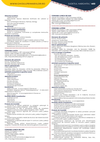 WWW.GHIDULPRIMARIILOR.RO JUDE%u021aUL HARGHITA / 403Obiective turistice:Capela XantuszMonumente istorice: Bisericile fortificate din Leliceni %u015fi MisenteaSituri arheologice: Banatus, Tilalmas, KohegySatul de vacan%u0163%u0103 Hosas%u0103uTeiul %u00een LeliceniEvenimente:Ziua comunei %u00een luna iunieFacilit%u00e3%u0163i oferite investitorilor:Reduceri la taxe %u015fi impoziteSprijin %u00een arendarea, %u00eenchirierea %u015fi cump%u0103rarea terenurilor necesare investi%u0163iilorProiecte de investi%u0163ii:Dezvoltarea zonei turistice Hosas%u0103uDezvoltarea infrastructuriiRe%u0163eaua de alimentare cu gaz %u00een satele Leliceni %u0219i FitodExtinderea re%u021belei de canalizare %u00een satele Leliceni %u0219i Fitod %u0219i construire %u00een MisenteaReabilitarea drumurilor comunaleReabilitarea C%u0103minului CulturalCOMUNA LUETAAdres%u0103: Principal%u0103, nr. 397; Cod po%u0219tal: 537140Telefon: 0366-401788; Fax: 0366-401788; Adresa de e-mail: loveteph@lovete.ro, mihaly.denes@lovete.roURL: https://lovetekozseg.ro/front-page-ro/Persoane din primarie:Primar: Mih%u00e1ly D%u00e9nesSecretar General: Orb%u00e1n Ern%u0151Contabil: Demeter Ida-EmeseSate %u00een administra%u021bie:Lueta, B%u0103ile ChiruiSuprafa%u021ba:%u00a0 10164 ha; Intravilan:%u00a0 447,49 ha; Extravilan:%u00a0 9716,51 ha; Popula%u021bia:%u00a03338; Gospod%u0103rii:%u00a01284; Locuin%u021be:%u00a01785; Gr%u0103dini%u021be:%u00a02; %u0218coli:%u00a01; Activitati economice si specifice zonei:Agricultur%u0103Cre%u015fterea animalelorObiective turistice:B%u0103ile Chirului Valea V%u00e2rghi%u015fuluiF%u00e2nt%u00e2na de sarePoiana narciselorDumbrava HarghiteiIzvoare de ap%u0103 mineral%u0103Evenimente:Zilele comunei - %u00een luna august %u00een fiecare anS%u0103rb%u0103tori religioase b%u00e2lciul %u201cKisboldogasszony%u201d - %u00een data de 8 septembrie %u00een fiecare anBalul strugurilor - %u00een luna septembrie %u00een fiecare anBalul mascatFacilit%u00e3%u0163i oferite investitorilor:For%u0163%u0103 de munc%u0103Silvicultur%u0103 Agricultur%u0103Prelucrarea lemnuluiProiecte de investi%u0163ii:Construire %u0219i dotare gr%u0103dini%u021b%u0103 cu program prelungit %u00een localitatea Lueta, jude%u021bul Harghita%u201d - AFIR-PNDRAlimentarea cu ap%u0103 %u0219i extinderea re%u021belei de canalizare menajer%u0103 %u00een comuna Lueta jude%u021bul Harghita- AFIR - PNDRModernizare drumuri agricole din comuna Lueta, jude%u021bul Harghita - AFIRModernizarea str%u0103zilor din comuna Lueta, jude%u021bul Harghita %u201c- SalignyModernizarea par%u021bial%u0103%u00a0a re%u021belei de drumuri de interes local din Comuna Lueta- PNDLReabilitare moderat%u0103%u00a0sal%u0103%u00a0de sport %u00een comuna Lueta, jude%u021bul Harghita%u201d PNRRRefacere talveg p%u00e2r%u00e2ul Koves-Comuna Lueta, jude%u0163ul Harghita%u00a0-finan%u021bat din fondul de rezerv%u0103 bugetar%u0103 a GuvernuluiCOMUNA LUNCA DE JOSAdres%u0103: Principal%u0103, nr. 647Cod po%u0219tal: 537145Telefon: 0266-339610, 339762; Fax: 0266-339762; Adresa de e-mail: primarialunca@gmail.comURL: https://gyimeskozeplok.ro/COMUNA LUNCA DE SUSAdres%u0103: Principal%u0103, nr. 537; Cod po%u0219tal: 537155Telefon: 0266-339101, 339026; Fax: 0266-339026; Adresa de e-mail: luncadesus@yahoo.comgyimesfelsolok@yahoo.comURL: www.gyimesfelsolok.roCOMUNA LUPENIAdres%u0103: Principal%u0103, nr. 566; Cod po%u0219tal: 537165Telefon: 0266-248212; Fax: 0266-248104; Adresa de e-mail: luprim@electronnet.roURL: www.primarialupenihr.roPersoane din primarie:Primar: Kov%u00e1cs LehelViceprimar: Ger%u00e9b P%u00e9terSecretar General: Orb%u00e1n Ren%u00e1taContabil: Jakab K%u00e1lm%u00e1nSate %u00een administra%u021bie:Lupeni, Bisericani, Mor%u0103reni, Bulg%u0103reni, P%u0103ltini%u015f, Satu Mic, P%u0103uleni, Firtu%u015fu, S%u00eencelSuprafa%u021ba:%u00a0 12535 ha; Intravilan:%u00a0 446 ha; Extravilan:%u00a0 12089 ha; Popula%u021bia:%u00a04507; Gospod%u0103rii:%u00a01570; Locuin%u021be:%u00a01850; Gr%u0103dini%u021be:%u00a06; %u0218coli:%u00a07; Cum se ajunge in localitate:Drumuri de acces:- DN 13 A Odorheiu Secuiesc - Sovata- DN 137 B Bisericani-Cristuru Secuiesc- DJ 136 B P%u0103uleni - Firtu%u015fu- DC 35 P%u0103ltini%u015f-Satu Mic- DC 24 Bisericani-Bulg%u0103reniActivitati economice si specifice zonei:Produc%u0163ie de mangal (c%u0103rbune de lemn)Agricultur%u0103Prelucrarea lemnuluiConstruc%u0163iiTurism ruralTransport persoaneComer%u0163Firme reprezentative:GORDON PROD SRLCSALAJ SRLSTEJAR LUPENI SRLALT TEHNOLOGIES SAHALUPEX SRLBENMAKOV SRL FANMIS CSERE SRLObiective turistice:Casa memorial%u0103 a scriitorului Tam%u00e1si %u00c1ronMonumentul comemorativ Tam%u00e1si %u00c1ron - LupeniCasa %u0163%u0103r%u0103neasc%u0103 BisericaniCetatea Firtu%u015fuStatuia Isus Hristos belvedere ( 22 m %u00een%u0103l%u0163ime, structura metalic%u0103 ) situat%u0103 pe Dealul GordonStatuia Sf%u00e2nta%u00a0Maria (sculptat%u0103 %u00een lemn) situat%u0103 pe Dealul GordonEvenimente:Zilele c%u0103rbunelui de lemn - 4, 5, 6 septembrieFacilit%u00e3%u0163i oferite investitorilor:Amplasamente oferite %u00een condi%u0163ii avantajoaseTerenuri pentru investi%u0163ii la pre%u0163uri rezonabileFor%u0163%u0103 de munc%u0103 ieftin%u0103 %u015fi infrastructur%u0103C%u0103i de acces la terenuriProiecte de investi%u0163ii:Cre%u0219terea eficien%u021bei energetice la sediul prim%u0103riei comunei lupeni, jude%u021bul%u00a0HarghitaReabilitare %u0219coala gimnazial%u0103 Tamasi Aron, demolare cl%u0103diri anexe %u0219i construire sala de mese %u00een sat LupeniCre%u0219terea gradului de digitalizare %u00een beneficiul cet%u0103%u021benilor %u00een cadrul comunei Lupeni, jude%u021bul HarghitaModernizarea sistemului de iluminat prin eficientizarea infrastructurii de iluminat public %u00een comuna Lupeni, jude%u021bul HarghitaReabilitare baz%u0103%u00a0sportiv%u0103%u00a0%u00een localitatea Lupeni, judetul HarghitaReabilitare poduri %u0219i pode%u021be %u00een comuna Lupeni, judetul HarghitaReabilitarea dispensarului medica