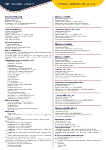 404 / JUDE%u021aUL HARGHITA WWW.GHIDULPRIMARIILOR.ROCOMUNA M%u0102D%u0102RA%u015eAdres%u0103: Principal%u0103, nr. 193Cod po%u0219tal: 537071Telefon: +40743047849; Adresa de e-mail: csikmadaras@gmail.comURL: http://www.csikmadaras.roCOMUNA M%u0102RTINI%u015eAdres%u0103: Principal%u0103, nr.36Cod po%u0219tal: 537175Telefon: 0266-223046; Fax: 0266-223046; Adresa de e-mail: secretar@martinis.roprimar@martinis.roURL: www.martinis.roPersoane din primarie:Primar: Jakab AttilaViceprimar: Nagu IstvanSecretar General: Homor%u00f3di T%u00fcndeContabil: Bartha RekaSate %u00een administra%u021bie:M%u0103rtini%u015f, Locodeni,%u00a0Chinu%u015fu,%u00a0B%u0103deni, Rare%u015f,%u00a0Ghipe%u015f,%u00a0C%u0103lug%u0103reni,%u00a0Aldea, Com%u0103ne%u015fti, S%u00e2npaul,%u00a0Petreni, Or%u0103%u015feniSuprafa%u021ba:%u00a0 14162 ha; Intravilan:%u00a0 404 ha; Extravilan:%u00a0 13759 ha; Popula%u021bia:%u00a0 2863; Gospod%u0103rii:%u00a0 1530; Locuin%u021be:%u00a0 1741; Gr%u0103dini%u021be:%u00a0 5; %u0218coli:%u00a06; Activitati economice si specifice zonei:Procesarea lapteluiCre%u015fterea animalelorAgricultur%u0103Firme reprezentative:1. Agropisc srl %u2013 activitate piscicol%u01032. Rozmaring srl %u2013 Confec%u0163ionare cazane3. Simultan srl. %u2013 Prelucrarea laptelui4. Transdem srl %u2013 prest%u0103ri serviciiProduc%u0103tori locali:I.I. M%u00f3zes Enik%u0151I.I. G%u00e1l AttilaI.I. Bal%u00e1zsi Ildik%u00f3I.I. Ged%u0151 HunorS.C. P%u00e1l Pityoka S.R.L.Persoan%u0103 fizic%u0103 Bancsi Rig%u00f3 Istv%u00e1nProduse locale:Produse alimentare: Produse lactate, miere, gem, siropPlante %u0219i floriCompanii reprezentative:Agropisc srl %u2013 activitate piscicol%u0103Rozmaring srl %u2013 confec%u0163ionare cazaneSimultan srl%u00a0%u2013 prelucrarea lapteluiTransdem srl %u2013 prest%u0103ri serviciiObiective turistice:Parcul de sculpturi %u201cRoman Viktor%u201dRezerva%u021bia de p%u0103s%u0103ri %u201dLacul S%u00e2npaul%u201dF%u00e2nt%u00e2ni s%u0103rateCetatea B%u0103deniMonumente istorice (biserici, conacuri, etc) Muzeul satuluiEvenimente:Zilele satelor Tab%u0103ra interna%u021bional%u0103 de arte plastice cu expozi%u021bii organizat%u0103 anualProiecte de investi%u0163ii:Modernizarea drumurilor %u00een comuna M%u0103rtini%u0219, jude%u0163 Harghita - Etapa I, II, IIIReabilitare c%u0103min cultural Or%u0103%u0219eniReabilitare c%u0103min cultural Ghipe%u0219Reabilitare c%u0103min cultural S%u00e2npaulReabilitare c%u0103min cultural Rare%u0219Reabilitare termic%u0103 la %u0219coala gimnazial%u0103 Roman Viktor din satul M%u0103rtini%u0219Reabilitare termic%u0103 la %u0219coala gimnazial%u0103 L%u00e1szl%u00f3 Gyula din satul S%u00e2npaulConstruirea unei Gradini%u021b%u0103 cu program normal cu 4 s%u0103li de grup%u0103 %u00een comuna M%u0103rtini%u0219, jude%u021bul HarghitaExtindere re%u021belelelor de alimentare cu ap%u0103 %u0219i canalizare menajer%u0103 %u00een comuna M%u0103rtini%u0219, satele M%u0103rtini%u0219, Rare%u0219, S%u00e2npaul, Petreni, Or%u0103%u0219eni, jude%u021bul HarghitaActualizarea PUZ comuna M%u0103rtini%u0219 Cadastru sistematicGaz -Iasd infraplanCOMUNA MERE%u015eTIAdres%u0103: Principal%u0103, nr. 144Cod po%u0219tal: 537195Telefon: 0266-220688; Fax: 0266-220820; Adresa de e-mail: comuna.meresti@yahoo.comURL: https://homorodalmas.ro/pagina-principala/MUNICIPIUL MIERCUREA CIUCAdres%u0103: Pia%u0163a Cet%u0103%u0163ii Nr. 1Cod po%u0219tal: 530110Telefon: 0266-315120; Fax: 0266- 371165; Adresa de e-mail: primaria@miercureaciuc.rovaroshaza@szereda.roURL: www.miercureaciuc.roCOMUNA MIH%u0102ILENIAdres%u0103: Principal%u0103, nr. 288 ACod po%u0219tal: 537200Telefon: 0266-326063; Fax: 0266-326155; Adresa de e-mail: primaria.mihaileni@yahoo.comURL: www.csikszentmihaly.roCOMUNA MUGENIAdres%u0103: Principal%u0103, nr. 150Cod po%u0219tal: 537205Telefon: 0266-245490; Fax: 0266-245430; Adresa de e-mail: office@primariamugeni.roURL: www.bogozkozseg.roCOMUNA OCLANDAdres%u0103: Principal%u0103, nr. 174Cod po%u0219tal: 537225Telefon: 0266-224023; Fax: 0266-224023; Adresa de e-mail: primarocland@yahoo.comURL: www.okland.roMUNICIPIUL ODORHEIU SECUIESCAdres%u0103: Pia%u0163a Prim%u0103riei, nr. 5Cod po%u0219tal: 535600Telefon: 0266-218145; Fax: 0266-218032; Adresa de e-mail: office@odorhei.ro, office@udvarhely.roURL: http://www.udvarhely.ro/ro/COMUNA P%u0102ULENI CIUCAdres%u0103: Principal%u0103, nr. 76Cod po%u0219tal: 537230Telefon: 0266-333601, 333705; Fax: 0266-333601, 333705; Adresa de e-mail: office@csikpalfalva.euURL: https://comuna-pauleniciuc.ro/COMUNA PL%u0102IE%u015eII DE JOSAdres%u0103: Principal%u0103, nr. 235Cod po%u0219tal: 537235Telefon: 0266-333010; Fax: 0266-333010; Adresa de e-mail: primariaplaiesiidejos@yahoo.comURL: https://www.kaszon.ro/Persoane din primarie:Primar: Andr%u00e1s Tam%u00e1sViceprimar: Bara L%u00e1szl%u00f3Secretar general: Barta MariaSecretar General: Burista Zsolt LajosSate %u00een administra%u021bie:Pl%u0103ie%u015fii De Sus, Ca%u015finu Nou, Imper, Iacobeni, Pl%u0103ie%u015fii de JosSuprafa%u021ba:%u00a0 29569 ha; Intravilan:%u00a0 230 ha; Extravilan:%u00a0 29339 ha; Popula%u021bia:%u00a0 3016; Gospod%u0103rii:%u00a0 1450; Locuin%u021be:%u00a0 1738; Gr%u0103dini%u021be:%u00a0 4; %u0218coli:%u00a05; Activitati economice si specifice zonei:Exploatarea %u015fi prelucrarea lemnului%u00a0Obiective turistice:Comuna este bogat%u0103 %u00een ape minerale. Cele mai importante izvoare sunt:- Salutaris- Piatra Alb%u0103- Repat