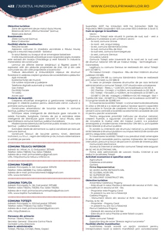 422 / JUDE%u021aUL HUNEDOARA WWW.GHIDULPRIMARIILOR.ROObiective turistice:Zona de agrement de pe malul r%u00e2ului Mure%u0219Biserica de lemn %u201eSf%u00e2ntul Nicolae%u201d %u0218oimu%u0219 Rezerva%u021bia BoholtEvenimente:Zilele Comunei %u0218oimu%u0219 Balul CiobanilorFacilit%u00e3%u0163i oferite investitorilor:Resurse locale:A%u015fezarea comunei %u00een imediata vecin%u0103tate a R%u00e2ului Mure%u015f asigur%u0103 o resurs%u0103 inepuizabil%u0103 - balastul%u00cen satul Balata au %u00eenceput s%u0103 se amenajeze balastiereO alt%u0103 resurs%u0103 local%u0103 utilizat%u0103 pe scara larg%u0103 este argila. Aceasta este extras%u0103 din loca%u0163ia Chisc%u0103daga %u015fi este folosit%u0103 %u00een industria materialelor de construc%u0163ieLemnul de diferite esen%u0163e (stej%u0103ri%u015furi %u015fi f%u0103gete) poate fi exploatat at%u00e2t din p%u0103durile proprietate de stat, c%u00e2t %u015fi din cele comunale sau din cele proprietate a localnicilorTrebuie dezvoltat%u0103 %u015fi %u00eembun%u0103t%u0103%u0163it%u0103 re%u0163eaua de drumuri forestiere %u00een vederea cre%u015fterii gradului de accesibilitate a p%u0103durilorAp%u0103 mineral%u0103Existen%u0163a for%u0163ei de munc%u0103C%u0103i rutiere na%u0163ionale %u015fi jude%u0163eneTelefonie digital%u0103 automat%u0103 %u015fi mobil%u0103Gaz metanFacilit%u0103%u0163i fiscaleTV cabluAcces u%u015forProiecte de investi%u0163ii:Cre%u015fterea eficien%u0163ei energetice %u015fi gestionarea inteligent%u0103 a energiei %u00een cl%u0103dirile publice pentru obiectivele c%u0103min cultural %u0219i prim%u0103rie comuna %u0218oimu%u0219Construirea ansamblului de locuin%u021be sociale %u00een comuna %u0218oimu%u0219, jude%u021bul Hunedoara%u00cenfiin%u021bare re%u021bea inteligent%u0103%u00a0 de distribu%u021bie gaze naturale %u00een satele Fornadia, Sulighete, Cainelu de jos %u0219i extindere re%u021bea inteligent%u0103%u00a0 de distribu%u021bie gaze naturale %u00een satul P%u0103uli%u0219, sate apar%u021bin%u0103toare comunei %u0218oimu%u0219, jude%u021bul HunedoaraModernizarea sistemului de iluminat public stradal, %u00een comuna %u0218oimu%u0219 %u2013 jude%u021bul HunedoaraExtindere re%u021bele de alimentare cu ap%u0103%u00a0%u0219i canalizare pe raza uat comuna %u0218oimu%u0219Construire blocuri de locuin%u021be pentru tineri, destinate %u00eenchirierii, cu 10 u.l. , regim de %u00een%u0103l%u021bime p+2e, inclusiv sistematizare %u0219i utilit%u0103%u021bi pe parcelaCOMUNA TELIUCU INFERIORAdres%u0103: str. Minei, nr. 2; Cod po%u0219tal: 337465Telefon: 0254-738105; Fax: 0254-738253; Adresa de e-mail: primariateliuc@gmail.comURL: http://comuna-teliucu-inferior.roCOMUNA TOME%u015eTIAdres%u0103: Principal%u0103, nr. 50; Cod po%u0219tal: 337470Telefon: 0254-681889; Fax: 0254-681828; Adresa de e-mail: primariatomesti.hd@gmail.comURL: www.tomesti.roCOMUNA TOPLI%u0162AAdres%u0103: Principal%u0103, nr. 36; Cod po%u0219tal: 337480Telefon: 0254-735314, 735310; Fax: 0254-735310; Adresa de e-mail: primariacomuneitoplita@yahoo.comURL: www.toplita-hunedoara.roCOMUNA TOTE%u015eTIAdres%u0103: Principal%u0103, nr. 53;Cod po%u0219tal: 337490Telefon: 0254-775640; Fax: 0254-775641; Adresa de e-mail: primaria.totesti@yahoo.comURL: http://totesti.roPersoane din primarie:Primar: Tiberiu PasconiSecretar General : Diacona Corina FlaviaContabil: Lin%u021bu EleonoraSate %u00een administra%u021bie:Tote%u015fti, P%u0103cli%u015fa, C%u00eerne%u015fti, Reea, CopaciSuprafa%u021ba:%u00a0 2237 ha; Intravilan:%u00a0 609 ha; Extravilan:%u00a0 1628 ha; Popula%u021bia:%u00a01869; Gospod%u0103rii:%u00a0523; Locuin%u021be:%u00a0553; Gr%u0103dini%u021be:%u00a02; %u0218coli:%u00a03; Cum se ajunge in localitate:VeciniComuna Tote%u015fti este situat%u0103 %u00een partea de sud, sud - vest a Jude%u021bului Hunedoara %u015fi are urm%u0103torii vecini:- la nord, comuna Unirea- la nord - est, ora%u015ful Ha%u021beg- la est, comuna S%u00e2nt%u0103m%u0103ria Orlea- la sud, comuna R%u00e2u de Mori- la sud-vest, comuna Sarmizegetusa- la vest, comuna DensusCircula%u021bia rutier%u0103Comuna Tote%u015fti este traversat%u0103 de la nord est la sud vest de drumul na%u021bional DN 68 pe traseul Ha%u0163eg - Sarmizegetusa - Caransebe%u015fLeg%u0103tura cu comuna Densus se realizeaz%u0103 din satul Tote%u015fti prin DJ 687 C.Pe traseul Cirne%u0219ti - Clopotiva - R%u00e2u de Mori %u00eent%u00e2lnim drumul jude%u021bean DJ 685.Legatura DN 68 cu comuna S%u00e2nt%u0103m%u0103ria Orlea se realizeaz%u0103 prin satul Cirne%u0219ti cu DJ 686 B%u00cen ceea ce prive%u015fte clasarea drumurilor de pe raza teritorial administrativ%u0103 a comunei Tote%u015fti, COT situa%u021bia este urmatoarea:- DC: Tote%u015fti - Reea, L = 2,00 km, se %u00eencadreaz%u0103 ca DC 83 A- DC: Paclisa - Cirne%u015fti, L=4,00km, se %u00eencadreaz%u0103 ca DC 86 B- DC: Tote%u015fti - Farcadin, L=4,00km, se %u00eencadreaz%u0103 ca DJ 687 L %u0430%u0441- DJ 687 C: DN 66 - Ha%u021bagel, L=5985km+DC 93: Ha%u021bagel - Stei = 7,400k+DE: Stei - DJ 687 D, L=19,600km, se %u00eencadreaza ca DJ 687 G %u00een lungime total%u0103 de 32,985 km%u00cen traversarea localit%u0103%u021bii Tote%u015fti - s-a %u0163inut seama de dezvoltarea %u00een viitor a DN 68 %u015fi s-a rezervat spa%u021biul necesar sporirii capacit%u0103%u021bii de circula%u021bie %u00een func%u021bie de cre%u0219terea traficului, asigur%u00e2ndu-se %u00een versal%u00a0%u00een zona central%u0103%u00a0a localit%u0103%u021bii acostamente carosabile de 2,50 m pentru parc%u0103ri ocazionalePentru asigurarea priorit%u0103%u021bii traficului pe drumul na%u021bional, cre%u015fterii fluen%u021bei, a siguran%u021bei circula%u021biei %u015fi m%u0103ririi capacit%u0103%u021bii de circula%u021bie la nivelul celei din traseul curent, s-a prev%u0103zut amenajarea %u015fi modernizarea intersec%u021biilor DN 68 cu principalele str%u0103zi laterale %u015fi drumuri publice%u00cen zonele cu intersec%u021bii ale drumului na%u021bional cu principalele str%u0103zi laterale %u0219i drumuri pu