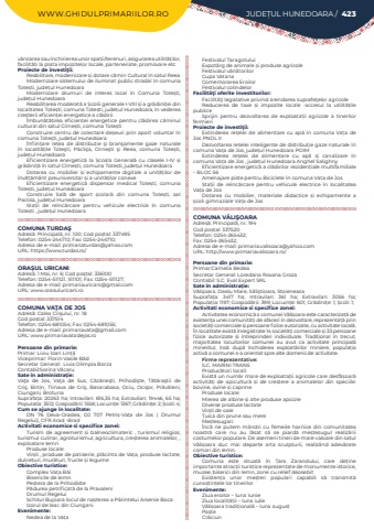 WWW.GHIDULPRIMARIILOR.RO JUDE%u021aUL HUNEDOARA / 423v%u00e2nzarea sau %u00eenchirierea unor spa%u021bii/terenuri, asigurarea utilit%u0103%u021bilor, facilit%u0103%u021bi la plata impozitelor locale, parteneriate, promovare etcProiecte de investi%u0163ii:Reabilitare, modernizare %u0219i dotare c%u0103min Cultural %u00een satul ReeaModernizare sistemului de iluminat public stradal %u00een comuna Tote%u0219ti, jude%u021bul HunedoaraModernizare drumuri de interes local %u00een Comuna Tote%u0219ti, jude%u021bul HunedoaraReabilitarea moderat%u0103%u00a0a %u0218colii generale I-VIII %u0219i a gr%u0103dini%u021bei din localitatea Tote%u0219ti, comuna Tote%u0219ti, jude%u021bul Hunedoara, %u00een vederea cre%u0219terii eficien%u021bei energetice a cl%u0103dirii%u00cembun%u0103t%u0103%u021birea eficien%u021bei energetice pentru cl%u0103direa c%u0103minul cultural din satul C%u00eerne%u0219ti, comuna Tote%u0219tiConstruire centru de colectare de%u0219euri prin aport voluntar %u00een comuna Tote%u0219ti, jude%u021bul Hunedoara%u00cenfiin%u021bare re%u021bea de distribu%u021bie %u015fi bran%u015famente gaze naturale %u00een localit%u0103%u021bile Tote%u015fti, P%u0103cli%u015fa, C%u00eerne%u015fti %u015fi Reea, comuna Tote%u0219ti, jude%u021bul%u00a0HunedoaraEficientizare energetic%u0103 la %u0218coala General%u0103%u00a0 cu clasele I-IV %u0219i gr%u0103dini%u021b%u0103%u00a0%u00een satul C%u00eerne%u0219ti, comuna Tote%u0219ti, jude%u021bul HunedoaraDotarea cu mobilier %u0219i echipamente digitale a unit%u0103%u021bilor de %u00eenv%u0103%u021b%u0103m%u00e2nt preuniversitar %u0219i a unit%u0103%u021bilor conexeEficientizare energetic%u0103%u00a0 dispensar medical Tote%u0219ti, comuna Tote%u0219ti, jude%u021bul HunedoaraConstruire Sal%u0103%u00a0 de sport %u0219colar%u0103%u00a0 din comuna Tote%u0219ti, sat Paclisa, jude%u021bul HunedoaraSta%u021bii de re%u00eenc%u0103rcare pentru vehicule electrice %u00een comuna Tote%u0219ti , jude%u021bul HunedoaraCOMUNA TURDA%u015eAdres%u0103: Principal%u0103, nr. 100; Cod po%u0219tal: 337495Telefon: 0254-244710; Fax: 0254-244710; Adresa de e-mail: primariaturdas@yahoo.comURL: https://www.turdas.ro/ORA%u0218UL URICANIAdres%u0103: 1 Mai, nr. 6; Cod po%u0219tal: 336100Telefon: 0254-511121, 511101; Fax: 0254-511127; Adresa de e-mail: primariauricani@gmail.comURL: www.orasuluricani.roCOMUNA VA%u0162A DE JOSAdres%u0103: Calea Cri%u015fului, nr. 18Cod po%u0219tal: 337514Telefon: 0254-681054; Fax: 0254-681055; Adresa de e-mail: primariavata@gmail.comURL: www.primariavatadejos.roPersoane din primarie:Primar: Liviu Ioan Lin%u021b%u0103%u00a0Viceprimar: Florin Vasile B%u0103d%u00a0Secretar General: %u00a0Livia Olimpia BorzaContabil:Sorina V%u0103caru%u00a0Sate %u00een administra%u021bie:Va%u0163a de Jos, Va%u0163a de Sus, C%u0103z%u0103ne%u015fti, Prihodi%u015fte, T%u0103t%u0103ra%u015ftii de Cri%u015f, Birtin, T%u00eernava de Cri%u015f, Basarabasa, Ociu, Oci%u015for, Pr%u0103v%u0103leni, Ciungani, BrotunaSuprafa%u021ba:%u00a020263 ha; Intravilan:%u00a0816,35 ha; Extravilan:%u00a019446, 65 ha; Popula%u021bia:%u00a03512; Gospod%u0103rii:%u00a01558; Locuin%u021be:%u00a01367; Gr%u0103dini%u021be:%u00a02; %u0218coli:%u00a04; Cum se ajunge in localitate:DN 76 Deva-Oradea, DJ 707 Petri%u0219-Va%u021ba de Jos ( Drumul Regelui), CFR Arad -BradActivitati economice si specifice zonei:Turism de agreement %u0219i balneoclimateric , turismul religios, turismul culinar, agroturismul, agricultura, cre%u0219terea animalelor, , exploatare lemnProduse locale:Vir%u0219li , produse de patiserie, pl%u0103cinta de Va%u021ba, produse lactate, dulce%u021buri, mur%u0103turi, fructe %u0219i legumeObiective turistice:Complex Va%u021ba B%u0103iBisericile de lemnPe%u0219tera de la PrihodisteP%u0103durea petrificat%u0103%u00a0de la PravaleniDrumul RegeluiSchitul Bujoara locul de na%u0219terea a P%u0103rintelui Arsenie BocaIzorul de leac din CiunganiEvenimente:Nedea de la Va%u021baFestivalul TaragotuluiExpot%u00e2rg de animale %u0219i produse agricoleFestivalul v%u00e2n%u0103torilorCupa VatanaComemorarea Eroilor Festivalul colindelorFacilit%u00e3%u0163i oferite investitorilor:Facilit%u0103%u0163i legislative privind arendarea suprafe%u0163elor agricoleReducerea de taxe %u0219i impozite locale -accesul la utilit%u0103%u021bile publiceSprijin pentru dezvoltarea de exploata%u021bii agricole a tinerilor fermieriProiecte de investi%u0163ii:Extinderea re%u021belei de alimentare cu ap%u0103%u00a0 %u00een comuna Va%u021ba de Jos PNDL IIDezvoltarea re%u021belei inteligente de distribu%u021bie gaze naturale %u00een comuna Va%u021ba de Jos, jude%u021bul Hunedoara POIMExtinderea re%u021belei de alimentare cu ap%u0103%u00a0 %u0219i canalizare %u00een comuna Va%u021ba de Jos , jude%u021bul Hunedoara Anghel SalighnyEficientizare energetic%u0103 a cl%u0103dirilor reziden%u021biale multifamiliale %u2013 BLOC 56Amenajare piste pentru Biciclete %u00een comuna Va%u021ba de JosSta%u021bii de re%u00eenc%u0103rcare pentru vehicule electrice %u00een localitatea Va%u021ba de JosDotarea cu mobilier, materiale didactice %u0219i echipamente a %u0219coli gimnaziale Va%u021ba de JosCOMUNA V%u0102LI%u015eOARAAdres%u0103: Principal%u0103, nr. 194Cod po%u0219tal: 337520Telefon: 0254-265432; Fax: 0254-265432; Adresa de e-mail: primaria.valisoara@yahoo.comURL: http://www.primariavalisoara.ro/Persoane din primarie:Primar:Camelia Bedea%u00a0Secretar General:%u00a0Loredana Roxana Groza%u00a0Contabil: S.C. Eval Expert SRLSate %u00een administra%u021bie:V%u0103li%u015foara, Dealu Mare, S%u0103li%u015ftioara, StoieneasaSuprafa%u021ba:%u00a0 3417 ha; Intravilan:%u00a0 361 ha; Extravilan:%u00a0 3056 ha; Popula%u021bia:%u00a01197; Gospod%u0103rii:%u00a0399; Locuin%u021be:%u00a0601; Gr%u0103dini%u021be:%u00a01; %u0218coli:%u00a01; Activitati economice si specifice zonei:Activitatea economic%u0103 a comunei V%u0103li%u0219oara este caracterizat%u0103 de existen%u021ba unei comunit%u0103%u021bi de afaceri %u00een dezvoltare, reprezentat%u0103 prin s