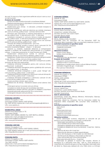 WWW.GHIDULPRIMARIILOR.RO JUDE%u021aUL ARAD / 41de var%u0103. %u00cen trecut au fost organizate astfel de ac%u021biuni care au avut un real successProiecte de investi%u0163ii:Construire sal%u0103 multifunc%u021bional%u0103 %u00een localitatea R%u0103de%u0219tiRealizare de piste pentru biciclete %u00een comuna Alma%u0219%u00a0%u2013 contract de finan%u021bare semnat PNRRModernizare parc Alma%u0219 %u2013 %u00een derulare, urmeaz%u0103 recep%u021bia la terminarea lucr%u0103rilorSta%u021bii de re%u00eenc%u0103rcare vehicule electrice pe str%u0103zile interioare din comuna Alma%u0219, jude%u021bul Arad %u2013 contract semnat AFM%u00cenfiin%u021bare parc fotovoltaic %u0219i sisteme fotovoltaice %u00een comuna Alma%u0219, jude%u021bul Arad %u2013 %u00een derulare prin AFM %u2013 %u00een derulareCanalizare menajer%u0103 %u00een comuna Alma%u0219 %u0219i sta%u021bie de epurare Alma%u0219, jude%u021bul Arad %u2013 %u00een derulare programul Anghel SalignyCre%u015fterea eficien%u0163ei energetice a infrastructurii de iluminat public %u00een comuna Alma%u0219, jude%u021bul Arad %u2013 AFMAchizi%u021bia de utilaje %u0219i echipamente %u2013 prin GALLucr%u0103ri de repara%u021bii accese %u0219i %u0219an%u021buri drum comunal DC 35 intravilan localitatea R%u0103de%u0219ti %u2013 etapa II %u2013 %u00een derulareDotarea cu mobilier, materiale didactice %u0219i echipamente digitale a unit%u0103%u021bilor de %u00eenv%u0103%u021b%u0103m%u00e2nt preuniversitar %u0219i a unit%u0103%u021bilor conexe %u2013 %u00een derulare parteneriat CJ Arad finan%u021bat prin PNRRModernizare infrastructur%u0103 rutier%u0103 %u00een comuna Alma%u0219, localit%u0103%u021bile Alma%u0219, Cil, Joia Mare %u0219i R%u0103de%u0219ti, jude%u021bul AradReabilitare, modernizare, extindere %u0219i dotare %u0219coala gimnazial%u0103 %u00abLaz%u0103r T%u00e2mpa%u00bb Alma%u0219, comuna Alma%u0219, jude%u021bul Arad%u00cennoirea parcului de vehicule destinate transportului public (achizi%u021bia de vehicule nepoluante)Cre%u0219terea eficien%u021bei energetice pentru din comuna Alma%u0219, jude%u021bul Arad %u2013 %u00een derulareCre%u0219terea eficien%u021bei energetice pentru gr%u0103dini%u021ba din comuna Alma%u0219, jude%u021bul Arad - %u00een derulareCre%u0219terea eficien%u021bei energetice a %u0219colii %u201eLaz%u0103r T%u00e2mpa%u201d din comuna Alma%u0219, jude%u021bul Arad %u2013 %u00een derulareCre%u0219terea eficien%u021bei energetice a c%u0103minului cultural Alma%u0219 din comuna Alma%u0219, jude%u021bul Arad %u2013 %u00een derulareCre%u0219terea eficien%u021bei energetice a c%u0103minului cultural Cil din comuna Alma%u0219, jude%u021bul Arad %u2013 %u00een derulareConstruire teren sintetic sport Alma%u0219Asfaltare DC 30 Alma%u0219 %u2013 M%u0103n%u0103stire Dalare canal colector Joia MareAmenajare %u0219an%u021buri %u0219i accese comuna Alma%u0219Canalizare %u0219i sta%u021bie de epurare localitatea Joia MareReabilitare %u0219i dotare c%u0103mine culturale: Cil, R%u0103de%u0219ti %u0219i Joia MarePasarel%u0103 pietonal%u0103 adiacent%u0103 DN 79 a canal Alma%u0219 Amenajare trotuare comuna Alma%u0219COMUNA APATEUAdres%u0103: Principal%u0103, nr. 364Cod po%u0219tal: 317010; Telefon: 0257-327301; Fax: 0257-327301; Adresa de e-mail: primariaapateu@rdslink.roURL: www.apateu.roMUNICIPIUL ARADAdres%u0103: B-dul Revolu%u0163iei, nr. 75Cod po%u0219tal: 310130Telefon: 0257-281850, 280259; Fax: 0257-284744, 253842; Adresa de e-mail: pma@primariaarad.rorelatii.externe@primariaarad.roURL: www.primariaarad.roCOMUNA ARCHI%u015eAdres%u0103: Principal%u0103, nr. 97Cod po%u0219tal: 317015; Telefon: 0257-323553, 323503; Fax: 0257-323633; Adresa de e-mail: primaria.archis@yahoo.comURL: https://archis-arad.ro/COMUNA BATAAdres%u0103: Principal%u0103, nr. 166Cod po%u0219tal: 317020; Telefon: 0257-434701; Fax: 0257-434791; Adresa de e-mail: primariabata.bata@yahoo.roURL: https://www.primariabata.ro/COMUNA B%u00c2RSA Adres%u0103: Nr. 200Cod po%u0219tal: 317025Telefon: 0257-321101, 321219; Fax: 0257-321101, 321219; Adresa de e-mail: primariabirsa@yahoo.comURL: http://www.comunabirsa.ro/Persoane din primarie:Primar: Elena Lumini%u021ba TomaViceprimar: Loredan Mihai BelcSecretar General: Ioan Iulian Cri%u015fanContabil: Bauer ArpadSate %u00een administra%u021bie:B%u00e2rsa, Alde%u015fti, Hodi%u015f, VoivodeniSuprafa%u021ba:%u00a0 5174 ha; Intravilan:%u00a0 137 ha; Extravilan:%u00a0 5037 ha; Popula%u021bia:%u00a01820; Gospod%u0103rii:%u00a0792; Locuin%u021be:%u00a0843; Gr%u0103dini%u021be:%u00a02; %u0218coli:%u00a01; Activitati economice si specifice zonei:Cultura plantelor cerealiereCre%u015fterea animalelor Prelucrare lemnObiective turistice:Popas turistic B%u00e2rsaMuzeu ceramic%u0103 B%u00e2rsaEvenimente:%u201cFestivalul Flori de S%u00e2nziene%u201d - augustProiecte de investi%u0163ii:Trotuare %u00een comuna B%u00e2rsaAsfaltare str%u0103zi %u00een comuna B%u00e2rsaReabilitare %u015fi modernizare c%u0103min cultural B%u00e2rsa-FinalizatExtindere magistral%u0103 gaz - %u00een derulareParc panouri fotovoltaiceCOMUNA B%u00c2RZAVA Adres%u0103: Principal%u0103, nr. 314Cod po%u0219tal: 317030Telefon: 0257-433108; Fax: 0257-433311; Adresa de e-mail: primariabarzava@gmail.comURL: https://comunabarzava.ro/Persoane din primarie:Primar: Gabriel FaurViceprimar: Lucian %u0218tefan HapcaSecretar General: Anca Maria Simona BudaContabil: ExternalizatSate %u00een administra%u021bie:Dumbr%u0103vi%u0163a, Gro%u015fii Noi, B%u0103tu%u0163a,%u00a0 B%u00e2rzava,%u00a0 Monoro%u015ftia, C%u0103pru%u0163a, Slatina de Mure%u015f,%u00a0Lala%u015fin%u0163Suprafa%u021ba:%u00a0 25643 ha; Intravilan:%u00a0 743 ha; Extravilan:%u00a0 24900 ha; Popula%u021bia:%u00a0 2600; Gospod%u0103rii:%u00a0 951; Locuin%u021be:%u00a0 1254; Gr%u0103dini%u021be:%u00a0 2; %u0218coli:%u00a03; Activitati economice si specifice zonei:Agricultur%u0103TurismPrelucrarea lemnului Cultivarea terenurilorCre%u0219terea animalelorT%u0103ierea %u0219i prelucrarea lemnuluiObiective turistice:Dintre obiectivele 