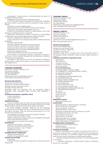 WWW.GHIDULPRIMARIILOR.RO JUDE%u021aUL ARAD / 45Amenajarea a dou%u0103 terenuri multifunc%u021bionale de sport %u00een localitatea Milova %u0219i Odvo%u0219Reabilitare C%u0103min Cultural %u00een localitatea Odvo%u0219Au mai fost executate %u0219i amenajate mai multe poduri %u0219i pode%u0163e din beton peste cursurile de ap%u0103 din localit%u0103%u021bile Conop, Odvo%u0219 %u0219i MilovaProiecte %u00een curs de implementare:Sistematizare pe vertical%u0103 DC83, DC61A %u0219i Zona Ar%u0103ne%u0219Mai exist%u0103 %u00een derulare %u015fi alte proiecte cum ar fi:Acizi%u021bia unei autoutilitare dotat%u0103 cu cabin%u0103 pentru mai multe persoane %u0219i platforma pentru meterialeAsigurarea infrastructurii pentru transportul verde-ITS/alte infrastructuri TIC %u0219i puncte de %u00eenc%u0103rcare vehicule electriceDotarea Unit%u0103%u021bilor de %u00eenv%u0103%u021b%u0103mant cu MobilierAvem %u00een derulare mai multe proiecte aflate %u00een diferite stadii de proiectere:%u00cenfiin%u021bare re%u021bea de ap%u0103%u00cenfiin%u021bare re%u021bea de canalizare %u00een comuna ConopConstruire C%u0103min Cultural %u00een localitatea MilovaConstruire C%u0103min Cultural %u00een localitatea Odvo%u015fReabilitarea C%u0103minului din localitatea Belotin%u021bConstruire Capele mortuareModernizarea sistemului de iluminat public stradalSe lucreaz%u0103 la Actualizarea Planului Urbanistic General al comunei, au fost realizate Sdudiile de fundamentare Analitice, Consultative %u015fi Prospective Mai exist%u0103 %u0219i alte proiecte %u015fi lucr%u0103ri de repara%u021bii, %u00eentre%u021binere, administrare a domeniului public al comunei Conop finan%u021bate din bugetul local.COMUNA COV%u0102S%u00c2N%u0162 Adres%u0103: Str. Corneliu Miclo%u015fi, Nr. 23Cod po%u0219tal: 317090Telefon: 0257-385005; Fax: 0257-385000; Adresa de e-mail: covasant@ar.e-adm.roURL: http://www.primariacovasint.roPersoane din primarie:Primar: Marius-Silviu%u00a0One%u0163%u00a0Viceprimar:%u00a0 Nicu%u0219or-Mircea%u00a0BreteanSecretar General: Marinela%u00a0Ciutina%u00a0%u00a0Contabil: Adriana%u00a0FecheteSuprafa%u021ba:%u00a0 3100 ha; Intravilan:%u00a0 100 ha; Extravilan:%u00a0 3000 a; Popula%u021bia:%u00a0 2540; Gospod%u0103rii:%u00a0 880; Locuin%u021be:%u00a0 1201; Gr%u0103dini%u021be:%u00a0 1; %u0218coli:%u00a01; Activitati economice si specifice zonei:Cultura vi%u0163ei de vieCultura c%u0103p%u015funilorAgricultur%u0103%u00a0Obiective turistice:Comuna Cov%u0103s%u00een%u0163 este unul din cele mai importante puncte de acces spre culmile domoale ale Mun%u0163ilor Z%u0103rand, mai multe trasee turistice marcate pornind de pe teritoriul acesteiaPe l%u00e2ng%u0103 bog%u0103%u0163ia peisajelor deprinse de pe %u00een%u0103l%u0163imile Z%u0103randului, comuna dispune %u015fi de un impresionant fond turistic de origine antropic%u0103. Cele mai atractive puncte pentru cei care trec pe raza comunei sunt:Turnul Bisericii din secolul al XIV-lea %u015fi Cetatea %u201cTornea%u201dUrmele cet%u0103%u0163ii de p%u0103m%u00e2nt HindecTab%u0103ra ortodox%u0103 de crea%u0163ie %u015fi conservare a tradi%u0163iilor rom%u00e2ne%u015ftiCentrul de informare turistic%u0103Muzeul Bisericii Ortodoxe din Cov%u0103s%u00een%u0163Evenimente:%u00cent%u00e2lnirea cu fiii satului - la RusaliiFestivalul %u201cRom%u00e2nilor de pretutindeni%u201dFestivalul de folclor %u201c Ioan T. Florea%u201dS%u0103rb%u0103toarea VinuluiFestivalul %u201cColinde de Cr%u0103ciun%u201dFacilit%u00e3%u0163i oferite investitorilor:Infrastructur%u0103 modern%u0103Afiliere la Grup Ac%u0163iune Local%u0103Proiecte de investi%u0163ii:%u00cen derulare:Accesare Fonduri Europene %u00een valoare de 2 milioane euro prin M%u0103sura 322COMUNA CRAIVAAdres%u0103: Principal%u0103, nr. 108Cod po%u0219tal: 317095Telefon: 0257-324100; Fax: 0257-324125; Adresa de e-mail: primariacraiva@gmail.comURL: https://primariacraiva.ro/wp/ORA%u0218UL CURTICIAdres%u0103: Prim%u0103riei, nr. 47Cod po%u0219tal: 315200Telefon: 0257-464004; Fax: 0257-464130; Adresa de e-mail: secretariat@primariacurtici.roURL: www.primariacurtici.roPersoane din primarie:Primar: Ioan-Bogdan BanViceprimar: Ioan Daniel DobaSecretar General: jr. Nagy IoanContabil: ec. Ana CucuSuprafa%u021ba:%u00a0 7465, 59 ha; Intravilan:%u00a0 724, 46 ha; Extravilan:%u00a0 6741, 13 ha; Popula%u021bia:%u00a08460; Gospod%u0103rii:%u00a04566; Locuin%u021be:%u00a04566; Gr%u0103dini%u021be:%u00a01; Licee:%u00a01; Activitati economice si specifice zonei:Agricultura%u0218trand termalTransport feroviarTransport intermodalZona industrial%u0103Firme reprezentative:RA ZONA LIBERA CURTICI %u2013ARADSA COMBINATUL AGROINDUSTRIAL CURTICISC RAILPORT ARAD SRLSC GEMAJE HAIR SRLSC LAGERMAX AUTOTRANSPORT SRLSC AGROINDIMPEX SRLSC TRADE TRANS TERMINAL SRLSC BADER ROMANIA SRLSC GUZ TRANS SRLSC DDF SPEEDY BUS SRLSC CHOCOLADEN CURTICI SRLSC GDS MANUFACTURING SERVICE SRLSC TERMOSTAMPI ROM SRLSC IAC SAProduse locale:Ro%u0219ia de CurticiSere cu flori CerealeObiective turistice: %u0218trandul termal CurticiEvenimente:Spectacol pentru m%u0103mici %u0219i bunici- 8 MartieMircea Senic day- 13-20 MartieTeatru de p%u0103pu%u0219i- 15 MartieSpectacol pentru copii-1 IunieFloare din c%u0103mpie+premiere nunt%u0103 de aur 2 IunieGheorghe Mocu%u021ba day- 07 IunieHramul bisericii- 30 IunieSpicul de aur- 27-28 IulieWildhorses festival- 10 AugustBalul bobocilor- 22 Noiembrie Concert de colinde- 20 DecembrieFacilit%u00e3%u0163i oferite investitorilor:Infrastructura ferovial%u0103 %u0219i rutier%u0103Utilit%u0103%u021bi publice Centura ocolitoare nord-sudProiecte de investi%u0163ii:Proiect %u201dConectarea comunit%u0103%u021bilor la infrastructura TEN-T %u00een zona de frontier%u0103 rom%u00e2no - ungar%u0103%u201d-cod ROHU 444, finan%u021bat prin Programul Interreg V-A Rom%u00e2nia-Ungaria 2014-2020; Proiectul este unul de succes, unde avem ca %u0219i principale realiz%u0103ri:- Centura ocolitoare Nord-Sud (7,3 km) , lucrare recep%u021bionat%u0103 %u00een anul 2021- Achizi%u021bia camionului m