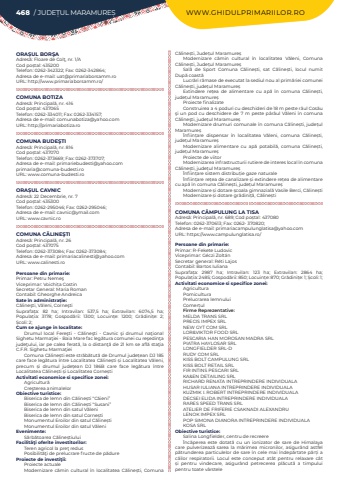 468 / JUDE%u021aUL MARAMURE%u0218 WWW.GHIDULPRIMARIILOR.ROORA%u0218UL BOR%u015eAAdres%u0103: Floare de Col%u0163, nr. 1/ACod po%u0219tal: 435200Telefon: 0262-342322; Fax: 0262-342864; Adresa de e-mail: uat@primariaborsamm.roURL: http://www.primariaborsamm.ro/COMUNA BOTIZAAdres%u0103: Principal%u0103, nr. 416Cod po%u0219tal: 437065Telefon: 0262-334011; Fax: 0262-334157; Adresa de e-mail: comunabotiza@yahoo.comURL: http://primariabotiza.roCOMUNA BUDE%u015eTIAdres%u0103: Principal%u0103, nr. 816Cod po%u0219tal: 437070Telefon: 0262-373669; Fax: 0262-373707; Adresa de e-mail: primariebudesti@yahoo.comprimaria@comuna-budesti.roURL: www.comuna-budesti.roORA%u0218UL CAVNICAdres%u0103: 22 Decembrie, nr. 7Cod po%u0219tal: 435300Telefon: 0262-295046; Fax: 0262-295046; Adresa de e-mail: cavnic@ymail.comURL: www.cavnic.roCOMUNA C%u0102LINE%u015eTIAdres%u0103: Principal%u0103, nr. 26Cod po%u0219tal: 437075Telefon: 0262-373084; Fax: 0262-373084; Adresa de e-mail: primariacalinesti@yahoo.comURL: www.calinesti.roPersoane din primarie:Primar: Petru Neme%u015fViceprimar: Voichi%u021ba CostinSecretar General: Maria RomanContabil: Gheorghe AndreicaSate %u00een administra%u021bie:C%u0103line%u015fti, V%u0103leni, Corne%u015ftiSuprafa%u021ba:%u00a0 82 ha; Intravilan:%u00a0 537,5 ha; Extravilan:%u00a0 6074,5 ha; Popula%u021bia:%u00a0 3178; Gospod%u0103rii:%u00a0 1300; Locuin%u021be:%u00a0 1200; Gr%u0103dini%u021be:%u00a0 2; %u0218coli:%u00a02; Cum se ajunge in localitate:Drumul local Fere%u015fti - C%u0103line%u015fti - Cavnic %u015fi drumul na%u0163ional Sighetu Marma%u0163iei - Baia Mare fac leg%u0103tura comunei cu re%u015fedin%u0163a jude%u0163ului, iar pe calea ferat%u0103, la o distan%u0163%u0103 de 21 km se afl%u0103 sta%u0163ia C.F.R. Sighetu Marma%u0163ieiComuna C%u0103line%u0219ti este str%u0103b%u0103tut%u0103 de Drumul jude%u021bean DJ 185 care face leg%u0103tura %u00eentre Localitatea C%u0103line%u0219ti %u0219i Localitatea V%u0103leni, precum %u0219i drumul jude%u021bean DJ 186B care face leg%u0103tura %u00eentre Localitatea C%u0103line%u0219ti %u0219i Localitatea Corne%u0219tiActivitati economice si specifice zonei:Agricultur%u0103Cre%u015fterea animalelorObiective turistice:Biserica de lemn din C%u0103line%u0219ti%u00a0%u201cC%u0103ieni%u201dBiserica de lemn din C%u0103line%u0219ti %u201cSusani%u201dBiserica de lemn din satul V%u0103leniBiserica de lemn din satul Corne%u0219tiMonumentul Eroilor din satul C%u0103line%u0219tiMonumentul Eroilor din satul V%u0103leniEvenimente:S%u0103rb%u0103toarea C%u0103line%u0219tiuluiFacilit%u00e3%u0163i oferite investitorilor:Teren agricol la pre%u0163 redusPosibilit%u0103%u0163i de prelucrare fructe de p%u0103dureProiecte de investi%u0163ii:Proiecte actualeModernizare c%u0103min cultural %u00een localitatea C%u0103line%u0219ti, Comuna C%u0103line%u0219ti, Jude%u021bul Maramure%u0219Modernizare c%u0103min cultural %u00een localitatea V%u0103leni, Comuna C%u0103line%u0219ti, Jude%u021bul Maramure%u0219Sal%u0103%u00a0 de Sport Comuna C%u0103line%u0219ti, sat C%u0103line%u0219ti, locul numit Dup%u0103%u00a0coast%u0103Lucr%u0103ri r%u0103mase de executat la sediul nou al prim%u0103riei comunei C%u0103line%u0219ti, jude%u021bul Maramure%u0219Extindere re%u021bea de alimentare cu ap%u0103%u00a0 %u00een comuna C%u0103line%u0219ti, jude%u021bul Maramure%u0219Proiecte finalizateConstruirea a 4 poduri cu deschideri de 18 m peste r%u00e2ul Cos%u0103u %u015fi un pod cu deschidere de 7 m peste p%u00e2r%u00e2ul V%u0103leni %u00een comuna C%u0103line%u015fti, jude%u021bul Maramure%u0219Modernizare drumuri comunale %u00een comuna C%u0103line%u0219ti, jude%u021bul Maramure%u0219%u00cenfiin%u021bare dispensar %u00een localitatea V%u0103leni, comuna C%u0103line%u0219ti, jude%u021bul Maramure%u0219Modernizare alimentare cu ap%u0103 potabil%u0103, comuna C%u0103line%u0219ti, jude%u021bul Maramure%u0219Proiecte de viitorModernizarea infrastructurii rutiere de interes local %u00een comuna C%u0103line%u0219ti, jude%u021bul Maramure%u0219%u00cenfiin%u021bare sistem distribu%u021bie gaze naturale%u00cenfiin%u021bare re%u021bea de canalizare %u0219i extindere re%u021bea de alimentare cu ap%u0103 %u00een comuna C%u0103line%u0219ti, jude%u021bul Maramure%u0219Modernizare %u0219i dotare %u0219coala gimnazial%u0103 Vasile Berci, C%u0103line%u0219tiModernizare %u0219i dotare gr%u0103dini%u021b%u0103, C%u0103line%u0219tiCOMUNA C%u00c2MPULUNG LA TISAAdres%u0103: Principal%u0103, nr. 689; Cod po%u0219tal: 437080Telefon: 0262-370613; Fax: 0262- 370820; Adresa de e-mail: primariacampulunglatisa@yahoo.comURL: https://www.campulunglatisa.ro/Persoane din primarie:Primar: R-Fekete LudovicViceprimar:%u00a0G%u00e9czi Zolt%u00e1nSecretar general: R%u00e9ti LajosContabil: Bartos IulianaSuprafa%u021ba:%u00a0 2987 ha; Intravilan:%u00a0 123 ha; Extravilan:%u00a0 2864 ha; Popula%u021bia:%u00a02485; Gospod%u0103rii:%u00a0850; Locuin%u021be:%u00a0870; Gr%u0103dini%u021be:%u00a01; %u0218coli:%u00a01; Activitati economice si specifice zonei:AgriculturaPomiculturaPrelucrarea lemnuluiComer%u021bulFirme Reprezentative:MELDA TRANS SRLPRECIS IMPEX SRLNEW GYT COM SRLLOR&VIKTOR FOOD SRLPESCARIA HAN MOROSAN MADRA SRLPIATRA HAYLOSAR SRLLONGFIELDER SRL-D RUDY COM SRLKISS BOLT CAMPULUNG SRLKISS BOLT RETAIL SRLFIR INTINS PESCARI SRLKA&EN DETAILING SRLRICHARD RENATA INTREPRINDERE INDIVIDUALAHUSAR IULIANA INTREPRINDERE INDIVIDUALAKUZMIK I. ROBERT INTREPRINDERE INDIVIDUALADECSEI ELIDA INTREPRINDERE INDIVIDUALARARES SPEED TRANS SRLATELIER DE FRIFERIE CSAKNADI ALEXANDRULENOK IMPEX SRLPOP SIMONA DIANORA INTREPRINDERE INDIVIDUALA KOSA SRLObiective turistice:Salina Longfielder, centru de recreere%u00cenc%u0103perea este dotat%u0103 cu un ionizator de sare de Himalaya care pulverizeaz%u0103 sarea la m%u0103rimea micronilor, asigur%u00e2nd astfel p%u0103trunderea particulelor de sare %u00een cele mai %u00eendep%u0103rtate p%u0103r%u021bi a c%u0103ilor respiratorii. Locul este conceput at%u00e2t pentru relaxare c%u00e2t %u0219i pentru 
