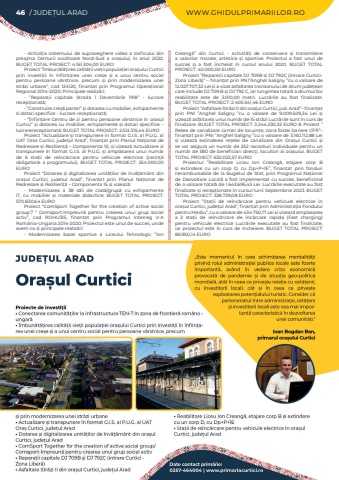 46 / JUDE%u021aUL ARAD WWW.GHIDULPRIMARIILOR.RO- Achizi%u021bia sistemului de supraveghere video a traficului din preajma Centurii ocolitoare Nord-Sud a ora%u0219ului, %u00een anul 2022; BUGET TOTAL PROIECT: 4.161.304,00 EUROProiect %u201d%u00cembun%u0103t%u0103%u021birea calit%u0103%u021bii vie%u021bii popula%u021biei ora%u0219ului Curtici prin investi%u021bii %u00een %u00eenfiin%u021barea unei cre%u0219e %u0219i a unui centru social pentru persoane v%u00e2rstnice, precum %u0219i prin modernizarea unei str%u0103zi urbane%u201d, cod 124120, finan%u021bat prin Programul Opera%u021bional Regional 2014-2020; Principale realiz%u0103ri:- %u201dRepara%u021bii capitale Strada 1 Decembrie 1918%u201d - lucrare recep%u021bionat%u0103;- %u201dConstruire cre%u0219%u0103 parter%u201d %u0219i dotarea cu mobilier, echipamente si dotari specifice - lucrare recep%u021bionat%u0103;- %u201d%u00cenfiin%u021bare Centru de zi pentru persoane v%u00e2rstnice %u00een orasul Curtici%u201d %u0219i dotarea cu mobilier, echipamente %u0219i dotari specifice %u2013 lucrarerecep%u021bionat%u0103; BUGET TOTAL PROIECT: 2.512.315,44 EUROProiect %u201dActualizare %u0219i transpunere in format G.I.S. al P.U.G. al UAT Oras Curtici, jude%u021bul Arad%u201d, finan%u021bat prin Planul Na%u021bional de Redresare %u0219i Rezilien%u021b%u0103 %u2013 Componenta 10, %u0219i vizeaz%u0103 Actualizare %u0219i transpunere %u00een format G.I.S. al P.U.G. %u0219i amplasarea unui num%u0103r de 6 sta%u021bii de re%u00eenc%u0103rcare pentru vehicule electrice (cerin%u021b%u0103 obligatorie a programului). BUGET TOTAL PROIECT: 254.000,00 EUROProiect %u201cDotarea %u0219i digitalizarea unit%u0103%u021bilor de %u00eenv%u0103%u021b%u0103m%u00e2nt din ora%u0219ul Curtici, jude%u021bul Arad%u201d, finan%u021bat prin Planul Na%u021bional de Redresare %u0219i Rezilien%u021b%u0103 %u2013 Componenta 15 %u0219i vizeaz%u0103:- Modernizarea a 38 s%u0103li de clas%u0103/grup%u0103 cu echipamente IT, cu mobilier %u0219i materiale didactice; BUGET TOTAL PROIECT: 570.830,64 EUROProiect %u201cComSport Together for the creation of active social group%u201d/ %u201d Comsport-%u00eempreun%u0103 pentru crearea unui grup social activ%u201d, cod ROHU315, finan%u021bat prin Programul Interreg V-A Rom%u00e2nia-Ungaria 2014-2020; Proiectul este unul de succes, unde avem ca %u0219i principale realiz%u0103ri:- Modernizarea bazei sportive a Liceului Tehnologic %u201dIon Creang%u0103%u201d din Curtici. - activit%u0103%u021bi de conservare %u0219i transmitere a valorilor morale, artistice %u0219i sportive. Proiectul a fost unul de succes %u0219i a fost %u00eencheiat %u00een cursul anului 2020. BUGET TOTAL PROIECT: 40.000,00 EUROProiect %u201dRepara%u021bii capitale DJ 709B %u0219i DJ 792C (intrare CurticiZona Liber%u0103)%u201d %u2013 finan%u021bat prin PNI%u201dAnghel Saligny %u201dcu o valoare de 12.027.707,32 Lei %u0219i a vizat asfaltarea tronsonului de drum jude%u021bean care include DJ 709 B %u0219i DJ 792 C, iar lungimea total%u0103 a drumurilor reabilitate este de 3.010,00 metri. Lucr%u0103rile au fost finalizate. BUGET TOTAL PROIECT: 2.405.541,46 EUROProiect %u201dAsfaltare Str%u0103zi II din ora%u0219ul Curtici, jud. Arad%u201d%u2013 finan%u021bat prin PNI %u201dAnghel Saligny %u201dcu o valoare de 9.009.509,34 Lei %u0219i vizeaz%u0103 asfaltarea unui num%u0103r de 15 str%u0103zi Lucr%u0103rile sunt %u00een curs de finalizare. BUGET TOTAL PROIECT: 3.244.230,32 EURO 8. Proiect %u201d Re%u021bea de canalizare cartier de locuin%u021be, zona fostei bariere CFR%u201d%u2013 finan%u021bat prin PNI %u201dAnghel Saligny %u201dcu o valoare de 3.160.112,88 Lei %u0219i vizeaz%u0103 extinderea re%u021belei de canalizare din Ora%u0219ul Curtici %u0219i se vor asigura un num%u0103r de 252 racorduri individuale pentru un num%u0103r de 580 de beneficiari direc%u021bi, locuitori ai ora%u0219ului. BUGET TOTAL PROIECT: 632.022,57 EUROProiectul %u201dReabilitare Liceu Ion Creang%u0103, etajare corp B %u0219i extindere cu un corp D, cu Dp+P+1E%u201d, finan%u021bat prin fonduri nerambursabile de la Bugetul de Stat, prin Programul Na%u021bional de Dezvoltare Local%u0103 a fost implementat cu succes, beneficiind de o valoare total%u0103 de 1.643.695,43 Lei. Lucr%u0103rile executate au fost finalizate %u0219i recep%u021bionate %u00een cursul lunii Septembrie 2023. BUGET TOTAL PROIECT: 328.739,08 EURO Proiect %u201dSta%u021bii de re%u00eenc%u0103rcare pentru vehicule electrice %u00een ora%u0219ul Curtici, jude%u021bul Arad%u201d, finan%u021bat prin Administra%u021bia Fondului pentru Mediu%u201d, cu o valoare de 434.750,71 Lei %u0219i vizeaz%u0103 amplasarea a 2 sta%u021bii de re%u00eenc%u0103rcare de %u00eenc%u0103rcare rapida (Fast charging) pentru vehicule electrice Lucr%u0103rile executate au fost finalizate, iar proiectul este %u00een curs de %u00eencheiere. BUGET TOTAL PROIECT: 86.950,14 EURO