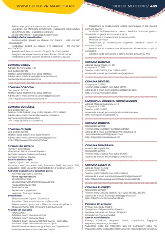 WWW.GHIDULPRIMARIILOR.RO JUDE%u021aUL MEHEDIN%u021aI / 489Prelucrarea primar%u0103 a lemnului sat PoianaInvestitori - SC MINERAL INVEST SRL - exploatare nisip cuar%u0163osSC EXPOLIG SRL - exploatare c%u0103rbuneSC BETANIM SRL - exploata%u0163ie zootehnic%u0103Facilit%u00e3%u0163i oferite investitorilor:Reconstruc%u0163ie %u015ecoal%u0103 cu clasele I-IV Poiana - 490 mii lei/H.G.300/2007Reabilitare %u015ecoal%u0103 cu clasele I-IV C%u0103z%u0103ne%u015fti - 90 mii lei/H.G.219/2007Reabilitare infrastuctur%u0103 DC 15 %u015fi DC 16 - 1000 mii leiProgram de alimentare cu ap%u0103 sat Ercea - 3000 mii leiReabilitare c%u0103min cultural (biseric%u0103 %u015fi c%u0103min cultural)COMUNA CIRE%u015eUAdres%u0103: str.Principala , FNCod po%u0219tal: 227120Telefon: 0252-388650; Fax: 0252-388650; Adresa de e-mail: clciresu@primariaciresu.rocontact@comunaciresumh.roCOMUNA CORCOVACod po%u0219tal: 227125Telefon: 0252-383464; Fax: 0252-383465; Adresa de e-mail: primaria.corcova@gmail.comURL: http://www.comunacorcova.roCOMUNA CORL%u0102%u0162ELCod po%u0219tal: 227145Telefon: 0252-708990; Fax: 0252-708990, 0372-251563; Adresa de e-mail: contact@primaria-corlatel.roprimariacorlatel@yahoo.comURL: https://primaria-corlatel.ro/COMUNA CUJMIRCod po%u0219tal: 227150Telefon: 0252-390011; Fax: 0252-390016; Adresa de e-mail: primariacujmir@pejmh.roURL: https://www.comunacujmir.ro/Persoane din primarie:Primar:%u00a0Florin%u00a0Cerg%u0103%u00a0Viceprimar:%u00a0Petre Nicolae%u00a0Popescu%u00a0Secretar General: Valentina%u00a0Predu%u0163%u00a0Contabil: Cristinel%u00a0Predu%u0163Sate %u00een administra%u021bie:Cujmir, Cujmiru Mic, AuroraSuprafa%u021ba:%u00a0 4410; Intravilan:%u00a0 447; Extravilan:%u00a0 3963; Popula%u021bia:%u00a0 3221; Gospod%u0103rii:%u00a01260; Locuin%u021be:%u00a01260; Gr%u0103dini%u021be:%u00a03; %u0218coli:%u00a02; Licee:%u00a01; Activitati economice si specifice zonei:Activit%u0103%u021bi agricole %u0219i comer%u021bFirme reprezentative:SC AGROCUJ SRLSC AGRICULTURA MONTECAVALO SRLProduc%u0103tori locali: 100Produse locale:Pepeni verzi %u0219i galbeniLegume - fructe %u0219i cereale%u00a0Evenimente:Zilele comunei Cujmir - DuminicaRusaliilor Zilele satului Aurora - Sf%u00e2ntul IlieZilele satului Cujmiru Mic - Sf%u00e2ntul Constantin %u0219i Elena T%u00e2rgul comunal este %u00een fiecare zi de duminic%u0103Proiecte de investi%u0163ii:FINALIZATE:Asfaltare drum comunal cimitirAsfaltare drum comunal t%u00e2rgAsfaltare drum comunal DC 100 Cujmir - Br%u0103ni%u0219teaAsfaltare uli%u021be comunale comuna CujmirReabilitare %u0219i modernizare gr%u0103dini%u021b%u0103 sat Cujmiru MicAmenajare centru civic comuna CujmirReabilitare %u0219i modernizare %u0219coala gimnazial%u0103 %u00een sat Aurora comuna CujmirAchizi%u021bie buldoexcavator pentru Serviciul Voluntar pentru Situa%u021bii de Urgen%u021b%u0103 al Comunei CujmirReabilitare %u0219i modernizare iluminat publicProiecte de viitor:Reabilitare %u0219i modernizare dispensar medical uman %u00een comuna CujmirReabilitare %u0219i modernizare sisteme de alimentare cu ap%u0103 %u0219i canalizareAsfaltare uli%u021be comunale %u0219i satele Aurora %u0219i Cujmiru MicCOMUNA D%u00c2RVARIAdres%u0103: Calea Traian, nr. 121Cod po%u0219tal: 227155Telefon: 0252-392101; Fax: 0352-524173; Adresa de e-mail: primariadirvari@pejmh.roCOMUNA DEVESELCod po%u0219tal: 227160Telefon: 0252-353257; Fax: 0252-707111; Adresa de e-mail: comunadevesel@gmail.comURL: www.comunadevesel.ro MUNICIPIUL DROBETA TURNU SEVERINAdres%u0103: Mare%u015fal Averescu, nr. 2Cod po%u0219tal: 220131Telefon: 0252-316317; Adresa de e-mail: primaria@primariadrobeta.roURL: www.primariadrobeta.roCOMUNA DUBOVACod po%u0219tal: 227170Telefon: 0252-368002; Fax: 0252-368002; Adresa de e-mail: contact@primariadubova.ro primariadubova2015@yahoo.comURL: https://primariadubova.ro/COMUNA DUMBRAVAAdres%u0103: Principal%u0103, FNCod po%u0219tal: 227175Telefon: 0252-342661; Fax: 0252-342661; Adresa de e-mail: secretar@cldumbrava.roCOMUNA E%u015eELNI%u0162AAdres%u0103: Teilor, nr. 542Cod po%u0219tal: 227195Telefon: 0252-365070; Fax: 0252-365143; Adresa de e-mail: consiliullocaleselnita@yahoo.comURL: https://sites.google.com/site/primariaeselnitaCOMUNA FLORE%u015eTICod po%u0219tal: 227200Telefon: 0252-383322, 383375; Fax: 0252-383322, 383375; Adresa de e-mail: florestiprimaria@yahoo.comURL: http://www.comunafloresti.ro/Persoane din primarie:Primar: ing. Radu Pas%u0103reViceprimar: Grigore Adrian FleancuSecretar General: Ion Dorian Dr%u0103ghiciContabil: ec. Viorica Cioab%u0103Sate %u00een administra%u021bie:Flore%u015fti, G%u00e2rdoaia, Mo%u015fneni, Livezi, Cop%u0103cioasa, Zegujani, Pe%u015fteana, Pe%u015ftenu%u0163a, Stroie%u015ftiSuprafa%u021ba:%u00a0 5300 ha; Intravilan:%u00a0 236 ha; Extravilan:%u00a0 4864 ha; Popula%u021bia:%u00a02605; Gospod%u0103rii:%u00a01130; Locuin%u021be:%u00a01100; Gr%u0103dini%u021be:%u00a05; %u0218coli:%u00a05;