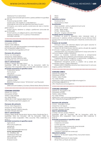 WWW.GHIDULPRIMARIILOR.RO JUDE%u021aUL MEHEDIN%u021aI / 491Realizarea P.U.G G%u00e2rla MareConstruc%u021bie scen%u0103 de spectacole cu platou asfaltat %u00een suprafa%u021b%u0103 de 100 mpProiecte propuse 2024 - 2028Construc%u021bia unei Capele %u00een curtea Bisericii IAmenajarea unei zone de Agrement pe Malul Dun%u0103rii%u00cenfiin%u0163area unui sector pentru construirea de case a tinerilor p%u00e2n%u0103 la 35 aniProiect pentru dotarea cu utilaje a platformei comunale de gunoi de grajdProiect pentru un ad%u0103post pentru c%u00e2inii f%u0103r%u0103 st%u0103p%u00e2nDotarea Unit%u0103%u021bilor U.A.T cu panouri FotovoltaiceActivit%u0103%u0163i culturaleCOMUNA GODEANUCod po%u0219tal: 227215Telefon: 0252-388540; Adresa de e-mail: secretargodeanumehedinti@yahoo.comprimariagodeanu@gmail.comURL: https://comunagodeanumh.ro/Persoane din primarie:Primar:%u00a0Ion%u00a0GheorgheciViceprimar: Vasile%u00a0D%u0103escuSecretar General: Valentina%u00a0RafaContabilitate: Serviciu ExternalizatSate %u00een administra%u021bie:Godeanu, Marga, P%u0103une%u015fti, SirocaSuprafa%u021ba:%u00a0 4759 ha; Intravilan:%u00a0 120 ha; Extravilan:%u00a0 4639 ha; Popula%u021bia:%u00a0749; Gospod%u0103rii:%u00a0630; Locuin%u021be:%u00a0639; Gr%u0103dini%u021be:%u00a01; %u0218coli:%u00a01; Activitati economice si specifice zonei:Producerea varuluiPomicultur%u0103Viticultur%u0103Cre%u015fterea animalelorObiective turistice:Pe%u0219tera Topolni%u021baCetatea GradetBiserica monument istoric %u201cSf Dimitrie%u201d ( sat P%u0103une%u0219ti)Evenimente:Zilele comunei Godeanu, Ciumarca, Sfanta Marie, Sfantul DimitrieCOMUNA GOGO%u015eUAdres%u0103: Str. Carol ICod po%u0219tal: 227220Telefon: 0252-357228; Fax: 0252-357104; Adresa de e-mail: clgogosu@gmail.comURL: http://www.primaria-gogosu.ro/Persoane din primarie:Primar: Jean RogoveanuViceprimar: Floric%u0103 BalicaSecretar General: Cristina ManofuContabil: Mihaela Br%u00e2nzanSate %u00een administra%u021bie:Gogo%u015fu, Balta Verde, Burila Mic%u0103, Ostrovu Mare, Por%u0163ile de Fier IISuprafa%u021ba:%u00a0 12124 ha; Intravilan:%u00a0 439 ha; Extravilan:%u00a0 11685 ha; Popula%u021bia:%u00a0 4450; Gospod%u0103rii:%u00a0 1760; Locuin%u021be:%u00a0 1760; Gr%u0103dini%u021be:%u00a0 4; %u0218coli:%u00a04; Activitati economice si specifice zonei:Agricultur%u0103Piscicultur%u0103 (pescuit)Apicultur%u0103Panifica%u0163ieProducerea energiei electriceFirme reprezentative:S.C. STEGRAL SRLHIDROELECTRICA SAANTA COM MIXT SRLDILAGRO SRLProduse locale:P%u00e2ineMiere%u00a0Obiective turistice:Por%u021bile de fier IIInsula Ostrovu MareEvenimente:Zilele localit%u0103%u021bii %u2013ultimul wekend al lunii Iunie%u00cen fiecare zi de vineri - t%u00e2rg17 Mai - Balta Verde27 Mai - Ostrovu Mare29 Iunie - Gogo%u015fu %u015fi Burila Mic%u0103Facilit%u00e3%u0163i oferite investitorilor:Prim%u0103ria va pune la dispozi%u0163ia celor interesa%u0163i teren %u015fi construc%u0163ii %u00een vederea utiliz%u0103rii acestora pe Insula Ostrovul Mare (construirea unui sat de vacan%u0163%u0103, parc industrial, construirea unor fabrici)Proiecte de investi%u0163ii:%u00cenfiin%u021bare centru de colectare de%u015feuri prin aport voluntar %u00een comuna Gogo%u0219u, jude%u021bul Mehedin%u021biDotare cu atv a serviciului voluntar pentru situa%u0163ii de urgen%u021b%u0103 al comunei%u00a0 Gogo%u015fu, jude%u021bul Mehedin%u021biAchizi%u021bionarea unui microbuz nepoluant %u00een scop comunitar %u00een comuna Gogo%u015fu, jude%u021bul Mehedin%u021biDotare cu mobilier, materiale didactice %u0219i echipamente digitale a unit%u0103%u021bii de %u00eenv%u0103%u021b%u0103m%u00eent preuniversitar %u0219coala Gogo%u0219uCre%u015fterea eficien%u0163ei energetice %u0219i gestionarea inteligent%u0103 a energiei %u00een cladiri publice- gr%u0103dini%u021ba Gogo%u0219uReabilitare energetic%u0103 %u015fcoala cu clasele i-viii %u015fi anexe din localitatea Gogo%u015fu, jude%u0163ul Mehedin%u021biModernizare %u0219i reabilitare drumuri de interes local %u00een comuna Gogo%u0219u, jude%u021bul Mehedin%u021biCOMUNA GRECIAdres%u0103: Principala, FNCod po%u0219tal: 227225Telefon: 0252-374250; Fax: 0252-374250; Adresa de e-mail: primariagreci@comunagreci.roprimariagreci@pejmh.ro,URL: http://www.comunagreci.roCOMUNA GROZE%u015eTIAdres%u0103: str. Principal%u0103 nr.26Cod po%u0219tal: 227235Telefon: 0252-373750; Fax: 0252-373750; Adresa de e-mail: primariagrozesti@pejmh.roURL: https://comunagrozestimh.ro/Persoane din primarie:Primar:%u00a0 Gheorghe%u00a0ComanViceprimar: Ion%u00a0IepureSecretar General: Carmen%u00a0Croitoru%u00a0Contabil: Olimpia%u00a0CiorteaSate %u00een administra%u021bie:Groze%u015fti, C%u00e2rceni, %u015eu%u015fi%u0163a, P%u0103s%u0103raniSuprafa%u021ba:%u00a0 4295 ha; Intravilan:%u00a0 185 ha; Extravilan:%u00a0 4075 ha; Popula%u021bia:%u00a0 874; Gospod%u0103rii:%u00a0 1200; Locuin%u021be:%u00a0 985; Gr%u0103dini%u021be:%u00a0 3; %u0218coli:%u00a03; Activitati economice si specifice zonei:Activit%u0103%u0163i forestiereCre%u015fterea animalelorLucr%u0103ri agricoleMuncitori %u00een zone miniere din zone limitrofeM%u0103cini%u015ful porumbului - %u015ftiuleteTreieratul p%u0103ioaselor Transport materiale de construc%u0163ii%u00a0Obiective turistice:Biserica %u201cSf. Nicolae%u201d %u015eu%u015fi%u0163a (1704), monument istoricEvenimente:%u00cen%u0103l%u0163area Domnului %u00een satul %u015eu%u015fi%u0163aSfin%u0163ii Petru %u015fi Pavel, sat C%u00e2rceni