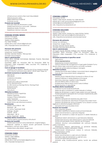Infrastructura rutier%u0103 a fost mult %u00eenbun%u0103t%u0103%u0163it%u0103Televiziune prin cabluRe%u0163ea telefonic%u0103 modern%u0103For%u0163%u0103 de munc%u0103Proiecte de investi%u0163ii:Execu%u0163ie re%u0163ea de alimentare cu ap%u0103Modernizare drumuri comunale - asfaltareReabilitare Sediu Prim%u0103rieReabilitare C%u0103mine CulturaleCOMUNA IZVORU B%u00c2RZIIAdres%u0103: Principal%u0103Cod po%u0219tal: 227295Telefon: 0720-220074; Fax: 0252-707555; Adresa de e-mail: clizvorul@gmail.com URL: https://primaria-izvorubarzii.ro/Persoane din primarie:Primar: Horia%u00a0Balica%u00a0Viceprimar: Aurel Dr%u0103ghiaSecretar General:%u00a0Mioara - Petru%u0163a%u00a0DanContabil:%u00a0Silvia%u00a0Dr%u0103ghiaSate %u00een administra%u021bie:Izvoru%u00a0 B%u00eerzii, Hal%u00eenga, Schinteie%u015fti, Balote%u015fti, Pu%u0163inei, Rascole%u015fti, Schitu Topolni%u0163eiSuprafa%u021ba:%u00a0 6880 ha; Intravilan:%u00a0 950 ha; Extravilan:%u00a0 5930 ha; Popula%u021bia:%u00a0 2766; Gospod%u0103rii:%u00a0 1480; Locuin%u021be:%u00a0 1711; Gr%u0103dini%u021be:%u00a0 3; %u0218coli:%u00a01; Licee:%u00a01; Cum se ajunge in localitate:Drobeta-Turnu-Severin- DN 67 la Km 5,5 se vireaz%u0103 la st%u0103nga 4 Km Centrul comunei Izvoru B%u00e2rzii- DN 67 spre T%u00e2rgu JiuActivitati economice si specifice zonei:Apicultur%u0103Viticultur%u0103Cre%u0219terea animalelorPomicultur%u0103Construc%u021bii civile %u0219i industrialeFirme reprezentativeSc Alfa Construct Romag Termo- Romag ProdProduse locale:Pomicultur%u0103Viticultur%u0103Obiective turistice:M%u0103n%u0103stria Schitu Topolini%u0163aPe%u015ftera Topolin%u0163aGeoparc Platoul Mehedin%u0163iValea Topolni%u021beiTraseu turistic Via TransilvaniaExist%u0103 Centru de informare turistic%u0103Evenimente:Nedee: Izvorul B%u00e2rzii - 8XIBalote%u0219ti - 08XII: Schitu Topolne%u0219ti 15.08Hal%u00eenga - RusaliiPu%u021binei - 25.05R%u0103scole%u0219ti - 08. XISchitu Topolni%u021bei - 29.08Facilit%u00e3%u0163i oferite investitorilor:Terenuri pentru pomicultur%u0103 %u0219i viticultur%u0103Proiecte de investi%u0163ii:Modernizare drumuri comunale 8,8 km- Anghel SalignyRepara%u021bii capitale %u0219i dotare %u0218coala gimnazial%u0103 Dumitru Or%u0103%u0219oveanu, comuan Izvoru B%u00e2rzii Modernizare uli%u021be s%u0103te%u0219ti- buget localCOMUNA JIANACod po%u0219tal: 227305Telefon: 0252-358845; Fax: 0252-358845; Adresa de e-mail: primariajiana@yahoo.comURL: https://primariajiana.ro/COMUNA LIVEZILECod po%u0219tal: 227310Telefon: 0252-354101, 354102; Fax: 0252-354101; Adresa de e-mail: primarialivezile@pejmh.comcontact@comunalivezilemh.roURL: https://comunalivezilemh.ro/COMUNA MALOV%u0102%u0162Cod po%u0219tal: 227315Telefon: 0252-707211, 707210; Fax: 0252-707210, 707211; Adresa de e-mail: primaria@comunamalovat.roURL: https://comunamalovat.ro/contact/primaria/Persoane din primarie:Primar: Ion MichescuViceprimar: Angelu PaicuSecretar General: Marian SurduContabil: Marinela Ileana BonceaSate %u00een administra%u021bie:23 August, Barda, Bobai%u0163a, Coliba%u015fi, Lazu, Malov%u0103%u0163, Negre%u015ftiSuprafa%u021ba:%u00a0 7840; Intravilan:%u00a0 275,61 ha; Extravilan:%u00a0 4684 ha; Popula%u021bia:%u00a0 2780; Gospod%u0103rii:%u00a0 1774; Locuin%u021be:%u00a0 1774; Gr%u0103dini%u021be:%u00a0 2; %u0218coli:%u00a03; Activitati economice si specifice zonei:AgriculturaFirme reprezentative:Exploatarea minier%u0103 Hu%u0219nicioaraCentrul na%u021bional de management al apei grele Drobeta Turnu Severin (fosta regia autonom%u0103 pentru activit%u0103%u021bi nucleare) Sta%u021bie de sortare selectiv%u0103 de%u0219euri menajereObiective turistice:Cetatea Dacic%u0103 din satul Coliba%u0219i- monument istoric categoria b Cula din lazu monument istoric categoria bEvenimente:Nedeia satului Malov%u0103%u021b Sfin%u021bii Constantin %u0219i Elena 21 maiIspasul/ %u00een%u0103l%u021barea %u00een satele Bobai%u021ba %u0219i 23 AugustDuminica mare sau rusaliile %u00een satul Negre%u0219ti29 Iunie Sf%u00e2ntu Petru %u00een satul Lazu8 Septembrie Sf%u00e2nta Marie mic%u0103 %u00een satul Coliba%u0219iS%u00e2ntul Dumitru %u00een satul B%u00eerdaFacilit%u00e3%u0163i oferite investitorilor:For%u021b%u0103 de munc%u0103 local%u0103 diversificat%u0103Re%u021bea de ap%u0103 %u0219i canalizare %u00een satele Malov%u0103%u021b %u0219i Coliba%u0219iRe%u021bea de alimentare cu ap%u0103 %u00een toate satele comunei Malov%u0103%u021bPozi%u021bie geografic%u0103 apropiat%u0103 de municipiul re%u0219edin%u021b%u0103 de jude%u021b cu c%u0103i de leg%u0103tur%u0103 rapideOportunit%u0103%u0163i:Distan%u021ba apropiat%u0103 de re%u0219edin%u021ba de jude%u021b 10 kmDistan%u021ba apropiat%u0103 de calea ferat%u0103 Timi%u0219oara Bucure%u0219ti 12 kmDistan%u021ba apropiat%u0103 de centura Drobeta Turnu Severin ce face leg%u0103tura cu drumul european e70 9 km Apropiere de fluviul dun%u0103rea 12 kmProiecte de investi%u0163ii:Plan urbanistic generalExtindere reabilitare %u0219i dotare %u0219coala primar%u0103 Malov%u0103%u021bSistem de alimentare cu ap%u0103 satul Negre%u0219tiRe%u021bea de canalizare %u0219i sta%u021bie de epurare %u00een satele Malov%u0103%u021b %u0219i Coliba%u0219iReabilitare sistem alimentare cu ap%u0103 Malov%u0103%u021b %u0219i Bobai%u021baModernizare drumuri de interes local %u00een comuna Malov%u0103%u021bConstruire pod peste matca vi%u0219enilor sat 23 AugustAsfaltare drumuri comunale/s%u0103te%u0219ti din comuna Malov%u0103%u021b, jude%u021bul Mehedin%u021biReabilitarea sediului administrativ al prim%u0103riei Malov%u0103%u021b, comuna Malov%u0103%u021b, jude%u021bul Mehedin%u021bi ( PNRR)Modernizarea infrastructurii rutiere %u00een comuna Malov%u0103%u021b, jude%u0163ul Mehedin%u021bi ( AFIR)Proiecte realizateSistem de alimentare cu ap%u0103 comuna Malov%u0103%u021bExtindere re%u021bea de alimentare cu ap%u0103 sat LazuConstruire baz%u0103 sportiv%u0103 Malov%u0103%u021bAchizi%u021bie utilaj multifunc%u021bional pentru lucr%u0103ri de utilitate public%u0103WWW.GHIDULPRIMARIILO