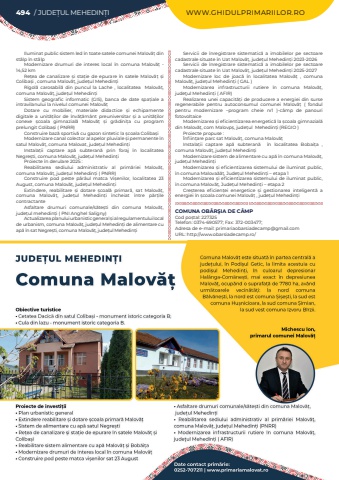 494 / JUDE%u021aUL MEHEDIN%u021aI WWW.GHIDULPRIMARIILOR.ROIluminat public sistem led %u00een toate satele comunei Malov%u0103%u021b din st%u00e2lp %u00een st%u00e2lpModernizare drumuri de interes local %u00een comuna Malov%u0103%u021b - 14,52 kmRe%u021bea de canalizare %u0219i sta%u021bie de epurare %u00een satele Malov%u0103%u021b %u0219i Coliba%u0219i , comuna Malov%u0103%u021b, jude%u021bul Mehedin%u021biRigol%u0103 carosabil%u0103 din puncul la Lache , localitatea%u00a0 %u00a0 Malov%u0103%u021b, comuna Malov%u0103%u021b, jude%u021bul Mehedin%u021biSistem geografic informatic (GIS), banca de date spa%u021biale a intravilanului la nivelul comunei Malov%u0103%u021bDotare cu mobilier, materiale didactice %u0219i echipamente digitale a unit%u0103%u021bilor de %u00eenv%u0103%u021b%u0103m%u00e2nt preuniversitar %u0219i a unit%u0103%u021bilor conexe %u0219coala gimnazial%u0103 Malov%u0103%u021b %u0219i gr%u0103dini%u021ba cu program prelungit Coliba%u0219i ( PNRR)Construire baz%u0103 sportiv%u0103 cu gazon sintetic la %u0219coala Coliba%u0219iModernizare canal colector al apelor pluviale %u0219i permanente %u00een satul Malov%u0103%u021b, comuna Malovat, jude%u021bul Mehedin%u021bi Instala%u021bii captare ap%u0103%u00a0 subteran%u0103%u00a0 prin foraj %u00een localitatea Negre%u0219ti, comuna Malov%u0103%u021b, jude%u021bul Mehedin%u021biProiecte %u00een derulare 2025 :Reabilitarea sediului administrativ al prim%u0103riei Malov%u0103%u021b, comuna Malov%u0103%u021b, jude%u021bul Mehedin%u021bi ( PNRR)Construire pod peste p%u00e2r%u00e2ul matca Vi%u0219enilor, localitatea 23 August, comuna Malov%u0103%u021b, jude%u021bul Mehedin%u021biExtindere, reabilitare %u0219i dotare %u0219coal%u0103 primar%u0103, sat Malov%u0103%u021b, comuna Malov%u0103%u021b, jude%u021bul Mehedin%u021bi %u00eencheiat %u00eentre p%u0103r%u021bile contractanteAsfaltare drumuri comunale/s%u0103te%u0219ti din comuna Malov%u0103%u021b, jude%u021bul mehedin%u021bi ( PNI Anghel Saligny)Actualizarea planului urbanistic general %u0219i al regulamentului local de urbanism, comuna Malov%u0103%u021b, jude%u021bul Mehedin%u021bi de alimentare cu ap%u0103%u00a0%u00een sat Negre%u0219ti, comuna Malov%u0103%u021b, jude%u021bul Mehedin%u021biServicii de %u00eenregistrare sistematic%u0103 a imobilelor pe sectoare cadastrale situate %u00een Uat Malov%u0103%u021b, jude%u021bul%u00a0Mehedin%u021bi 2023-2026Servicii de %u00eenregistrare sistematic%u0103 a imobilelor pe sectoare cadastrale situate %u00een Uat Malov%u0103%u021b, jude%u021bul%u00a0Mehedin%u021bi 2025-2027Modernizare loc de joac%u0103 %u00een localitatea Malov%u0103%u021b , comuna Malov%u0103%u021b, jude%u021bul Mehedin%u021bi ( GAL%u00a0)Modernizarea infrastructurii rutiere %u00een comuna Malov%u0103%u021b, jude%u0163ul Mehedin%u021bi ( AFIR)Realizarea unei capacit%u0103%u021bi de producere a energiei din surse regenerabile pentru autoconsumul comunei Malov%u0103%u021b ( fondul pentru modernizare %u2013program cheie nr1 )-c%u00e2mp de panouri fotovoltaiceModernizarea %u0219i eficientizarea energetic%u0103 la %u0219coala gimnazial%u0103 din Malov%u0103%u021b, com Malovp%u0219, jude%u021bul%u00a0 Mehedin%u021bi (REGIO ) Proiecte propuse :%u00cenfiin%u021bare parc sat Malov%u0103%u021b, comuna Malov%u0103%u021bInstala%u021bii captare ap%u0103%u00a0 subteran%u0103%u00a0 %u00een localitatea Bobai%u021ba , comuna Malov%u0103%u021b, jude%u021bul Mehedin%u021biModernizare sistem de alimentare cu ap%u0103 %u00een comuna Malov%u0103%u021b, jude%u021bul Mehedin%u021biModernizarea %u0219i eficientizarea sistemului de iluminat public, %u00een comuna Malova%u0103%u0103%u021b, Jude%u021bul Mehedin%u021bi %u2013 etapa 1Modernizarea %u0219i eficientizarea sistemului de iluminat public, %u00een comuna Malov%u0103%u021b, Jude%u021bul Mehedin%u021bi %u2013 etapa 2Cre%u0219terea eficien%u021bei energetice %u0219i gestionarea inteligent%u0103 a energiei %u00een %u0219coala comunei Malov%u0103%u021b , jude%u021bul Mehedin%u021biCOMUNA OB%u00c2R%u015eIA DE C%u00c2MPCod po%u0219tal: 227325Telefon: 0374-690577; Fax: 372-003477; Adresa de e-mail: primariaobarsiadecamp@gmail.comURL: http://www.obarsiadecamp.ro/