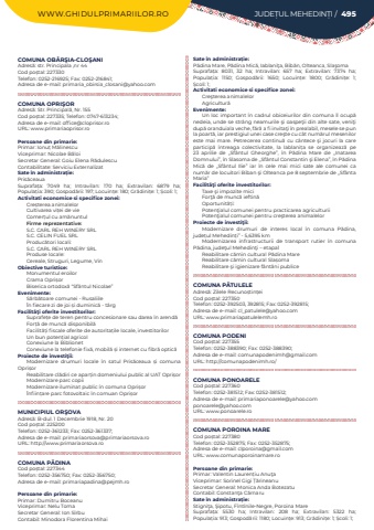 WWW.GHIDULPRIMARIILOR.RO JUDE%u021aUL MEHEDIN%u021aI / 495COMUNA OB%u00c2R%u015eIA-CLO%u015eANIAdres%u0103: str. Principala ,nr 44Cod po%u0219tal: 227330Telefon: 0252-216925; Fax: 0252-216841; Adresa de e-mail: primaria_obirsia_closani@yahoo.comCOMUNA OPRI%u015eORAdres%u0103: Str. Principal%u0103, Nr. 155Cod po%u0219tal: 227335; Telefon: 0747-613234; Adresa de e-mail: office@cloprisor.roURL: www.primariaoprisor.roPersoane din primarie:Primar: Ionu%u021b M%u0103linescuViceprimar: Nicolae B%u0103loiSecretar General: Goiu Elena%u00a0R%u0103dulescuContabilitate: Serviciu ExternalizatSate %u00een administra%u021bie:Pris%u0103ceauaSuprafa%u021ba:%u00a0 7049 ha; Intravilan:%u00a0 170 ha; Extravilan:%u00a0 6879 ha; Popula%u021bia:%u00a0390; Gospod%u0103rii:%u00a0197; Locuin%u021be:%u00a0180; Gr%u0103dini%u021be:%u00a01; %u0218coli:%u00a01; Activitati economice si specifice zonei:Cre%u0219terea animalelorCultivarea vi%u021bei de vieComer%u021bul cu am%u0103nuntulFirme reprezentative:S.C. CARL REH WINERY SRLS.C. CELIN FUEL SRLProduc%u0103tori locali:S.C. CARL REH WINERY SRLProduse locale: Cereale, Struguri, Legume, VinObiective turistice:Monumentul eroilorCrama Opri%u0219or Biserica ortodox%u0103 %u201cSf%u00e2ntul Nicolae%u201dEvenimente:S%u0103rb%u0103toare comunei - Rusaliile%u00cen fiecare zi de joi %u0219i duminic%u0103 - t%u00e2rgFacilit%u00e3%u0163i oferite investitorilor:Suprafe%u021be de teren pentru concesionare sau darea %u00een arend%u0103For%u021b%u0103 de munc%u0103 disponibil%u0103Facilit%u0103%u021bi fiscale oferite de autorita%u021bile locale, investitorilorUn bun poten%u021bial agricolConexiune la Biblionet Conexiune la telefonie fix%u0103, mobil%u0103 %u0219i internet cu fibr%u0103 optic%u0103Proiecte de investi%u0163ii:Modernizare drumuri locale %u00een satul Pris%u0103ceaua %u0219i comuna Opri%u0219orReabilitare cl%u0103diri ce apar%u021bin domeniului public al UAT Opri%u0219orModernizare parc copiiModernizare iluminat public%u00a0%u00een comuna Opri%u0219or %u00cenfiin%u021bare parc fotovoltaic %u00een comuan Opri%u0219orMUNICIPIUL OR%u015eOVAAdres%u0103: B-dul. 1 Decembrie 1918, Nr. 20Cod po%u0219tal: 225200Telefon: 0252-361233; Fax: 0252-361337; Adresa de e-mail: primariaorsova@primariaorsova.roURL: http://www.primariaorsova.roCOMUNA P%u0102DINACod po%u0219tal: 227344Telefon: 0252-356750; Fax: 0252-356750; Adresa de e-mail: primariapadina@pejmh.roPersoane din primarie:Primar: Dumitru%u00a0BoceanuViceprimar: Nelu TomaSecretar General: Ion%u00a0S%u00eerbu%u00a0Contabil: Minodora Florentina Mihai%u00a0Sate %u00een administra%u021bie:P%u0103dina Mare, P%u0103dina Mic%u0103, Iablani%u0163a, Bib%u0103n, Olteanca, Sla%u015fomaSuprafa%u021ba:%u00a0 8031, 32 ha; Intravilan:%u00a0 657 ha; Extravilan:%u00a0 7374 ha; Popula%u021bia:%u00a0 1150; Gospod%u0103rii:%u00a0 1650; Locuin%u021be:%u00a0 1800; Gr%u0103dini%u021be:%u00a0 1; %u0218coli:%u00a01; Activitati economice si specifice zonei:Cre%u015fterea animalelorAgricultur%u0103%u00a0Evenimente:Un loc important %u00een cadrul obiceiurilor din comuna %u00eel ocup%u0103 nedeia, unde se str%u00e2ng neamurile %u015fi oaspe%u0163ii din alte sate, veni%u0163i dup%u0103 oranduiala veche, f%u0103r%u0103 a fi invita%u0163i %u00een prealabil, mesele se pun la poart%u0103, iar prestigiul unei case cre%u015fte cu c%u00e2t num%u0103rul mesenilor este mai mare. Petrecerea continu%u0103 cu c%u00e2ntece %u015fi jocuri la care particip%u0103 %u00eentreaga colectivitate, la lablani%u021ba se organizeaz%u0103 pe 23 aprilie de %u201eSf%u00e2ntul Gheorghe%u201d, %u00een P%u0103dina Mare de ,,Inatarea Domnului%u201d, %u00een Slasoma de ,,Sf%u00e2ntul Constantin %u015fi Elena%u201d, %u00een P%u0103dina Mic%u0103 de %u201eSf%u00e2ntul Ilie%u201d iar %u00een cele mai mici sate ale comunei ca num%u0103r de locuitori Biban %u015fi Olteanca pe 8 septembrie de ,,Sf%u00e2nta Maria%u201dFacilit%u00e3%u0163i oferite investitorilor:Taxe %u015fi impozite miciFor%u0163%u0103 de munc%u0103 ieftin%u0103Oportunit%u0103%u021bi:Poten%u0163ialul comunei pentru practicarea agriculturiiPoten%u0163ialul comunei pentru cre%u015fterea animalelorProiecte de investi%u0163ii:Modernizare drumuri de interes local %u00een comuna P%u0103dina, jude%u021bul Mehedin%u021bi%u201d - 5,6395 kmModernizarea infrastructurii de transport rutier %u00een comuna P%u0103dina, jude%u0163ul Mehedin%u0163i %u2013 etapa1Reabilitare c%u0103min cultural P%u0103dina MareReabilitare c%u0103min cultural Sla%u0219oma Reabilitare %u015fi igienizare f%u00e2nt%u00e2ni publiceCOMUNA P%u0102TULELEAdres%u0103: Zilele Recuno%u0219tin%u021beiCod po%u0219tal: 227350Telefon: 0252-392503, 392815; Fax: 0252-392815; Adresa de e-mail: cl_patulele@yahoo.comURL: www.primariapatulelemh.roCOMUNA PODENICod po%u0219tal: 227355Telefon: 0252-388390; Fax: 0252-388390; Adresa de e-mail: comunapodenimh@gmail.comURL: http://comunapodenimh.ro/COMUNA PONOARELECod po%u0219tal: 227360Telefon: 0252-381512; Fax: 0252-381512; Adresa de e-mail: primariaponoarele@yahoo.componoarele@yahoo.comURL: www.ponoarele.roCOMUNA POROINA MARECod po%u0219tal: 227380Telefon: 0252-352875; Fax: 0252-352875; Adresa de e-mail: clporoina@gmail.comURL: www.comunaporoinamare.roPersoane din primarie:Primar: Valentin Lauren%u021biu%u00a0Anu%u0163aViceprimar: Sorinel Gigi %u021a%u0103rineanuSecretar General: Monica Anda%u00a0BotezatuContabil: Constan%u0163a C%u0103rnaruSate %u00een administra%u021bie:Stigni%u0163a, %u015eipotu, F%u00eent%u00eenile-Negre, Poroina MareSuprafa%u021ba:%u00a0 5530 ha; Intravilan:%u00a0 208 ha; Extravilan:%u00a0 5322 ha; Popula%u021bia:%u00a0913; Gospod%u0103rii:%u00a01180; Locuin%u021be:%u00a0913; Gr%u0103dini%u021be:%u00a01; %u0218coli:%u00a01;