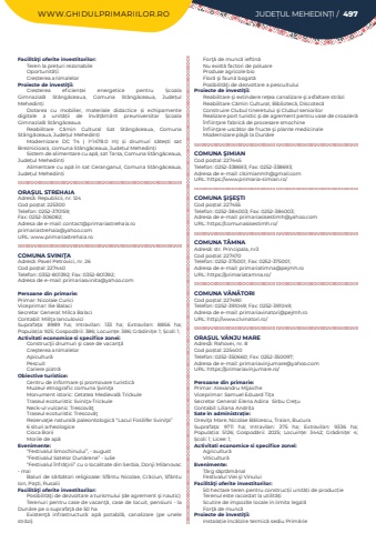 WWW.GHIDULPRIMARIILOR.RO JUDE%u021aUL MEHEDIN%u021aI / 497Facilit%u00e3%u0163i oferite investitorilor:Teren la pre%u021buri rezonabileOportunit%u0103%u021bi:Cre%u0219terea animalelorProiecte de investi%u0163ii:Cre%u0219terea eficien%u021bei energetice pentru %u0218coala Gimnazial%u0103%u00a0 St%u00e2ng%u0103ceaua, Comuna St%u00e2ng%u0103ceaua, Jude%u021bul Mehedin%u021biDotarea cu mobilier, materiale didactice %u0219i echipamente digitale a unit%u0103%u021bii de %u00eenv%u0103%u021b%u0103m%u00e2nt preuniversitar %u0218coala Gimnazial%u0103%u00a0St%u00e2ng%u0103ceauaReabilitare C%u0103min Cultural Sat St%u00e2ng%u0103ceaua, Comuna St%u00e2ng%u0103ceaua, Jude%u021bul Mehedin%u021biModernizare DC 74 ( l=1478.0 m) %u0219i drumuri s%u0103te%u0219ti sat Breznicioara, comuna St%u00e2ng%u0103ceaua, Jude%u021bul Mehedin%u021biSistem de alimentare cu ap%u0103, sat Tarsa, Comuna St%u00e2ng%u0103ceaua, Jude%u021bul Mehedin%u021biAlimentare cu ap%u0103%u00a0%u00een sat Ceranganul, Comuna St%u00e2ng%u0103ceaua, Jude%u021bul Mehedin%u021biORA%u0218UL STREHAIAAdres%u0103: Republicii, nr. 124Cod po%u0219tal: 225300Telefon: 0252-370159; Fax: 0252-306082; Adresa de e-mail: contact@primariastrehaia.roprimariastrehaia@yahoo.comURL: www.primariastrehaia.roCOMUNA SVINI%u0162AAdres%u0103: Pavel Petrovici, nr. 26Cod po%u0219tal: 227440Telefon: 0352-801392; Fax: 0352-801392; Adresa de e-mail: primariasvinita@yahoo.comPersoane din primarie:Primar: Nicolaie%u00a0Curici%u00a0Viceprimar:%u00a0Ilie%u00a0BalaciSecretar General:%u00a0Milca%u00a0Balaci%u00a0Contabil: Mili%u0163a%u00a0IanculoviciSuprafa%u021ba:%u00a0 8989 ha; Intravilan:%u00a0 133 ha; Extravilan:%u00a0 8856 ha; Popula%u021bia:%u00a0925; Gospod%u0103rii:%u00a0386; Locuin%u021be:%u00a0386; Gr%u0103dini%u021be:%u00a01; %u0218coli:%u00a01; Activitati economice si specifice zonei:Construc%u0163ii drumuri %u015fi case de vacan%u0163%u0103Cre%u015fterea animalelorApicultur%u0103PescuitCariere piatr%u0103 Obiective turistice:Centru de informare %u015fi promovare turistic%u0103Muzeul etnografic comuna %u015evini%u0163aMonument istoric: Cetatea Medieval%u0103 TrickuleTraseul ecoturistic Svini%u0163a-TrickuleNeck-ul vulcanic Trescov%u0103%u0163Traseul ecoturistic Trescov%u0103%u0163Rezerva%u0163ie natural%u0103 paleontologic%u0103 %u201cLacul Fosilifer Svini%u0163a%u201d%u00a06 situri arheologiceCioca BoriiMorile de ap%u0103Evenimente:%u201cFestivalul Smochinului%u201d, - august%u201cFestivalul Satelor Dun%u0103rene%u201d - iulie%u201cFestivalul %u00cenfr%u0103%u0163irii%u201d cu o localitate din Serbia, Donji Milanovac - maiBaluri de s%u0103rb%u0103tori religioase: Sf%u00e2ntu Nicolae, Cr%u0103ciun, Sf%u00e2ntu Ion, Pa%u015fti, RusaliiFacilit%u00e3%u0163i oferite investitorilor:Posibilit%u0103%u0163i de dezvoltare a turismului (de agrement %u015fi nautic)Terenuri pentru case de vacan%u0163%u0103, case de locuit, pensiuni - la Dun%u0103re pe o suprafa%u0163%u0103 de 50 ha%u00a0Existen%u0163%u0103 infrastructur%u0103: ap%u0103 potabil%u0103, canalizare (pe unele str%u0103zi)For%u0163%u0103 de munc%u0103 ieftin%u0103Nu exist%u0103 factori de poluareProduse agricole bioFlor%u0103 %u015fi faun%u0103 bogat%u0103Posibilit%u0103%u0163i de dezvoltare a pescuituluiProiecte de investi%u0163ii:Reabilitare %u015fi extindere re%u0163ea canalizare %u015fi asfaltare str%u0103zi%u00a0Reabilitare C%u0103min Cultural, Bibliotec%u0103, Discotec%u0103Construire Clubul tineretului %u015fi Clubul seniorilorRealizare port turistic %u015fi de agrement pentru vase de croazier%u0103%u00cenfiin%u0163are fabric%u0103 de procesare smochine%u00cenfiin%u0163are usc%u0103tor de fructe %u015fi plante medicinaleModernizare plaj%u0103 la Dun%u0103reCOMUNA %u015eIMIANCod po%u0219tal: 227445Telefon: 0252-338693; Fax: 0252-338693; Adresa de e-mail: clsimianmh@gmail.comURL: https://www.primaria-simian.ro/COMUNA %u015eI%u015eE%u015eTICod po%u0219tal: 227455Telefon: 0252-384003; Fax: 0252-384003; Adresa de e-mail: primariasisestimh@yahoo.comURL: https://comunasisestimh.ro/COMUNA T%u00c2MNAAdres%u0103: str. Principala, nr3Cod po%u0219tal: 227470Telefon: 0252-375001; Fax: 0252-375001; Adresa de e-mail: primariatimna@pejmh.roURL: https://primariatamna.ro/COMUNA V%u00c2N%u0102TORICod po%u0219tal: 227490Telefon: 0252-391049; Fax: 0252-391049; Adresa de e-mail: primariavinatori@pejmh.roURL: http://www.clvinatori.ro/ORA%u0218UL V%u00c2NJU MAREAdres%u0103: Rahovei, nr. 8Cod po%u0219tal: 225400Telefon: 0252-350660; Fax: 0252-350097; Adresa de e-mail: primariavinjumare@yahoo.comURL: https://primariavinjumare.ro/Persoane din primarie:Primar: Alexandru%u00a0Mijaiche%u00a0Viceprimar: Samuel Eduard%u00a0Ti%u021baSecretar General: Elena Adina%u00a0%u00a0S%u00eerbu%u00a0Cre%u0163uContabil: Liliana%u00a0Andri%u021baSate %u00een administra%u021bie:Orevi%u0163a Mare, Nicolae B%u0103lcescu, Traian, BucuraSuprafa%u021ba:%u00a0 9711 ha; Intravilan:%u00a0 375 ha; Extravilan:%u00a0 9336 ha; Popula%u021bia:%u00a0 5126; Gospod%u0103rii:%u00a0 2025; Locuin%u021be:%u00a0 3442; Gr%u0103dini%u021be:%u00a0 4; %u0218coli:%u00a01; Licee:%u00a01; Activitati economice si specifice zonei:Agricultur%u0103Viticultur%u0103Evenimente:T%u00e2rg s%u0103pt%u0103m%u00e2nalFestivalul Viei %u015fi VinuluiFacilit%u00e3%u0163i oferite investitorilor:50 hectare teren pentru construc%u021bii unit%u0103%u021bi de produc%u021bieTerenul este racordat la utilit%u0103%u021biScutire de impozite locale %u00een limita legal%u0103For%u0163%u0103 de munc%u0103Proiecte de investi%u0163ii:Instala%u021bie %u00eenc%u0103lzire termic%u0103 sediu Prim%u0103rie