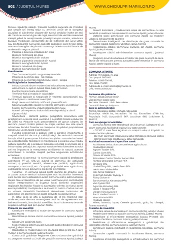 502 / JUDE%u021aUL MURE%u0218 WWW.GHIDULPRIMARIILOR.ROfostele re%u015fedin%u0163e s%u0103se%u015fti. Traseele turistice sugerate de Prim%u0103rie pot umple un %u00eentreg sejur cu amintiri unice de la dang%u0103tul asurzitor al b%u0103tr%u00e2nelor clopote din turnul cet%u0103%u0163ilor %u00eenalte de zeci de metri sau sunetul grav de org%u0103, amintind de vechile ceremonii s%u0103se%u015fti, p%u00e2n%u0103 la ame%u0163itoarele priveli%u015fti asupra satelor, adev%u0103rate burguri medievale, consumate de pe %u00een%u0103l%u0163imile din jurul vetrei sau din foi%u015foarele turnurilor, s%u0103geata c%u0103prioarei care %u00ee%u0163i taie calea, trosnetul crengilor de pin sub cutezan%u0163a labelor ursului izvor%u00e2t de undeva din negura p%u0103durii.Parohia %u015fi biserica ortodox%u0103 din DaiaBiserica fortificat%u0103 din DaiaBiserica evanghelic%u0103 din VulcanBiserica %u015fi parohia ortodox%u0103 din ApoldBiserica evanghelic%u0103 din ApoldBiserica ortodox%u0103 din %u015eae%u015fBiserica evanghelic%u0103 din %u015eae%u015fEvenimente:Ziua Comunei Apold - august-septembrie%u00cent%u00e2lnirea cu etnicii sa%u0219i - Germania%u00cent%u00e2lnirea cu membri Comitetului Diest - BelgiaFacilit%u00e3%u0163i oferite investitorilor:Infrastructur%u0103: drum modernizat %u00een localitatea Apold %u0219i %u0218ae%u0219Alimentare cu ap%u0103 %u00een Apold, Daia, %u0218ae%u0219 %u0219i VulcanElectricitate %u00een toate localit%u0103%u0163ileTelefonie fix%u0103 %u0219i mobil%u0103 %u00een localit%u0103%u0163ileTerenuri agricole %u015fi neagricole %u00een vederea concesion%u0103rii sau %u00eenchirierii pentru realizarea investi%u0163ieiFor%u0163%u0103 de munc%u0103 ieftin%u0103, calificat%u0103 %u015fi necalificat%u0103Sprijinul autorit%u0103%u0163ii locale %u00een vederea demar%u0103rii investitiilorMaterii prime pentru industrializarea lemnuluiMaterii prime pentru industrializarea laptelui %u015fi a c%u0103rniiOportunit%u0103%u021bi:Silvicultur%u0103 - datorit%u0103 pozi%u021biei geografice silvicultura este practicat%u0103 %u00een aceast%u0103 zon%u0103, exist%u00e2nd o suprafa%u0163%u0103 total%u0103 a p%u0103durilor de 3686 ha. P%u0103durile sunt preponderant de gorun carpen, iar restr%u00e2ns putem %u00eent%u00e2lni p%u0103duri de stejar, salc%u00e2m sau alte specii arboricole. Fondul forestier se compune din p%u0103duri proprietatea Consiliului Local Apold %u0219i particulare.Func%u0163ia economic%u0103 a p%u0103durii este o p%u00e2rghie important%u0103 a cre%u015fterii nivelului de trai %u015fi calit%u0103%u0163ii vie%u0163ii. Pe teritoriul comunei func%u0163ia silvic%u0103 presupune folosirea insu%u015firilor naturale intrinseci ale ecosistemelor forestiere %u00een men%u0163inerea %u015fi crearea unui mediu natural specific, de a produce biomasa vegetal%u0103 %u015fi animal%u0103, de a %u00eenfrumuse%u0163a peisajul, etc. Aportul ecosistemelor forestiere au rolul cel ma important la men%u0163inerea echilibrelor %u00een natur%u0103, acestea constituind o condi%u0163ie major%u0103 pentru asigurarea echilibrului economic.Industria %u0219i comer%u0163ul - la nivelul comunei Apold %u00ee%u0219i desfasoara activitatea PF-uri, SRL-uri av%u00e2nd ca domeniu de activitate comer%u021b%u00a0 %u015fi prest%u0103ri servicii, alimenta%u021bie public%u0103, agricultur%u0103, transport, construc%u021bii, etc. Ocupa%u021bia popula%u021biei este agricultura, exploat%u0103rile silvice precum %u015fi cre%u015fterea animalelor.Turismul - %u00een comuna Apold exist%u0103 puncte de atrac%u021bie, care ar putea aduce venituri substan%u021biale at%u00e2t locuitorilor interesa%u021bi care doresc s%u0103%u00a0investeasc%u0103%u00a0%u00een acest domeniu c%u00e2t %u0219i administra%u021biei locale care ar beneficia de pe urma turismului prin contribu%u021biile noilor intreprinz%u0103tori la bugetul local. Datorit%u0103 organiz%u0103rii regionale, facilit%u0103%u021bilor fiscale %u0219i avantajelor oferite, la nivelul zonei exist%u0103 posibilit%u0103%u021bi multiple de a se investi %u00een turism. Cadrul natural cu valoare deosebit%u0103%u00a0 favorizeaz%u0103%u00a0 dezvoltarea turismului de agrement. De asemenea se poate dezvolta %u015fi agroturismul.%u00cen satul %u0218ae%u0219 se afl%u0103 o suprafa%u021b%u0103 de 12 Ha mla%u0219tin%u0103 (lac) unde se poate demara amenajarea unui lac de agreement sau balneoclimateric, %u00een subsolul zonei fiind lacuri subterane, de unde se poate extrage ap%u0103%u00a0prin pu%u021buri forate.Proiecte de investi%u0163ii:Canalizare menajer%u0103 %u0219i sta%u021bie de epurare %u00een comuna Apold, jude%u021bul Mure%u0219Reabilitare %u0219i dotare c%u0103min cultural %u00een comuna Apold, jude%u021bul Mure%u0219Construire gr%u0103dini%u021b%u0103 Sae%u0219Modernizarea sistemului de iluminat public stradal %u00een comuna Aplod, jude%u021bul Mure%u0219Reabilitare %u0219i modernizare DC 56 Apold-Daia %u0219i DC 56 A spre Vulcan %u0219i comuna Apold, jude%u021bul Mure%u0219Construc%u021bii gr%u0103dini%u021be Regiunea Centru-Construire gr%u0103dini%u021b%u0103 cu program normal cu 2 s%u0103li de grup%u0103 %u00een comuna Apold, jude%u021bul Mure%u0219Proiect Extindere , modernizare re%u021bea de alimentare cu ap%u0103 potabil%u0103 %u0219i realizare bran%u0219ament %u00een comuna Apold, jude%u021bul Mure%u0219Dotarea %u0219colii gimnaziale din comuna Apold cu mobilier urban %u0219i echipamente sportiveDezvoltarea inteligent%u0103 de distribu%u021bie de gaze naturale %u00een comunele Apold, Saschiz %u0219i V%u0103natori, satul ArchitaReabilitarea cl%u0103dirii C%u0103minului Cultural, sat Apold, comuna Apold, jude%u021bul Mure%u0219Anvelopare cl%u0103diri administrative comuna Apold , jude%u021bul Mure%u0219Program privind reducerea emisiilor de gaze cu efect de ser%u0103Sta%u021bie de re%u00eencarcare pentru autovehiculele electrice %u00een comuna Apold, satele Apold %u0219i Sae%u0219COMUNA A%u0162INTI%u015eAdres%u0103: Principal%u0103, nr. 242Cod po%u0219tal: 547045Telefon: 0265-7141