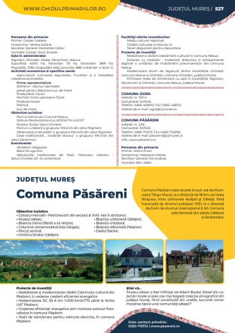 WWW.GHIDULPRIMARIILOR.RO JUDE%u021aUL MURE%u0218 / 527Persoane din primarie:Primar: Csiszer IzabelaViceprimar: Veress SzilardSecretar General: Keresztes G%u00e1borContabil: Csisz%u00e9r Ilona-EmeseSate %u00een administra%u021bie:Rigmani, Ghine%u015fti, V%u0103da%u015f, S%u00e2nsimion, NeauaSuprafa%u021ba:%u00a0 4004 ha; Intravilan:%u00a0 113 ha; Extravilan:%u00a0 3891 ha; Popula%u021bia:%u00a01336; Gospod%u0103rii:%u00a0665; Locuin%u021be:%u00a0688; Gr%u0103dini%u021be:%u00a04; %u0218coli:%u00a04; Activitati economice si specifice zonei:Agricultur%u0103: cultivarea legumelor, fructelor %u0219i a cerealelor cre%u0219terea animalelorFirme reprezentative:distileria - b%u0103uturi spirtoasepres%u0103%u00a0pentru fabricare suc de mereProduc%u0103tori locali:Fermieri tineri, persoane fiziceProduse localePalinc%u0103 Suc de mereObiective turistice:ParcuI C%u0103minului Cutural NeauaStatuia Revolu%u021bionarutui,,KOSSUTH LAJOS%u201dMuzeuI %u0218colar SatuI Ghine%u0219tiParcul cu tabar%u0103%u00a0a grupului MILVUS din satul RigmaniObservatorul de p%u0103s%u0103ri a gruputui MILVUS din satul RigmaniCasa tradi%u021bional%u0103%u00a0 ,, tradi%u021biile satutui%u201d a gruputui MlLVUS din satuI S%u00e2nsimionEvenimente:S%u0103rb%u0103tori religioaseBaluI struguritorObiceiurile tradi%u021bionale de Pa%u0219ti Festivalul m%u0103relui - Satul%u00a0Ghine%u0219ti 23- 24 octombrieFacilit%u00e3%u0163i oferite investitorilor:Mediu natural nepoluatTradi%u021bii culturale %u0219i istorice vii Teren disponibil pentru dezvoltareProiecte de investi%u0163ii:Reabilitare %u0219i dotare a%u0219ez%u0103m%u00e2nt cultural %u00een comuna NeauaDotarea cu mobilier , materiale didactice %u0219i echipamente digitale a unit%u0103%u021bilor de %u00eenv%u0103%u021b%u0103m%u00e2nt preuniversitar din comuna NeauaModernizare drum de legatur%u0103 dintre localit%u0103%u021bile Ghine%u0219ti comuna Neaua %u0219i Ghindari, comuna Ghindari, jude%u021bul Mure%u0219%u00cenfiin%u021bare re%u021bea de alimentare cu ap%u0103%u00a0%u00een localit%u0103%u021bile Rigmani, S%u00e2nsimion %u0219i Ghinesti, comuna Neaua, jude%u021bul%u00a0Mure%u0219COMUNA OGRAAdres%u0103: nr. 103 ACod po%u0219tal: 547440Telefon: 0265-458212; Fax: 0265-458112; Adresa de e-mail: ogra@cjmures.roCOMUNA P%u0102S%u0102RENIAdres%u0103: nr. 209Cod po%u0219tal: 547455Telefon: 0265-710112; Fax: 0265-710290; Adresa de e-mail: pasareni@cjmures.roURL: www.pasareni.roPersoane din primarie:Primar: Sz%u0151cs AntalViceprimar: M%u00e9sz%u00e1ros M%u00f3zesSecretar General: Kis%u00a0AndreaContabil: Bari J%u00f3l%u00e1n