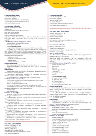 544 / JUDE%u021aUL MURE%u0218 WWW.GHIDULPRIMARIILOR.ROCOMUNA VII%u015eOARAAdres%u0103: Principal%u0103, nr. 111; Cod po%u0219tal: 547645Telefon: 0265-712212; Fax: 0265-712212; Adresa de e-mail: viisoara@cjmures.roURL: www.viisoarams.roPersoane din primarie:Primar: Pavel Claudiu PetriViceprimar:%u00a0Secretar General: One%u021b%u00a0Maria CosminaContabil: Petri DanielaSate %u00een administra%u021bie:Vii%u015foara, S%u00e2ntioana, Ormeni%u015fSuprafa%u021ba:%u00a0 6682 ha; Intravilan:%u00a0 226 ha; Extravilan:%u00a0 6416 ha; Popula%u021bia:%u00a0 1586; Gospod%u0103rii:%u00a0 575; Locuin%u021be:%u00a0 629; Gr%u0103dini%u021be:%u00a0 3; %u0218coli:%u00a03; Activitati economice si specifice zonei:Agricultur%u0103 %u0219i cre%u0219terea animalelorComer%u021b cu am%u0103nuntulFirme reprezentative:%u00cen agricultur%u0103 %u0219i cre%u0219terea animalelor: S.C. Ceragrim SRL%u00cen comer%u021b: SC CONSTRAL COM SRL VII%u0218OARA,SC PAN MITEA SRL VII%u0218OARA,SC GHERIMPEX SRL VII%u0218OARA,SC LUCAS TRANS VII%u0218OARA SRL VII%u0218OARA,SC ANIRI SM EXPERT SRL S%u00c2NTIOANA,SC MAIER PAN SRL ORMENI%u0218,SC PATRIK WIP SRL ORMENI%u0218,II STAN MARIA GABRIELA ORMENI%u0218Produc%u0103tori locali:FERMIERI (33 PRODUC%u0102TORI)Produse locale: LAPTE %u0218I PRODUSE LACTATEObiective turistice:Biserica evanghelic%u0103 din Ormeni%u015f secolul al-XV- leaBiserica Evanghelic%u0103 ridicat%u0103 %u00een sec. XVI - XVII cu turnul din anul 1786Evenimente:Ziua jandarmeriei (eveniment s%u0103rb%u0103torit la data de 3 aprilie)-monumentul eroilor jandarmiZiua eroilor (eveniment s%u0103rb%u0103torit la %u00cen%u0103l%u0163area Domnului %u201cIspas%u201d) - 25 mai- monumentul eroilor%u00cent%u00e2lnirea Hundorf- zilele comunei- c%u0103minul culturalFacilit%u00e3%u0163i oferite investitorilor:Dezvoltarea infrastructurii, dezvoltarea serviciilor socialeServicii de salubrizareServicii medicale %u0219i de educa%u021bieAtragerea de fonduri europene %u00een folosul comunit%u0103%u021biiExtinderea %u0219i %u00eenfiin%u021barea de noi IMM-uri, situa%u021bie care ar conduce la dezvoltarea cadrului economicOportunit%u0103%u021bi Agroturism ruralProiecte de investi%u0163ii:Achizi%u021bie dot%u0103ri %u00een cadrul investi%u021biei reabilitare %u0219i extindere %u0219coala gimnazial%u0103%u00a0Vii%u0219oaraModernizare %u0219i renovare c%u0103min cultural sat Vii%u0219oara comuna Vii%u0219oara jude%u021bul MuresModernizare %u0219i renovare c%u0103min cultural sat Ormeni%u0219%u00a0comuna Vii%u0219oara jude%u021bul Mure%u0219Modernizare DC 70 %u00een comuna Vii%u0219oara jude%u021bul Mure%u0219n%u00cenfiin%u021bare re%u021bea canalizare menajer%u0103, %u00een comuna Vii%u0219oara, jude%u021bul Mure%u0219%u00cenfiin%u021bare re%u021bea de distribu%u021bie gaze naturale %u00een comuna Vii%u0219oara, jude%u021bul Mure%u0219Dotarea cu mobilier, materiale didactice %u0219i echipamente digitale a %u0219colii gimnaziale Vii%u0219oaraReabilitare %u0219i eficientizare energetic%u0103 a %u0219colii generale din satul S%u00e2ntioana comuna Vii%u0219oara jude%u021bul Mure%u0219Reabilitare %u0219i eficientizare energetic%u0103%u00a0 sediu administrativ Vii%u0219oara comuna Vii%u0219oara jude%u021bul Mure%u0219COMUNA VOIVODENIAdres%u0103: Principal%u0103, nr. 160;Cod po%u0219tal: 547650Telefon: 0265-341112; Fax: 0265-341140,0265- 341112; Adresa de e-mail: voivodeni@cjmures.roURL: www.voivodeni.roCOMUNA ZAG%u0102RAdres%u0103: Principal%u0103, nr. 266; Cod po%u0219tal: 547655Telefon: 0265-712412; Fax: 0265-712412; Adresa de e-mail: zagar@cjmures.roURL: www.primariazagar.roCOMUNA ZAU DE C%u00c2MPIEAdres%u0103: Republicii, nr. 18; Cod po%u0219tal: 547660Telefon: 0265-486112; Fax: 0265-486113; Adresa de e-mail: zaucimpie@cjmures.roURL: zaudecimpie.roPersoane din primarie:Primar: Alexandru IurianViceprimar: Vasile GreuSecretar General: Oana Ancu%u0163a SimioncaContabil: Anica GogaSate %u00een administra%u021bie:Zau de C%u00e2mpie, B%u0103rbo%u015fi, Ciretea, Malea, T%u0103u, Bujor-Hodaie, %u015etef%u0103neaca, Gaura S%u00e2ngeruluiSuprafa%u021ba:%u00a0 5015 ha; Intravilan:%u00a0 437 ha; Extravilan:%u00a0 4578 ha; Popula%u021bia:%u00a0 3157; Gospod%u0103rii:%u00a0 1067; Locuin%u021be:%u00a0 1203; Gr%u0103dini%u021be:%u00a0 3; %u0218coli:%u00a05; Activitati economice si specifice zonei:Cre%u015fterea animalelorAgricultur%u0103Comer%u021bExtrac%u021bie gaz metanPiscicultur%u0103Transport m%u0103rfuriServiciiFirme reprezentative:SC Agrom Zau Prod SRLSC Saf%u00a0Com%u00a0SRLSC TransanicarmSC VasmelhydraulicSC Eurogrup CIM Logistic SRL Obiective turistice:Rezerva%u0163ia de bujori de step%u0103 este considerat%u0103 de cunosc%u0103tori drept %u201cunicul loc din interiorul arcului carpatic unde cre%u015fte aceast%u0103 plant%u0103%u201dLocul, Zau de C%u00e2mpie, pe %u015foseaua dintre Ludu%u015f %u015fi S%u0103rma%u015f, %u00een jude%u0163ul Mure%u015f, merit%u0103 vizitat%u00a0la sf%u00e2r%u015fitul%u00a0lunii aprilie %u00eenceputul lunii mai, c%u00e2nd %u00eenfloresc bujoriiLacurile din zon%u0103Evenimente:T%u00e2rgul Bujorului - se organizeaz%u0103 anual de 1-2 maiT%u00e2rgul Pe%u015ftelui %u015fi Festivalul de Jocuri Populare %u201c Pe%u015fti%u015forul de Argint %u201c - se organizeaz%u0103 %u00een cursul lunii%u00a0augustFacilit%u00e3%u0163i oferite investitorilor:Asigurarea utilit%u0103%u0163ilor ap%u0103 %u015fi canalSprijin din partea autorit%u0103%u0163ilor locale pentru ob%u0163inerea de avize %u015fi autoriza%u0163iiFor%u0163a de munc%u0103 calificat%u0103Infrastructur%u0103-rutier%u0103 %u015fi c%u0103i ferateProiecte de investi%u0163ii:Modernizare %u0219coli%u00centocmirea planului parcelar a terenurilorConstruire gr%u0103dini%u021b%u0103 cu program normalConstruire sal%u0103 de sportAsfaltare str%u0103ziConstruire locuin%u021be socialeExtindere re%u021bea apa-canalReactualizare PUGConstruire capel%u0103 B%u0103rbo%u0219iReabilitare termic%u0103 blocuri