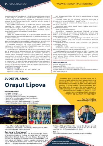 54 / JUDE%u021aUL ARAD WWW.GHIDULPRIMARIILOR.RO%u015fi socio-economic, conducerea Prim%u0103riei ora%u015fului Lipova, dore%u015fte s%u0103 intervin%u0103 %u015fi %u00een urm%u0103torii ani, %u00een dezvoltarea localit%u0103%u0163ii Lipova %u00een cele mai importante domenii ale sale, %u00een promovarea imaginii ora%u015fului %u015fi valorificarea superioar%u0103 a resurselor pe care ora%u015ful %u015fi %u00eemprejurimile le ofer%u0103Principalele oportunit%u0103%u0163i %u015fi obiective vizeaz%u0103 dezvoltarea mediului de afaceri, a turismului local %u015fi regional prin %u00eembun%u0103t%u0103%u0163irea imaginii turistice, dezvoltarea economico-social%u0103 local%u0103 %u015fi implicit promovarea zonei de Vest a Rom%u00e2niei pentru poten%u0163ialii investitori din %u0163ar%u0103 %u015fi din str%u0103in%u0103tateFACILIT%u0102%u021aI%u00a0:Teren din domeniul privat al ora%u015fului Lipova spre v%u00e2nzare ori concesionare, cu utilit%u0103%u0163ile aferente, %u00een vederea construirii de obiective economice.Pornind de la acest obiectiv general, se are %u00een vedere ob%u021binerea unor rezultate pozitive, avantajoase %u00een c%u00e2teva dintre ramurile cele mai importante, rezultate care se refer%u0103 la aspecte precum:-%u00a0 cre%u0219terea num%u0103rului de turi%u0219ti care viziteaz%u0103 localitatea/regiunea, ca urmare a %u00eembun%u0103t%u0103%u021birii vizibilit%u0103%u021bii regiunii, a calit%u0103%u021bii %u0219i diversit%u0103%u021bii serviciilor/produselor oferite -%u00a0%u00eembun%u0103t%u0103%u021birea mediului de afaceri prin noile investi%u021bii, care pot s%u0103 apar%u021bin%u0103 unor diverse domenii de activitate, va contribui direct la multiplicarea %u0219i diversificarea serviciilor (directe %u0219i conexe) oferite acestora %u00een regiune (agen%u021bii de turism, pensiuni agroturistice, construc%u021bii, transport, cazare, alimenta%u021bie public%u0103, comer%u021b, servicii bancare, ghidaj la obiective, traducere %u0219i interpretare, v%u00e2nzare de bunuri de larg consum, artizanat, bilete la muzee, etc.) cu efect imediat asupra %u00eenfiin%u021b%u0103rii de noi agen%u021bi economici, de noi locuri de munc%u0103 de sporire a veniturilor celor angaja%u021bi %u00een sectoarele conexe %u0219i astfel de cre%u0219tere, pe ansamblu, a calit%u0103%u021bii vie%u021bii locuitorilor din zon%u0103.Proiecte de investi%u0163ii:INVESTI%u021aII FINAN%u021aATE %u0218I %u00ceN CURS DE EXECU%u021aIEINVESTI%u021aII PRIN CNI-SASal%u0103 de sport cu tribun%u0103 180 locuri %u00een ora%u015ful Lipova, str. Iancu Jianu nr. 25 HExtindere re%u021bea de ap%u0103 potabil%u0103, canalizare menajer%u0103 %u0219i bran%u0219amente pe str. CLUJULUI %u2013 faza SF+DTACExtindere re%u021bea de canalizare %u00een Ora%u0219ul Lipova, str. Valea Mare, jud. Arad %u2013 SF+DTACConstruire cre%u0219%u0103 mic%u0103, ora%u0219ul Lipova, jude%u021bul Arad POR %u2013 FONDURI EUROPENEPOR %u2013 FONDURI EUROPENE Consolidare, restaurare conservare biseric%u0103, amenajare incint%u0103, restaurare %u0219i consolidare %u00eemprejmuire, realizare corp anex%u0103 C2 si lum%u00e2n%u0103rar C3, iluminat arhitectural ansamblu la biserica%u201dAdormirea Maicii Domnului%u201dReutilizarea spa%u021biului fostei pie%u021be agroalimentare din Lipova prin amenajarea de spa%u021bii verzi publice %u0219i reabilitarea str%u0103zii de acces Miron CostinReabilitare cl%u0103dire existent%u0103 pentru realizarea unei gr%u0103dini%u021be cu program normal.INVESTI%u021aII %u2013 PNDLReabilitare %u0219i dotare cl%u0103dire de %u00eenv%u0103%u021b%u0103m%u00e2nt %u2013 %u0218coala General%u0103 Radna %u2013 cls %u2013I-VIII Pod metalic peste r%u00e2ul Mure%u0219 Reabilitarea infrastructurii rutiere pe str. Gen .Petrescu, Cuza Voda, V. Alecsandri, 1 Decembrie, Me%u021bianu, Mihai Viteazul, Viilor, Mure%u0219, M. Eminescu, Sarmisegetuza, Inv. I. Tuducescu, Timi%u0219orii, Aurel V%u00e2n%u0103tu, Elena Chiri%u021ba, Zorilor, Clujului, P-%u021ba Decebal, Lugojului %u0219i Ef. MurguCOMUNA MACEAAdres%u0103: Principal%u0103, nr. 262; Cod po%u0219tal: 317210Telefon: 0257-536045, 536101; Fax: 0257-536045; Adresa de e-mail: primaria.macea@gmail.com,primaria@macea.roURL: www.macea.ro