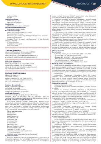 WWW.GHIDULPRIMARIILOR.RO JUDE%u021aUL OLT / 561Cultura orzuluiMor%u0103rit%u00a0Obiective turistice:Serbarea bujoruluiP%u0103durea C%u0103lug%u0103reasc%u0103Evenimente:Zilele comunei a doua zi de pa%u0219tiFacilit%u00e3%u0163i oferite investitorilor:Scutire de impozite localeProiecte de investi%u0163ii:Finalizare proiect alimentare cu ap%u0103Teren de sport - %u00een lucruReabilitare, modernizare %u0219i dotare %u0219coala D%u0103neasa - finalizatModernizare drumuriRealizare Teren de sport multifunc%u021bional%u00a0 %u00een sat Berindei comuna D%u0103neasaProiecte de viitor:SF alimentare cu gazeIluminat stradalCOMUNA DEVESELUAdres%u0103: Aurel Vlaicu, nr. 6; Cod po%u0219tal: 237130Telefon: 0249-510560; Fax: 0249-510580; Adresa de e-mail: primariadeveselu@yahoo.comURL: http://www.primariadeveselu.judetulolt.ro/COMUNA DOBRE%u0162UAdres%u0103: Principal%u0103, nr. 56; Cod po%u0219tal: 237135Telefon: 0249-456052; Fax: 0371-609024; Adresa de e-mail: primariadobretu@yahoo.comURL: www.primariadobretu.roCOMUNA DOBROSLOVENIAdres%u0103: Al.I. Cuza, nr. 1Cod po%u0219tal: 237140Telefon: 0249-530022; Fax: 0249-530210; Adresa de e-mail: primar@dobrosloveni.roURL: www.dobrosloveni.roPersoane din primarie:Primar:%u00a0Gheorghe Tudora%u015fcu%u00a0Viceprimar: Ion BadeaSecretar General: %u00a0Ionel CioroianuContabil:%u00a0Nicoleta Alina Dumitrescu%u00a0Sate %u00een administra%u021bie:Dobrosloveni, Re%u015fca, Re%u015fcu%u0163a, Potopin, Fr%u0103sinetuSuprafa%u021ba:%u00a0 5675 ha; Intravilan:%u00a0 508 ha; Extravilan:%u00a0 5167 ha; Popula%u021bia:%u00a03987; Gospod%u0103rii:%u00a01263; Locuin%u021be:%u00a01302; Gr%u0103dini%u021be:%u00a02; %u0218coli:%u00a02; Activitati economice si specifice zonei:Agricultur%u0103 (cereale, plante oleaginoase, legumicultur%u0103, pomicultur%u0103, viticultur%u0103, c%u0103p%u0219uni), etc., produc%u021bie (mase plastice, peleti, preparate din carne %u0219i mezeluri, furaje animale, miere, pe%u0219te, etc), agroturism, produse de panifica%u021bie, prelucrarea lemnului, comer%u021b, silvicultur%u0103, alimenta%u021bie public%u0103, cazare, lucr%u0103ri civile %u0219i industriale, dezmembr%u0103ri auto, service autoFirme reprezentative:Comfert SRLAgroprod SRLDobrosloveni SARoyal Famili SRLTeldotrans SRLStanitcom SRLMinplast SRLSatinecom SRLDancor Prodaliment SRLPopasul %u0218arpelui SRLDimulescu Costel II, 2T SRLAnsamblul Folcloric %u201eRomula Malva%u201d%u201eFlori de Romana%u021bi%u201dAsocia%u021bia social cultural%u0103 %u201eFlori de Romana%u021bi%u201dObiective turistice:Rom%u00e2nia beneficiaz%u0103 de o mul%u021bime de atrac%u021bii turistice, printre acestea se reg%u0103se%u0219te situl arheologic din comuna Dobrosloveni. Unele dintre punctele turistice specifice comunei %u00een constituie ora%u0219ul roman %u201eRomuna Malva%u201d acolo unde s-au descoperit importante urme ale existen%u021bei str%u0103mo%u0219e%u0219ti.Zona este protejat%u0103 de posibila degradare a picturii murale descoperit%u0103 pe pere%u021bii fostelor locuin%u021be romane. Au fost descoperite numeroase izvoare istorice printre care se num%u0103r%u0103: statuete din bronz, ulcele cu monede, %u0219i multe obiecte ceramice.%u00cen anul 2015, au fost c%u00e2teva descoperiri spectaculoase, o cl%u0103dire cu hiptocaust, o pictur%u0103 mural%u0103 de peste 2000 de ani, care a fost ridicat%u0103 de Ministerul Culturii pentru a fi protejat%u0103 %u00eempotriva intemperiilor.Cabana turistica BULVANU, cabana de la Re%u0219ca a fost ridicat%u0103 special pentru fostul dictator, care venea aici %u00een sezoanele de v%u00e2n%u0103toare %u015fi r%u0103m%u00e2nea peste noapte. Venea %u00eenso%u0163it de Elena Ceau%u015fescu %u00eens%u0103 dormeau %u00een camere separate.Cabana are 12 camere, dintre care dou%u0103 dintre dormitoare au apar%u0163inut so%u0163ilor Nicolae %u015fi Elena Ceau%u015fescu. Balt%u0103 pentru pescuit - Frasinet 1 situata la iesirea din orasul Caracal la aproximativ 5 Km pe soseaua nationala ce duce la Slatina. Se poate ajunge cu masina. Drum foarte bun. P%u00e2n%u0103%u00a0 la intrarea %u00een Dobrosloveni se vireaz%u0103%u00a0 la st%u00e2nga sau dac%u0103 se vine dinspre Slatina dup%u0103 comuna%u00a0Dobrosloveni se viraz%u0103 la dreapta. Exist%u0103 indicatoareEvenimente:Festivaluri locale %u201ePlai de Romana%u021bi%u201d - 20,21 iunie 2020%u201eRomvla Fest%u201d - 4, 5, 6, septembrie 2020%u201eZiua por%u021bilor deschise%u201d%u00a0 - 4, 5, 6, septembrie 2020%u201ePescuit sportiv festival%u201d septembrie 2020%u201eD%u0103ruind vei Dob%u00e2ndi%u201d - 5 decembrie 2020%u201eBinecuv%u00e2ntare de Cr%u0103ciun%u201d - 19 decembrie 2020Facilit%u00e3%u0163i oferite investitorilor:Zona prezint%u0103 poten%u021bial turistic ridicat, infrastructur%u0103 rutier%u0103 pus%u0103 la punct, ap%u0103%u00a0%u0219i canalizare, infrastructur%u0103 feroviar%u0103, terenuri agricole, p%u0103duri, infrastructur%u0103 educa%u021bional%u0103 %u0219i cultural%u0103, for%u021b%u0103 de munc%u0103 disponibil%u0103, terenuri pentru %u00eenchiriere/concesiune, sprijin necondi%u021bionat, din partea autorit%u0103%u021bilor locale pentru investitori etcOportunit%u0103%u021bi:Agroturism, Piscicultur%u0103, Agricultur%u0103, for%u021b%u0103 de munc%u0103 calificat%u0103, teren construire fabric%u0103 de p%u00e2ine %u0219i produse de panifica%u021bie la DN 64, terenuri pentru diverse afaceri (produc%u021bie, prelucrare, industrie, cre%u0219tere animale) %u00een incinta fostului CAP, %u0219i altele despre care suntem deschi%u0219i la discu%u021biiProiecte de investi%u0163ii:Proiecte %u00een implementare:Extindere, reabilitare %u0219i dotare %u0218coala Resca - proiect finan%u021bat prin PORDotare cu mobilier, materiale didactice %u0219i echipamente digitale a uni%u0103%u021btilor de %u00eenv%u0103%u021b%u0103m%u00e2nt preuniversitar %u0219i a unit%u0103%u021bilor conexe - proiect finan%u021bat prin PNRR, Componenta 15, Investi%u021bia 13Construirea unui centru de zi de asisten%u021b%u0103 %u0219i recuperare