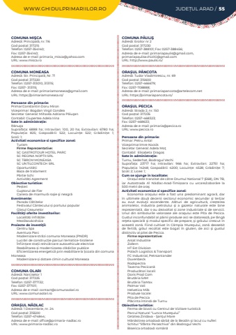 WWW.GHIDULPRIMARIILOR.RO JUDE%u021aUL ARAD / 55COMUNA MI%u015eCAAdres%u0103: Principal%u0103, nr. 116Cod po%u0219tal: 317215Telefon: 0257-354140; Fax: 0257-354140; Adresa de e-mail: primaria_misca@yahoo.comURL: www.misca.roCOMUNA MONEASAAdres%u0103: Str. Principal%u0103, Nr. 71Cod po%u0219tal: 317220Telefon: 0257-313010, 313115; Fax: 0257- 313115; Adresa de e-mail: primariamoneasa@gmail.comURL: https://primariamoneasa.ro/Persoane din primarie:Primar:Constantin Doru MironViceprimar: Bogdan Virgil CondeaSecretar General: Mihaela Adriana P%u0103iu%u015fanContabil: Ciupertea Adela IrinaSate %u00een administra%u021bie:R%u0103nu%u015faSuprafa%u021ba:%u00a0 6888 ha; Intravilan:%u00a0 100, 20 ha; Extravilan:%u00a0 6780 ha; Popula%u021bia:%u00a0 825; Gospod%u0103rii:%u00a0 522; Locuin%u021be:%u00a0 522; Gr%u0103dini%u021be:%u00a0 1; %u0218coli:%u00a01; Activitati economice si specifice zonei:TurismFirme Reprezentative:SC GASTROTOUR HOTEL PARCSC REGINA NOPTII SRLSC TBRCM MONEASASC UNTILCONTECH SRLOportunit%u0103%u021bi:Baza de tratamentP%u00e2rtie Schi Activit%u0103%u021bi AgrementObiective turistice:Pe%u0219teriCuptorul de FierCariera de marmur%u0103 ro%u015fie %u015fi neagr%u0103Evenimente:Parada Cl%u0103titelorFestivalul C%u00e2ntecului %u0219i portului popularGlasul CeaunelorFacilit%u00e3%u0163i oferite investitorilor:Localit%u0103%u021bi %u00eenfr%u0103%u021bite: Mez%u0151kov%u00e1csh%u00e1zaProiecte de investi%u0163ii:Centru SpaAventura ParcModernizare str%u0103zi comuna Moneasa (PNDR)Lucr%u0103ri de construc%u021bie parcuri tematice-tiroliene%u00cenfiin%u021bare sta%u021bii re%u00eenc%u0103rcare autovehicule electriceReabilitarea %u0219i modernizarea cl%u0103dirilor publiceEficientizarea%u00a0energetic%u0103%u00a0prin reabilitare la %u0218coala din comuna MoneasaModernizare %u0219i dotare c%u00eemin cultural MoneasaCOMUNA OLARIAdres%u0103: Narciselor 1Cod po%u0219tal: 317225Telefon: 0257-377132; Fax: 0257-377011; Adresa de e-mail: contact@comunaolari.roURL: www.comunaolari.roORA%u0218UL N%u0102DLACAdres%u0103: 1 Decembrie, nr. 24Cod po%u0219tal: 315500Telefon: 0257-474844; Adresa de e-mail: office@primaria-nadlac.roURL: www.primaria-nadlac.roCOMUNA P%u0102ULI%u015eAdres%u0103: Eroilor nr 2Cod po%u0219tal: 317230Telefon: 0257-388101; Fax: 0257-388456; Adresa de e-mail: primariapaulis@gmail.com, primariapaulisachizitii@gmail.comURL: http://www.paulis.ro/ORA%u0218UL P%u00c2NCOTAAdres%u0103: Tudor Vladimirescu, nr. 69Cod po%u0219tal: 315600Telefon: 0257-466679; Fax: 0257-708888; Adresa de e-mail: primariapancota@artelecom.netURL: https://primariapancota.ro/ORA%u0218UL PECICAAdres%u0103: Strada 2, nr. 150Cod po%u0219tal: 317235Telefon: 0257-468323; Fax: 0257-468633; Adresa de e-mail: primaria@pecica.roURL: www.pecica.roPersoane din primarie:Primar: Petru AntalViceprimar:Imre KocsikSecretar General: Adela Mo%u0163Contabil: %u00a0Elisabeta Drago%u0219Sate %u00een administra%u021bie:Turnu,%u00a0Sederhat, Bodrogul VechiSuprafa%u021ba:%u00a0 23717 ha; Intravilan:%u00a0 966 ha; Extravilan:%u00a0 22751 ha; Popula%u021bia:%u00a0 14248; Gospod%u0103rii:%u00a0 4200; Locuin%u021be:%u00a0 4528; Gr%u0103dini%u021be:%u00a0 7; %u0218coli:%u00a02; Licee:%u00a01; Cum se ajunge in localitate:Ora%u0219ul este tranzitat de c%u0103tre Drumul National 7 (E68), DN 7B, iar Autostrada A1 N%u0103dlac-Arad-Timi%u0219oara cu urcare/cobor%u00e2re la 500 metri de ora%u015fActivitati economice si specifice zonei:Economia ora%u015fului este a fost una predominant agrar%u0103, dar %u00een ultimele dou%u0103 decenii sectorul economic secundar %u015fi ter%u0163iar au avut evolu%u0163ii ascendente. Al%u0103turi de agricultur%u0103, cre%u0219terea animalelor, industria petrolului %u015fi a gazelor naturale este bine reprezentat%u0103, dar s-au dezvoltat %u0219i zone industriale %u0219i de servicii. Unul din simbolurile valoroase ale ora%u015fului este Pita de Pecica. Gustul inconfundabil al p%u00e2inii produse aici se datoreaz%u0103, pe l%u00e2ng%u0103 re%u0163eta special%u0103 %u015fi modul specific de prepare, %u015fi gr%u00e2ului crescut %u00een aceast%u0103 zon%u0103. Fiind cultivat %u00een C%u00e2mpia Mure%u015fului, zon%u0103 deosebit de fertil%u0103, gr%u00e2ul recoltat este bogat %u00een gluten, de aici %u015fi gustul distinctiv al pitei de Pecica.Firme reprezentative:Arsat IndustrieZollernHT Est DivisionPolach Logistics & TransportFC Industrial, PetrsantanderDuvenbeckRodspectra Taverna Pecican%u0103Produc%u0103tori locali:Doris Prod ComBrut%u0103ria SAMBrut%u0103ria TiaMaxPalmar ValiHelvetica MilkProduse locale:Pita de Pecica Pl%u0103cinta %u00eentins%u0103 de TurnuObiective turistice:Ferma de bivoli cu Centrul de Vizitare turistic%u0103Parcul Natural %u201cLunca Mure%u015fului%u201dCetatea Ziridava - %u015ean%u0163ul MareM%u0103n%u0103stirea ortodox%u0103 s%u00e2rb%u0103 de la Bezdin %u015fi lacul cu nuferiSchitul %u201cSf%u00e2nta Paraschiva%u201d din Bodrogul VechiBiserica ortodox%u0103 rom%u00e2n%u0103