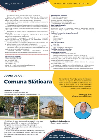 572 / JUDE%u021aUL OLT WWW.GHIDULPRIMARIILOR.ROModernizare str%u0103zi %u00een comuna Studina, jude%u021bul OltDotarea cu mobilier, materiale didactice %u0219i echipamente digitale a %u0219colii gimnaziale cu clasele I-VIII, din comuna Studina, jude%u021bul Olt, %u00een cadrul PNRR- componenta C 15-educa%u021bieConstruire de locuin%u021be sociale,24 unit%u0103%u021bi locative, %u00een comuna Studina, jude%u021bul OltRealizarea lucr%u0103rilor de %u00eenregistrare sistematic%u0103 a imobilelor %u00een sectoarele cadastrale %u00een vederea %u00eenscrierii imobilelor %u00een sistemul integrat de cadastru %u0219i carte funciar%u0103, apar%u021bin%u00e2nd U.A.T. Studina, jude%u021bul OltAmenajare iaz pentru pescuit %u0219i agrement %u00een comuna Studina, jude%u021bul OltCre%u0219terea eficien%u021bei energetice a infrastructurii de iluminat public n comuna studina, jude%u021bul OltReconstruc%u021bie ecologic%u0103%u00a0 forestier%u0103%u00a0 pe terenuri degradate,constituite %u00een perimetrul de ameliorare Studina, jude%u021bul Olt, %u00een suprafa%u021b%u0103%u00a0de 55,35 haConstruirea de locuin%u021be pentru tineri destinate %u00eenchirierii -20 de unit%u0103%u021bi locative %u00een comuna Studina, jude%u021bul OltConstruire dispensar uman %u00een comuna Studina , jude%u021bul OltDesfiin%u021bare corp c3 %u0219i construire corp %u0219coal%u0103 general%u0103 p+2e, sat Studina, comuna Studina, jude%u021bul OltConstruire central%u0103 fotovoltaic%u0103 (prosumator) Studina dotat%u0103%u00a0cu sta%u021bie de re%u00eenc%u0103rcare pentru ma%u0219ini electriceCOMUNA SL%u0102TIOARA Adres%u0103: Revolutiei, nr. 28Cod po%u0219tal: 237410Telefon: 0249-431790; Fax: 0249-431790; Adresa de e-mail: primariaslatioara@yahoo.roURL: www.primaria-slatioara.ro/Persoane din primarie:Primar: Savu UngureanuViceprimar: Adrian P%u00eervuSecretar General: Mihai GheorgheContabil: Florentina Alina FulgaConsilier juridic: Marinela Janina NicuSate %u00een administra%u021bie:Sl%u0103tioara, SalciaSuprafa%u021ba:%u00a0 2132,66 ha; Intravilan:%u00a0 738,66 ha; Extravilan:%u00a0 1394 ha; Popula%u021bia:%u00a0 2912; Gospod%u0103rii:%u00a0 1730; Locuin%u021be:%u00a0 1450; Gr%u0103dini%u021be:%u00a0 1; %u0218coli:%u00a01; Activitati economice si specifice zonei:Agricultur%u0103Comer%u0163Mica industrieAgricultur%u0103TurismObiective turistice:R%u00e2ul OltEvenimente:Ziua comunei -8 SeptembrieFacilit%u00e3%u0163i oferite investitorilor:Taxe %u015fi impozite accesibileProiecte de investi%u0163ii:Reabilitare %u0219i modernizare DC 90AModernizare str%u0103zi %u00een comuna Sl%u0103tioara, jude%u021bul OltReabilitare %u0219i modernizare %u0219coala gimnazial%u0103 %u00een comuna Sl%u0103tioara, jude%u021bul Olt- %u00een vederea cre%u0219terii eficien%u021bei energetice %u00een gestionarea inteligent%u0103 a energieiConsolidare %u0219i modernizare c%u0103min cultural %u00een comuna Sl%u0103tioara, jude%u021bul OltDotarea cu mobilier, materiale didactice %u0219i echipamente a %u0219colii gimnaziale Sl%u0103tioara din comuna Sl%u0103tioara, jude%u021bul Olt Modernizare drumuri locale %u00een comuna Sl%u0103tioara, jude%u021bul Olt